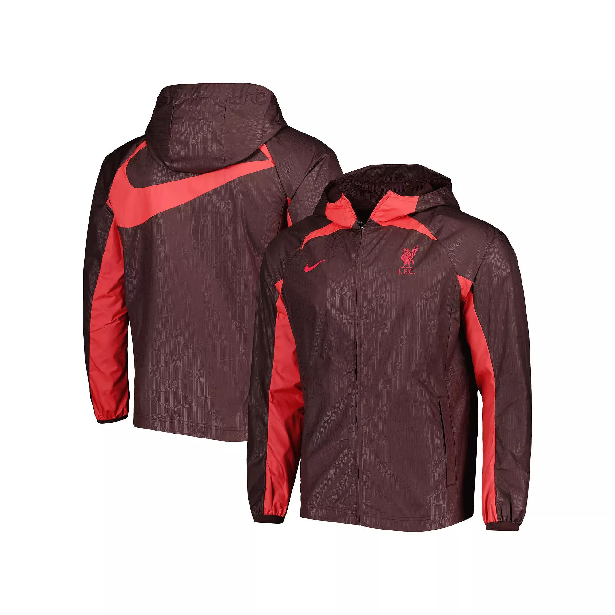 A LIGHTWEIGHT LAYER WITH TEAM PRIDE. The Liverpool FC AWF Jacket is a lightweight layer for days when you want to play through the rain, but don't want to be soaked with sweat. Signature crest and colors let everyone know who you support. This product is made with 100% recycled polyester fibers. Benefits: Lightweight fabric moves sweat away from your skin for quick evaporation, helping you stay dry and comfortable. Water-repellent finish helps keep you dry in wet weather. Front pockets let you store your essentials. Product Details: Standard fit for a relaxed, easy feel. Full-length zipper. 100% polyester. Machine wash. Imported. Style: DM2892; Color: Burgundy Crush/Siren Red/Siren Red; Size: XL; Gender: Male; Age Group: Adult | Nike Liverpool FC AWF Men's Soccer Jacket in Red, Size: XL | DM2892-652