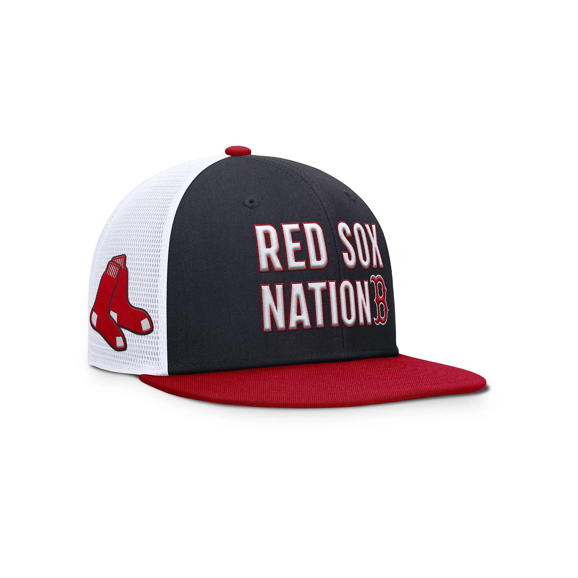 Celebrate the Boston Red Sox with this Pro Trucker Snapback Hat from Nike with a team slogan across the front and patch on the side. The mesh panels and snapback closure add classic finishes while the Dri-FIT fabric wicks away moisture. Stay cool in Boston Red Sox style with this must-have trucker hat.Celebrate the Boston Red Sox with this Pro Trucker Snapback Hat from Nike with a team slogan across the front and patch on the side. The mesh panels and snapback closure add classic finishes while the Dri-FIT fabric wicks away moisture. Stay cool in Boston Red Sox style with this must-have trucker hat.PRODUCT FEATURESSnapbackFlat billDri-FIT technology wicks away moistureWipe clean with a damp clothStructured fitImportedMesh mid and rear panelsEmbroidered graphics with raised detailsOfficially licensedHigh CrownOne size fits mostBrand: NikeSolid front panels with eyeletsMaterial: 100% Polyester - Crown & Visor; 100% Cotton - Undervisor Size: M/L. Color: Navy. Gender: male. Age Group: adult.