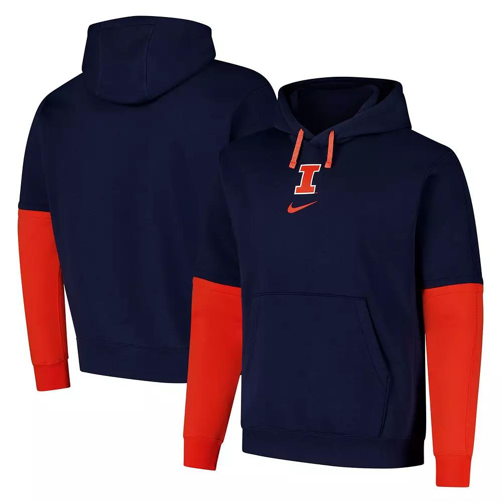 Gear up for the season in cozy comfort with this Illinois Fighting Illini Sideline Club Fleece Pullover Hoodie from Nike. This official piece of sideline outerwear features a fleece lining for added warmth, making it perfect for cheering on the Illinois Fighting Illini during those chilly game days. The embroidered team logo on the front proudly displays your allegiance.Gear up for the season in cozy comfort with this Illinois Fighting Illini Sideline Club Fleece Pullover Hoodie from Nike. This official piece of sideline outerwear features a fleece lining for added warmth, making it perfect for cheering on the Illinois Fighting Illini during those chilly game days. The embroidered team logo on the front proudly displays your allegiance.PRODUCT FEATURESOfficially licensedLong sleevePulloverMaterial: 80% Cotton/20% Polyester - Body; 100% Cotton - Hood LiningHoodedOne time removable sleeve with finished seamMachine wash with garment inside out, tumble dry lowMidweight hoodie suitable for moderate temperaturesBrand: NikeFront pouch pocketPrinted team logo at top center chestImportedSame outerwear worn by the players, coaches and team staffFleece lining provides added warmth Color: Navy. Gender: male. Age Group: adult.