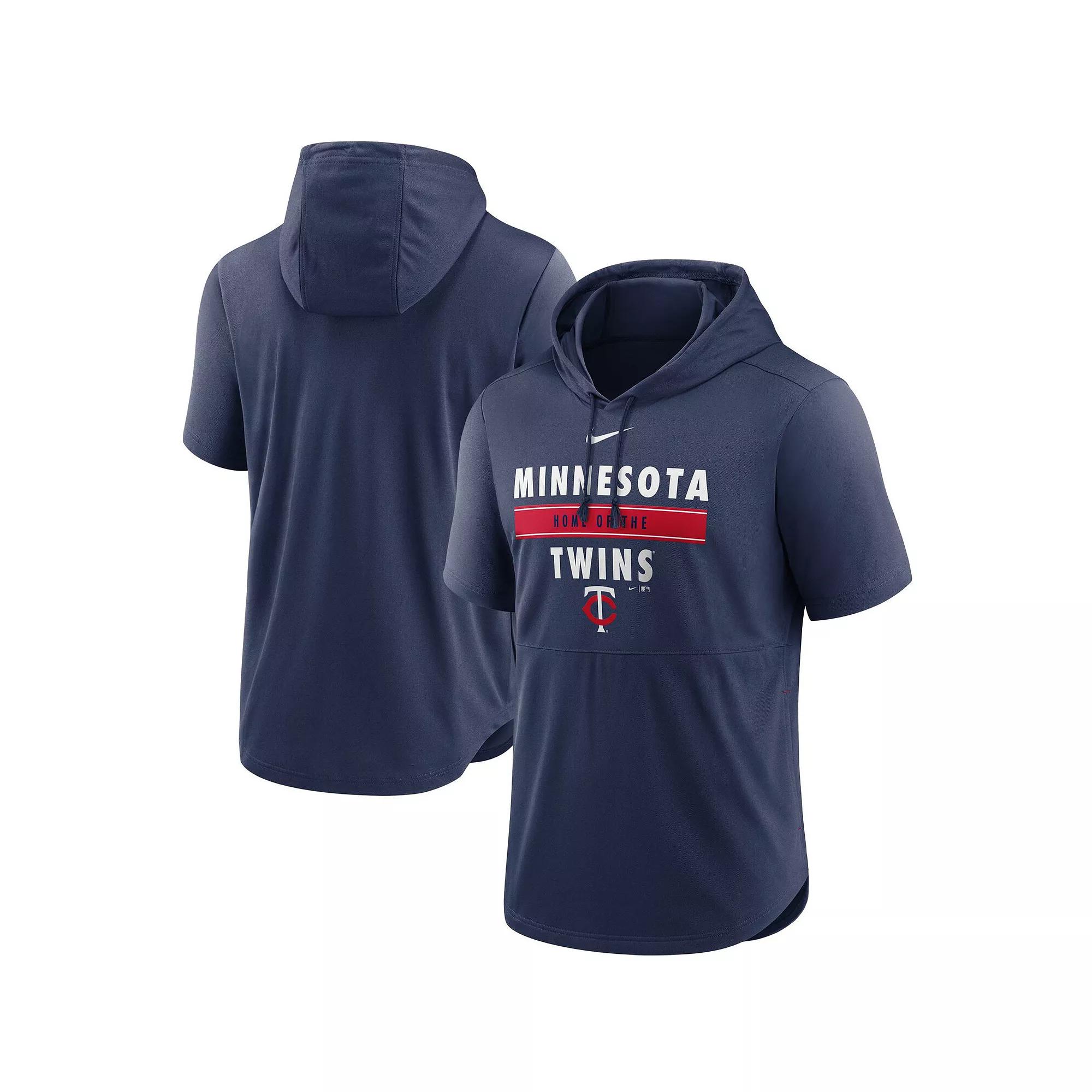Youre a dedicated Minnesota Twins fan through and through. Take your impressive collection of team gear to the next level with this Home Team Short Sleeve Hoodie Top from Nike. It has a stylish hood to put a twist on a classic tee and bold Minnesota Twins graphics to show off your unmatched devotion.Youre a dedicated Minnesota Twins fan through and through. Take your impressive collection of team gear to the next level with this Home Team Short Sleeve Hoodie Top from Nike. It has a stylish hood to put a twist on a classic tee and bold Minnesota Twins graphics to show off your unmatched devotion.PRODUCT FEATURESTagless CollarImportedOfficially licensedMachine wash, tumble dry lowShort sleeveDri-FIT technology wicks away moistureNike Dry fabrics move sweat from your skin for quicker evaporation helping you stay dry, comfortable and focused on the task at handRounded hem with side splitsLightweight for mild temperaturesScreen print graphicsPulloverMaterial: 100% PolyesterHood with drawstringsBrand: Nike Color: TWN NAVY. Gender: male. Age Group: adult. Material: COTTON.