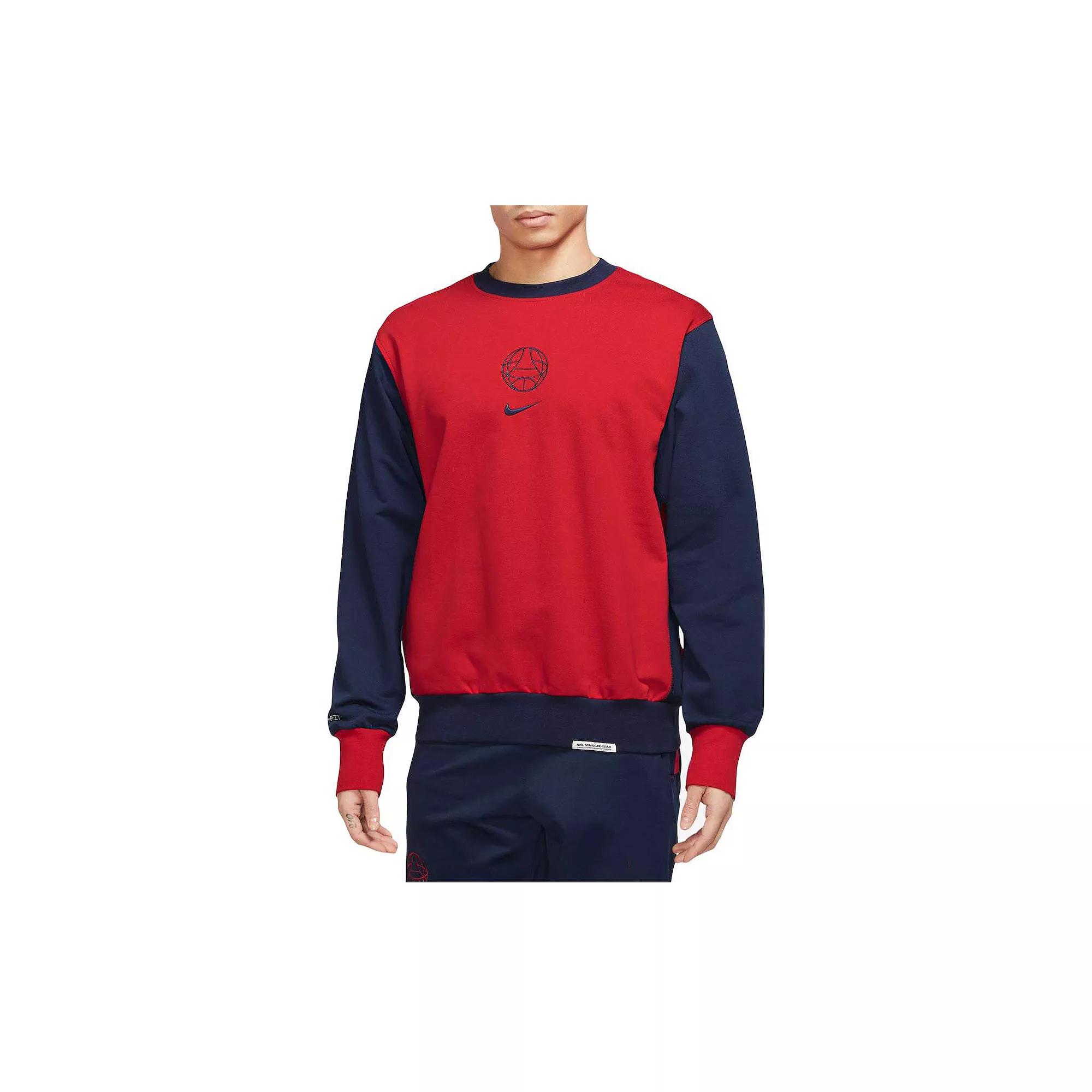 Whether you're training, traveling or keeping things casual, this sweatshirt shows your PSG pride while helping you stay comfortable with midweight French terry and sweat-wicking technology. Benefits: Nike Dri-FIT technology moves sweat away from your skin for quicker evaporation, helping you stay dry and comfortable. Ribbed cuffs and hem help keep this sweatshirt in place while you move. Product Details: Standard Issue tag at hem. Body: 61% cotton/39% polyester. Rib: 97% cotton/3% spandex. Machine wash. Imported. Style: DV5074; Color: University Red/Midnight Navy/Midnight Navy; Size: L; Gender: Male; Age Group: Adult | Paris Saint-Germain Men's Nike Soccer Graphic Crew-Neck Top in Red, Size: Large | DV5074-657
