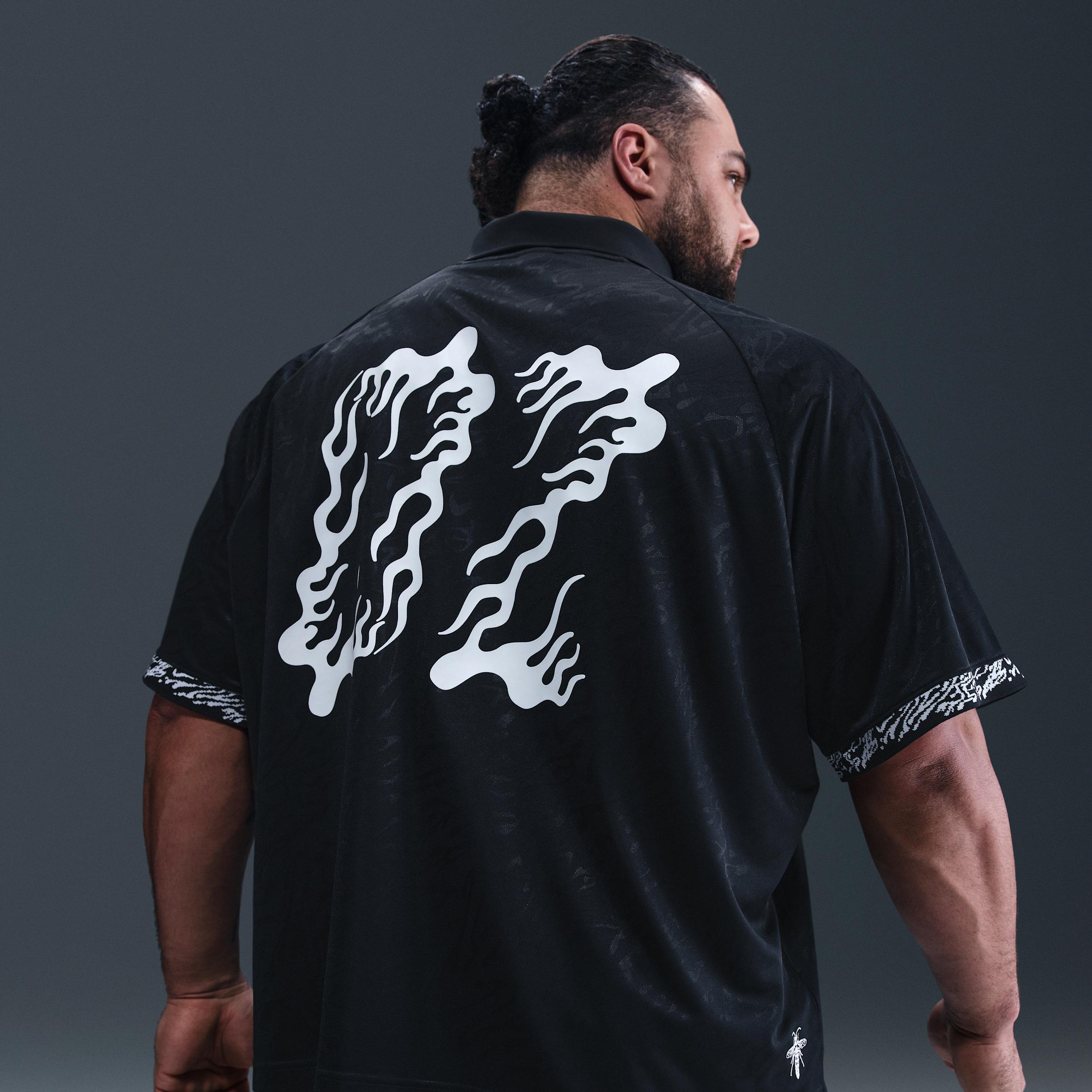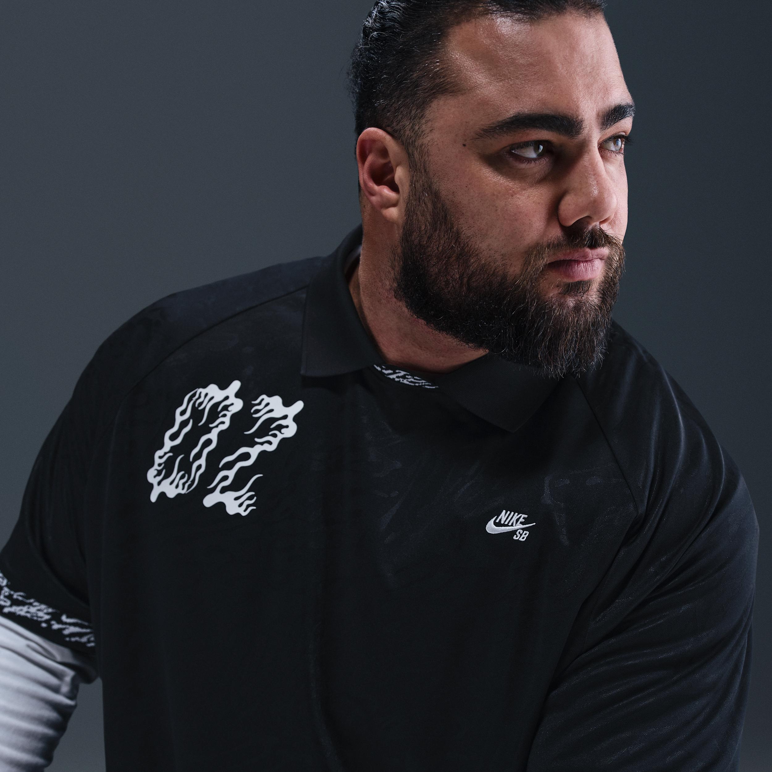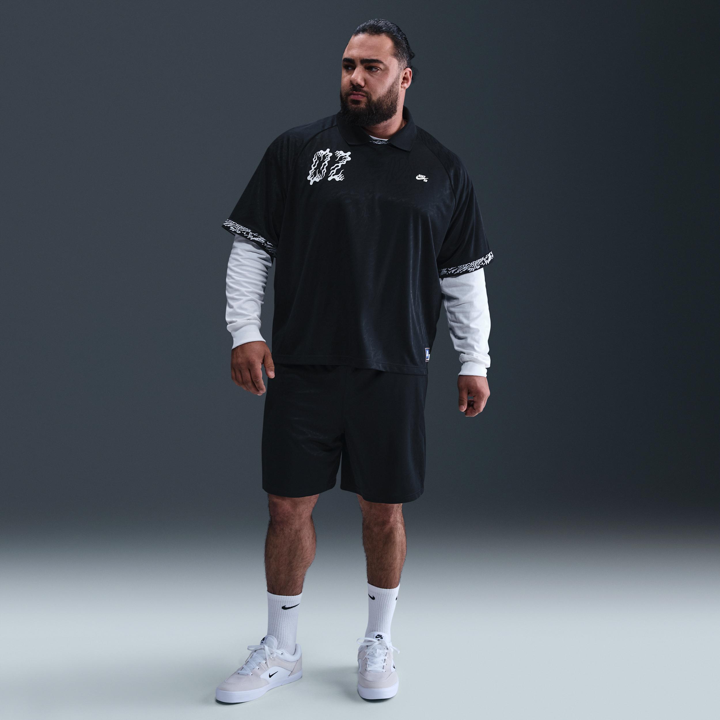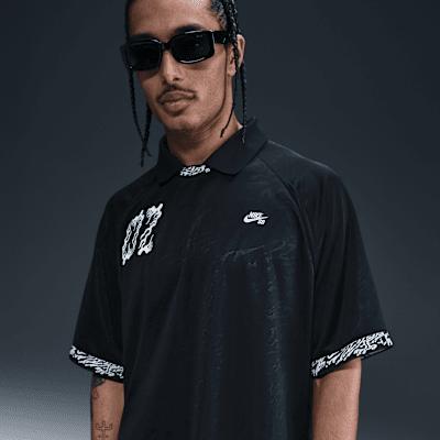 This soccer-inspired jersey features jacquard knit fabric and Dri-FIT technology for sweat-wicking comfort. The stretchy fabric and extra spacious fit help make movement a breeze. Benefits:Nike Dri-FIT technology moves sweat away from your skin for quicker evaporation, helping you stay dry and comfortable. Jacquard knit fabric has knit-in graphics for a premium look that lasts. The oversized fit has extra space through the body. Product Details:Embroidered fly logo. Nike SB Drip Font 02 graphic. Woven jock tag states engineered to the not so exact specifications of nike skateboarding.. 100% polyester. Machine wash. Imported. Style: HJ2965; Color: Black/Black/White; Size: M; Gender: Male; Age Group: Adult | Nike SB Dri-FIT Jacquard Skate Jersey in Black, Size: Medium | HJ2965-010