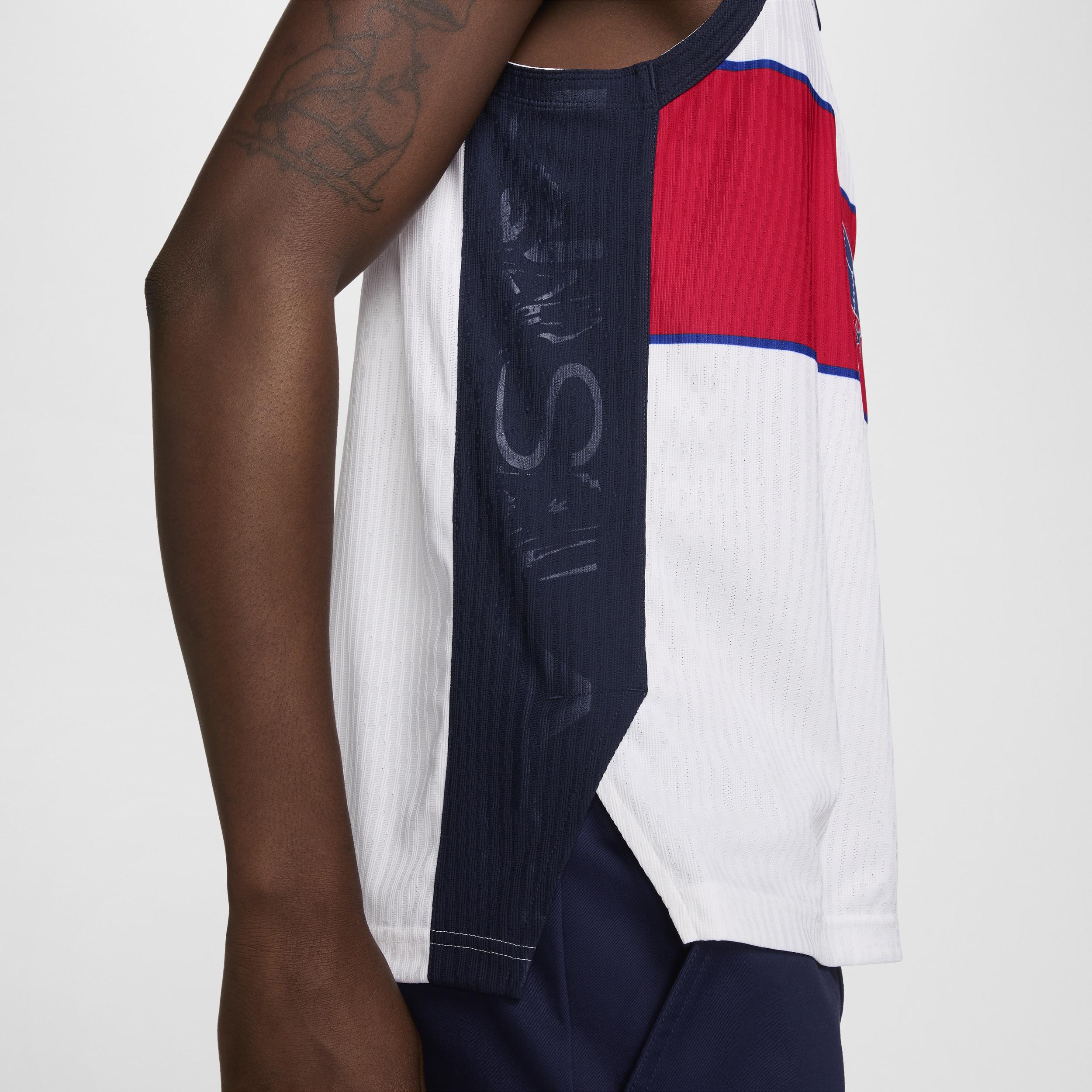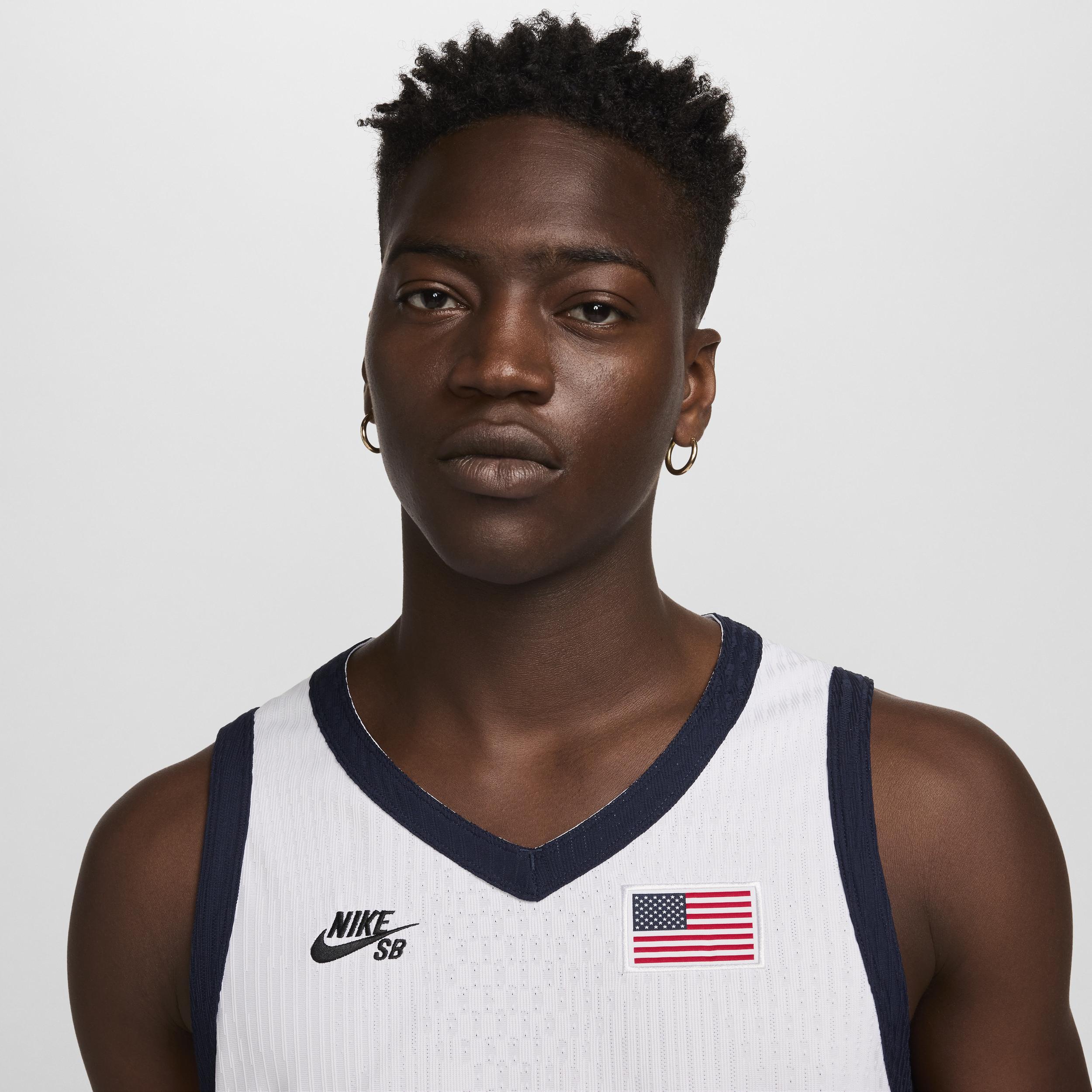Pull on this jersey and start your next skate sesh supporting Team USA. Inspired by basketball uniforms, its built to help you stay cool while you move, whether youre backside flipping a 6-stair, or jumping off the couch when your favorite skater clinches victory. Woven and embroidered graphics let you support Team USA on sports biggest stage. Work up a Sweat:Nike Dri-FIT ADV levels up our sweat-wicking technology with advanced cooling and zones of breathability to help you stay dry and comfortable. Artist Inspiration:A jazz-playing eagle patch signifies the creativity, personal expression and improvisation skateboarding shares with jazz. Details Tell the Story:The collar features Jacquard knit Roman numeral graphics while the sleeves have USA on the right and SKATE on the left. Make it Yours:The jersey features a customizable jock tag. Write your name or a message to add a personal touch. More Benefits:Designed to feel relaxed through the chest and body for an athletic fit you can layer. Product Details:100% polyester. Machine wash. Imported. Style: FZ4073; Color: White/Sport Red/Obsidian/Black; Size: S; Gender: Male; Age Group: Adult | Nike SB USA Mens Dri-FIT ADV Sleeveless Skate Jersey in White, Size: Small | FZ4073-100