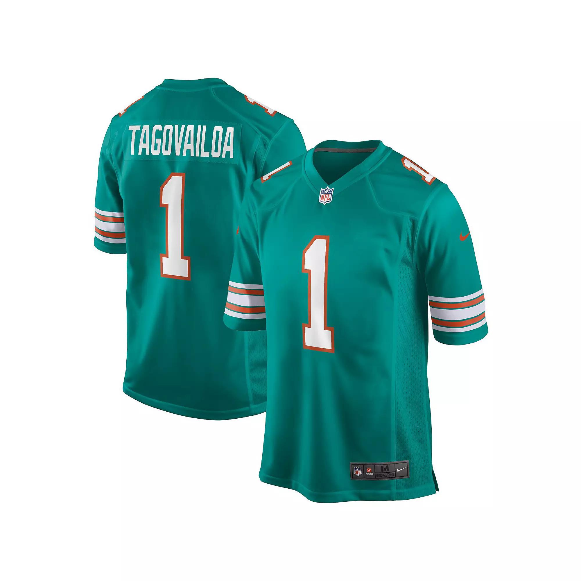 Rep your team and favorite player with the NFL Miami Dolphins Jersey. Breathable ventilation and a loose, roomy fit help keep you comfortable on game day. Benefits: Screen-printed name, number and team mark offer lightweight durability. Ventilation over major heat zones helps keep you cool. Product Details: Loose fit for a roomy feel. NFL shield at V-neck. Tagless neck label. Woven jock tag. 100% polyester. Machine wash. Imported. Style: 67NMMDGA9PF; Color: Turbo Green; Size: XL; Gender: Male; Age Group: Adult | Nike NFL Miami Dolphins (Tua Tagovailoa) Men's Game Football Jersey in Green, Size: XL | 67NMMDGA9PF-2KE
