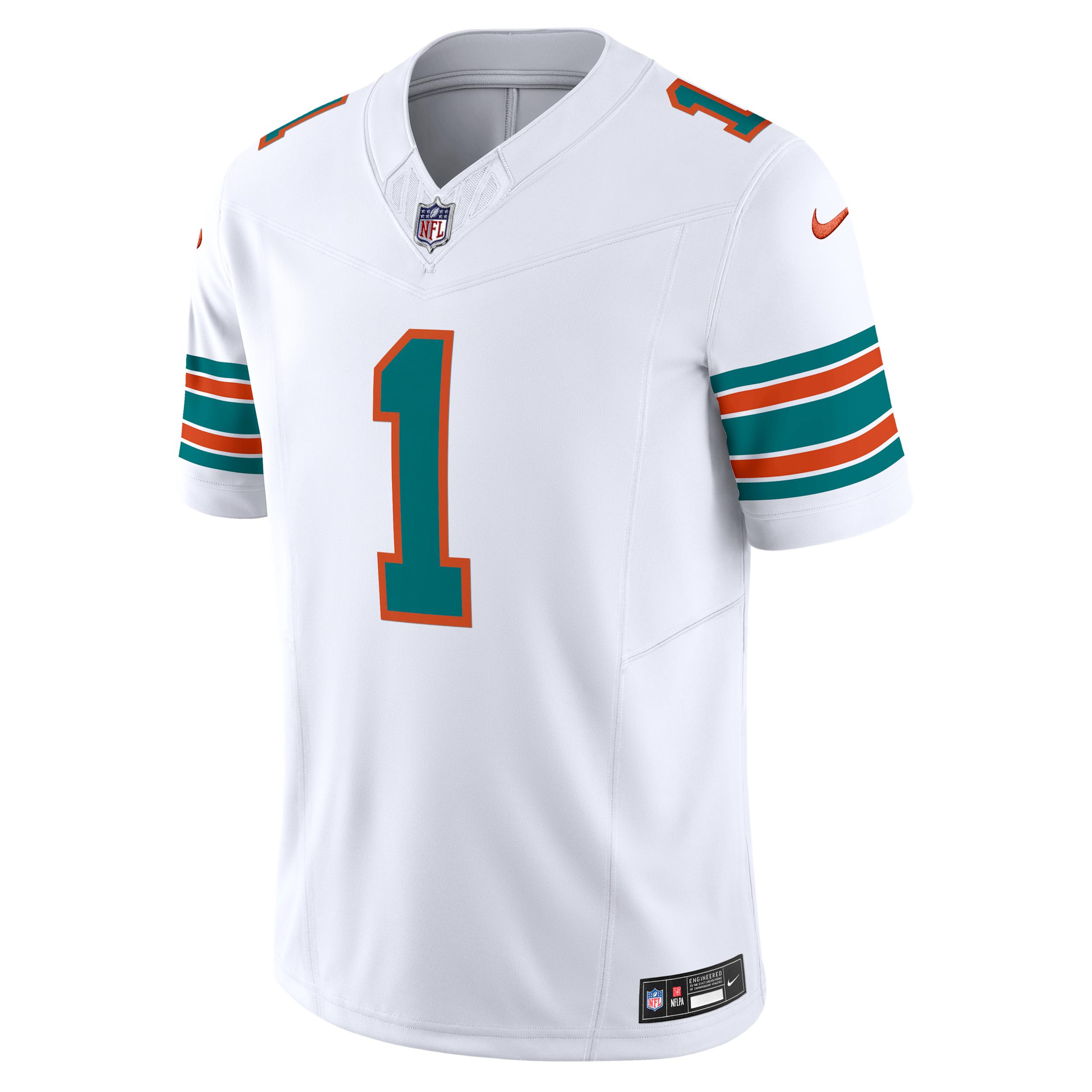 This Tua Tagovailoa Jersey delivers an authentic touch on game day with official team details and a tribute to your favorite player. Sweat-wicking technology helps provide consistent comfort as you rep the Miami Dolphins. Benefits: Nike Dri-FIT technology helps you stay dry, comfortable and focused. Vapor F.U.S.E. chassis helps deliver an authentic look and feel on game day. Product Details: Standard fit for a relaxed, easy feel. Metallic-effect NFL shield at V-neck. Tagless neck label. Woven jock tag. 100% polyester. Machine wash. Imported. Style: 31NMDL2A9PF; Color: White; Size: L; Gender: Male; Age Group: Adult | Tua Tagovailoa Miami Dolphins Men's Nike Dri-FIT NFL Limited Football Jersey in White, Size: Large | 31NMDL2A9PF-ZZ0