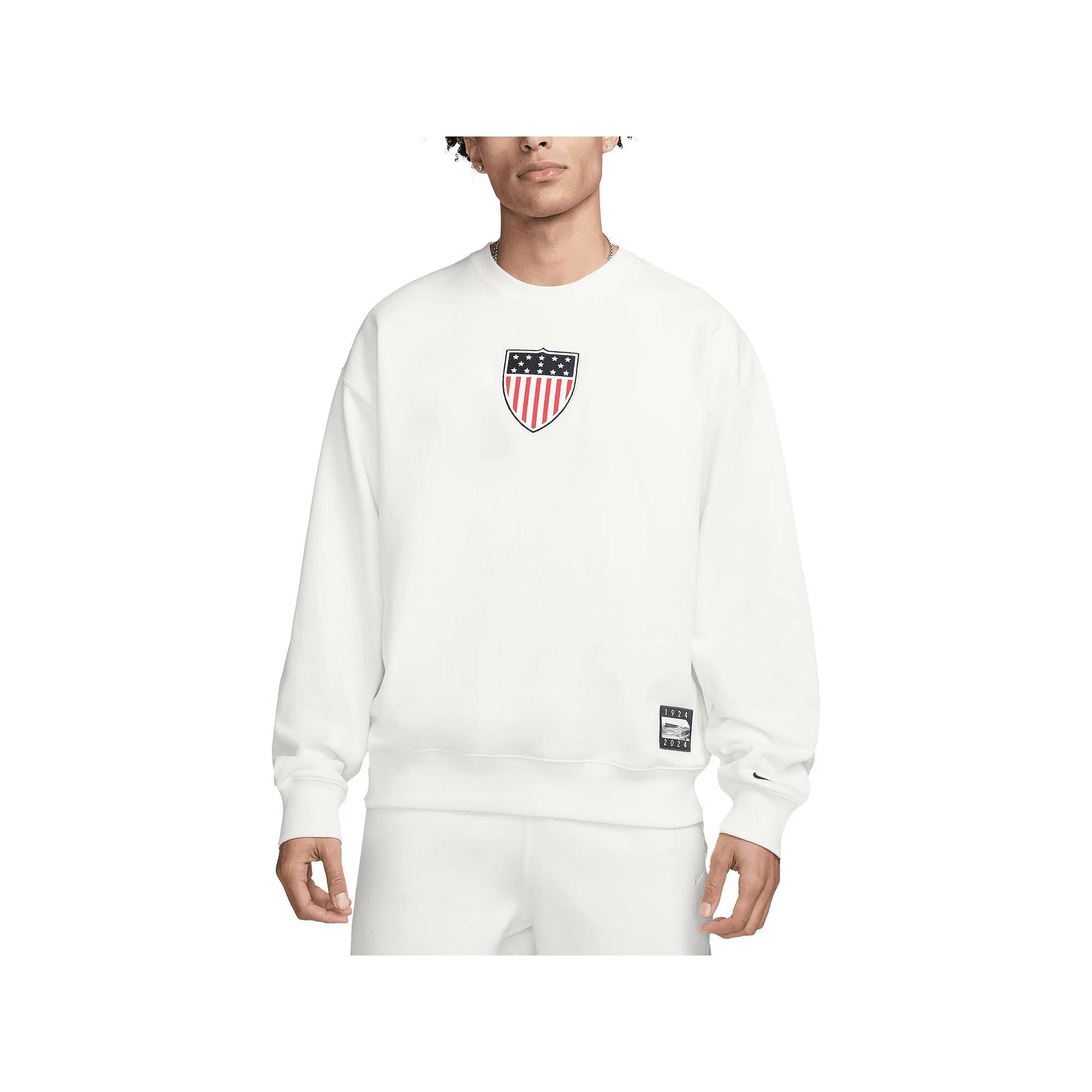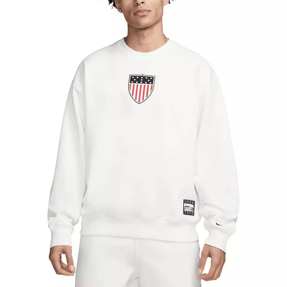 Stand with your country in this Team USA sweatshirt. Smooth on the outside and plush on the inside, our heavyweight brushed fleece helps keep you supremely cozy with thick, structured fabric for a premium look. And the relaxed fit through the shoulders, chest and body gives you the extra room you need for those celebration dances. Product Details:88% cotton/12% polyester. Machine wash. Imported. Style: FN1136; Color: Sail/Dark Obsidian; Size: 2XL; Gender: Male; Age Group: Adult | Team USA Solo Swoosh Mens Nike Crew-Neck Sweatshirt in White, Size: 2XL | FN1136-133