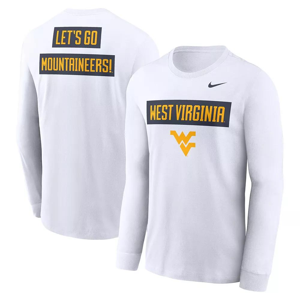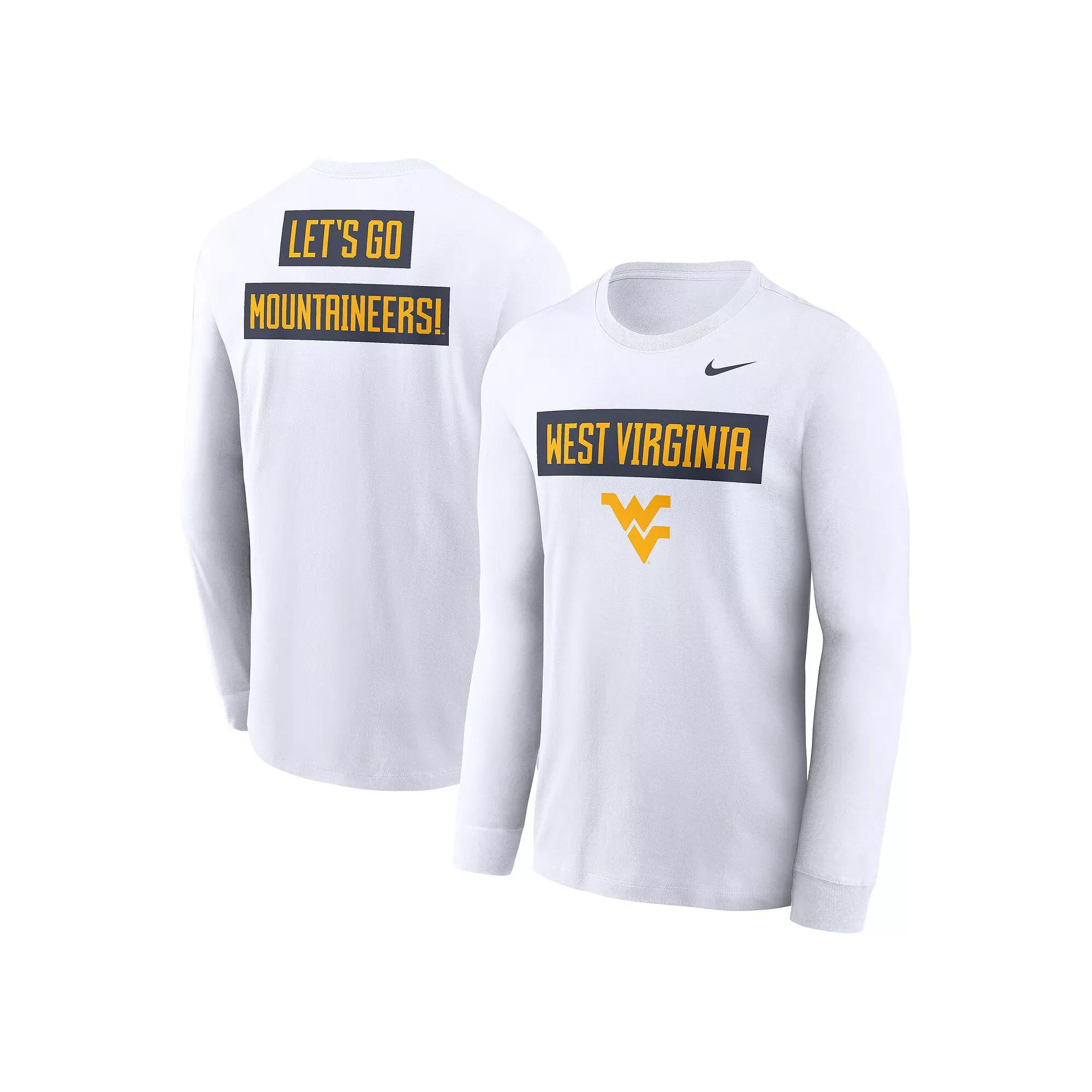 Show off your West Virginia Mountaineers fandom with this Two-Hit Classic Location Long Sleeve T-Shirt by Nike. Its printed team name and logo ensure there's no mistaking your collegiate loyalty. Made from soft, breathable cotton fabric, this West Virginia Mountaineers tee keeps you comfortable all game day.Show off your West Virginia Mountaineers fandom with this Two-Hit Classic Location Long Sleeve T-Shirt by Nike. Its printed team name and logo ensure there's no mistaking your collegiate loyalty. Made from soft, breathable cotton fabric, this West Virginia Mountaineers tee keeps you comfortable all game day.PRODUCT FEATURESOfficially licensedScreen print graphicsMachine wash, tumble dry lowImportedTeam details printed on the front and backMaterial: 100% CottonBrand: NikeCrew neckLong sleeve Color: White. Gender: male. Age Group: adult.