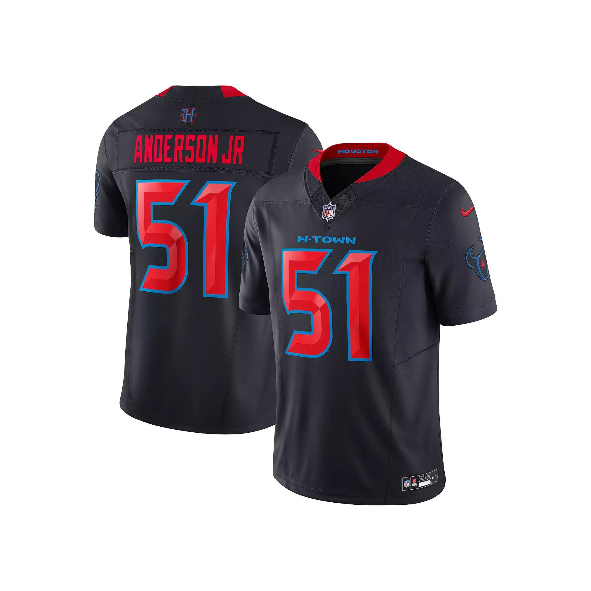 This Will Anderson Jr. Jersey delivers an authentic touch on game day with official team details and a tribute to your favorite player. Sweat-wicking technology helps provide consistent comfort as you rep the Houston Texans. Benefits:Nike Dri-FIT technology helps you stay dry, comfortable and focused. Vapor F.U.S.E. chassis helps deliver an authentic look and feel on game day. Product Details:Standard fit for a relaxed, easy feel. Metallic-effect NFL shield at V-neck. Tagless neck label. Woven jock tag. 100% polyester. Machine wash. Imported. Style: 31NM0B9H9HF; Color: Blue; Size: 2XL; Gender: Male; Age Group: Adult | Will Anderson Jr. Houston Texans Men's Nike Dri-FIT NFL Limited Football Jersey in Blue, Size: 2XL | 31NM0B9H9HF-JN1