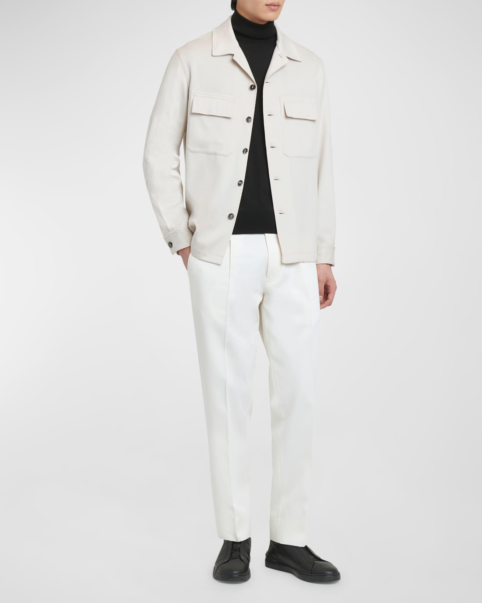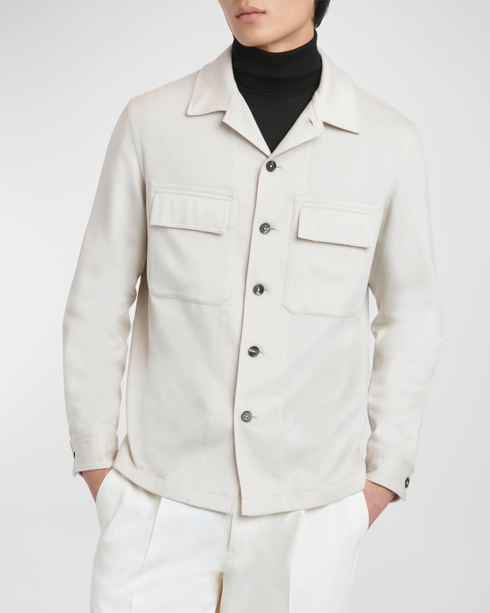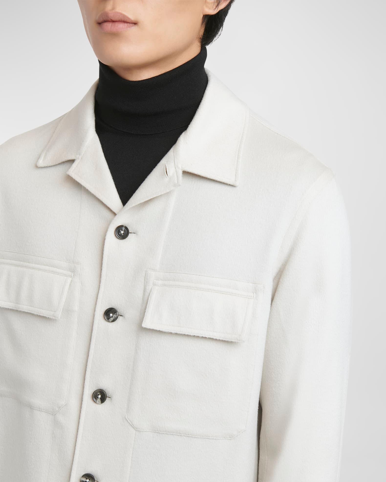 ZEGNA overshirt from the Oasi Cashmere collection crafted from cashmere of uncompromising quality and softness Point collar Button front Chest flap pockets Long sleeves Single-button cuffs Reinforced elbows Vented sides Cashmere/leather Lining: Polyester Dry clean Made in Italy Model is 6'1"/185cm.