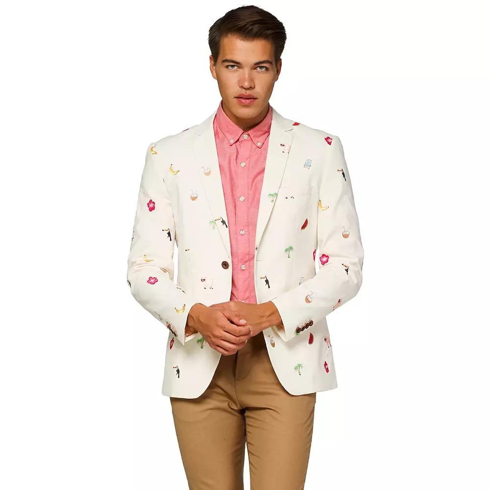 Make a bold statement in this mens OppoSuits blazer. Make a bold statement in this mens OppoSuits blazer. Button front 4-pocket Long sleevesFIT & SIZING Modern fitFABRIC & CARE Polyester, rayon, spandex, cotton, linen, wool Machine wash - delicate Imported Size: 46 - Regular. Color: Beige. Gender: male. Age Group: adult.