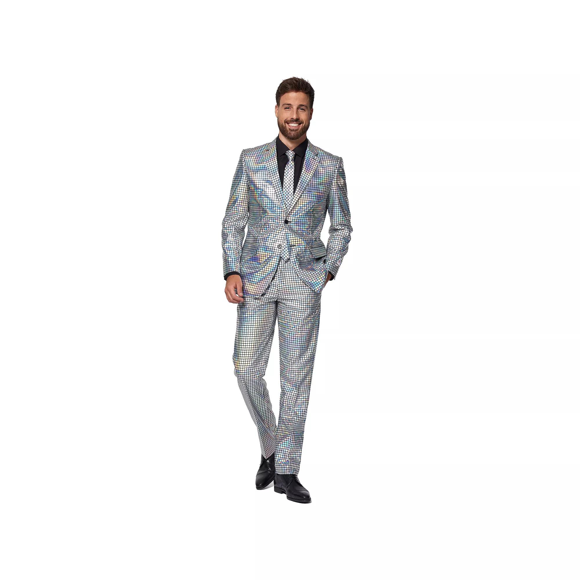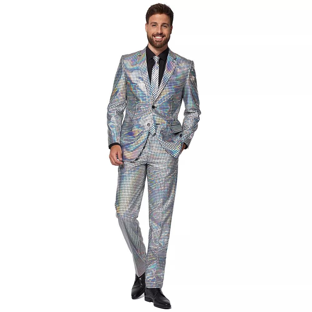 Show off your best dance-floor moves in this men's Discoballer novelty suit and tie set from OppoSuits. Includes: suit jacket, pants & matching tie Jacket: padded shoulders, notched lapels, 2-button front, 5-pocket, long sleeves, regular-length jacket fits those between 5'8" and 5'11" tall Pants: flat front, 4 pockets, zipper fly with hook & button closure, 9.8-inch front rise, 13.75-inch leg opening, 33.5-inch inseam Extra length for tailoringFIT & SIZING Slim fit features high arm holes, slightly narrow straight body and tapered leg openings When in doubt between two sizes, we recommend you pick the larger of the twoFABRIC & CARE Polyester Machine wash or dry clean Imported Size: 46 - Regular. Gender: male. Age Group: adult. Pattern: Pattern.
