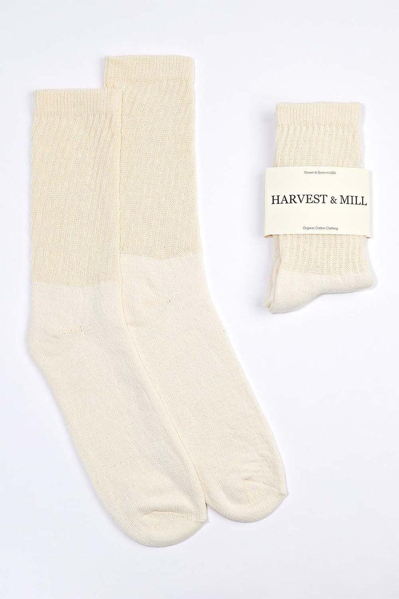 These socks are made from natural-white organic cotton. There are no dyes or bleaches used on these socks. Natural-white cotton is creamier in tone than stark bleached white. Crew socks reach your mid-calf. 6 pairs included.