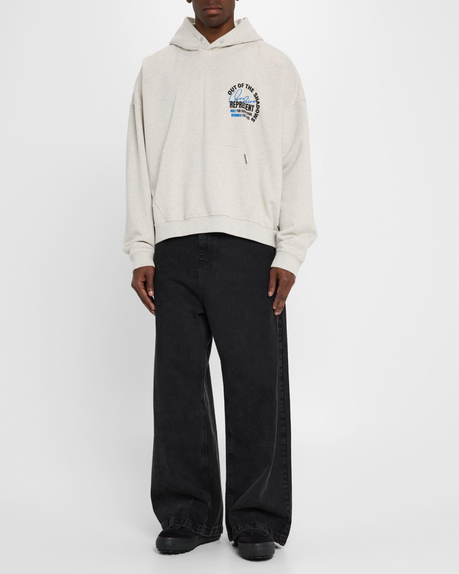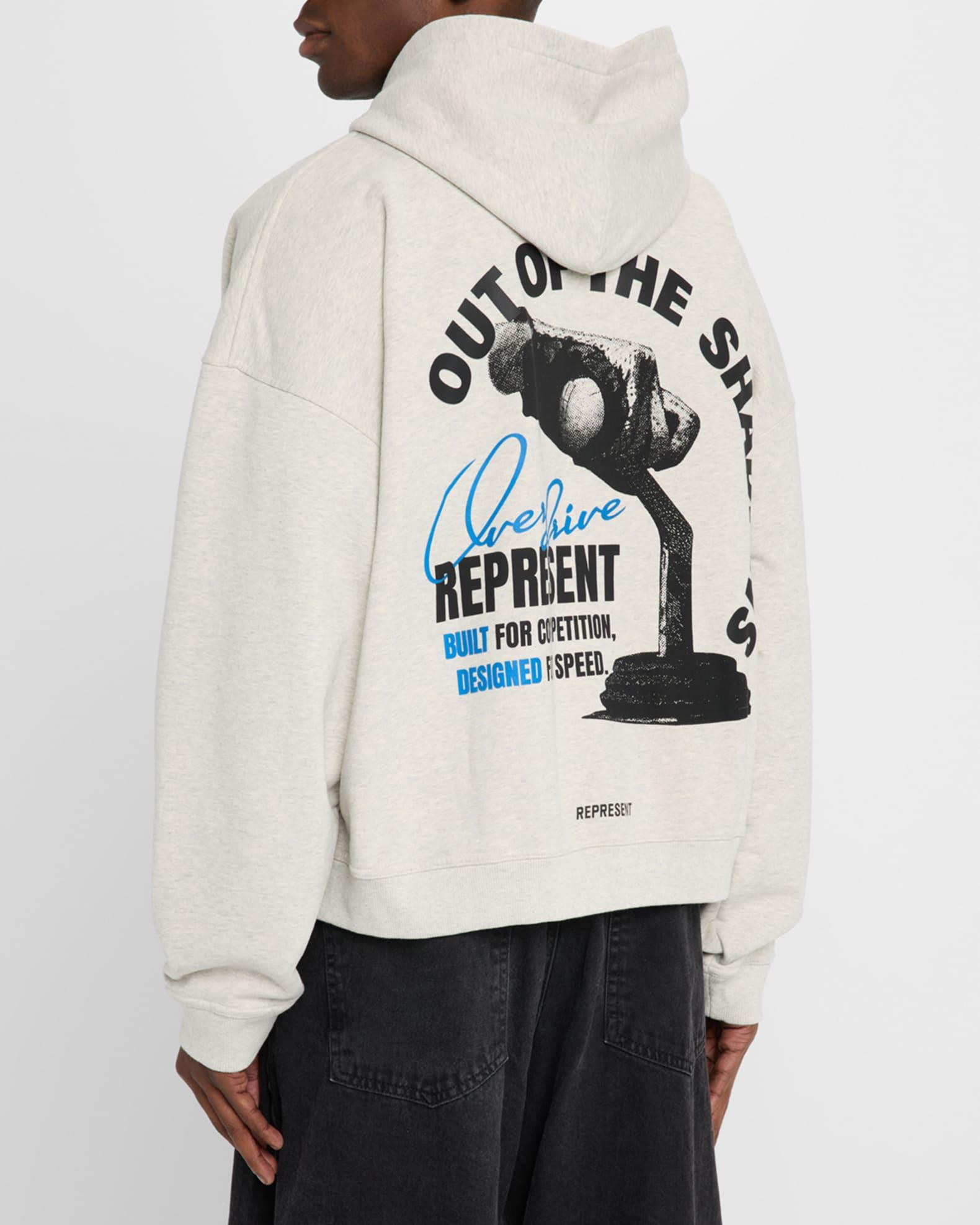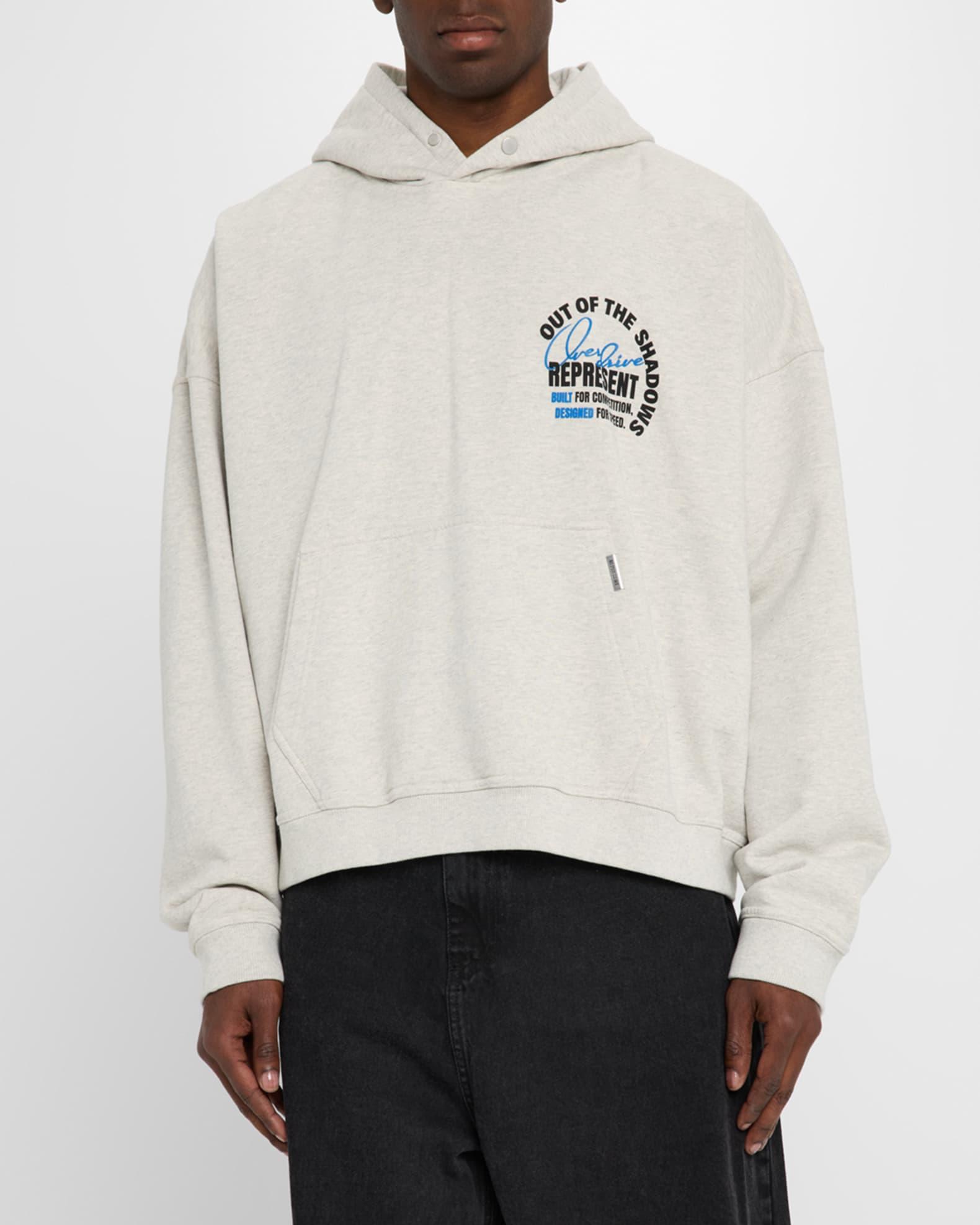 REPRESENT hoodie made from heavyweight jersey with a soft, premium feel Approx. 25.7L from shoulder to hem Out of the Shadows graphic prints on chest and back Popper detail on hood Kangaroo pocket with metal bar logo Long sleeve; approx. 22.6L Oversized fit Pullover style Cotton Made in Portugal