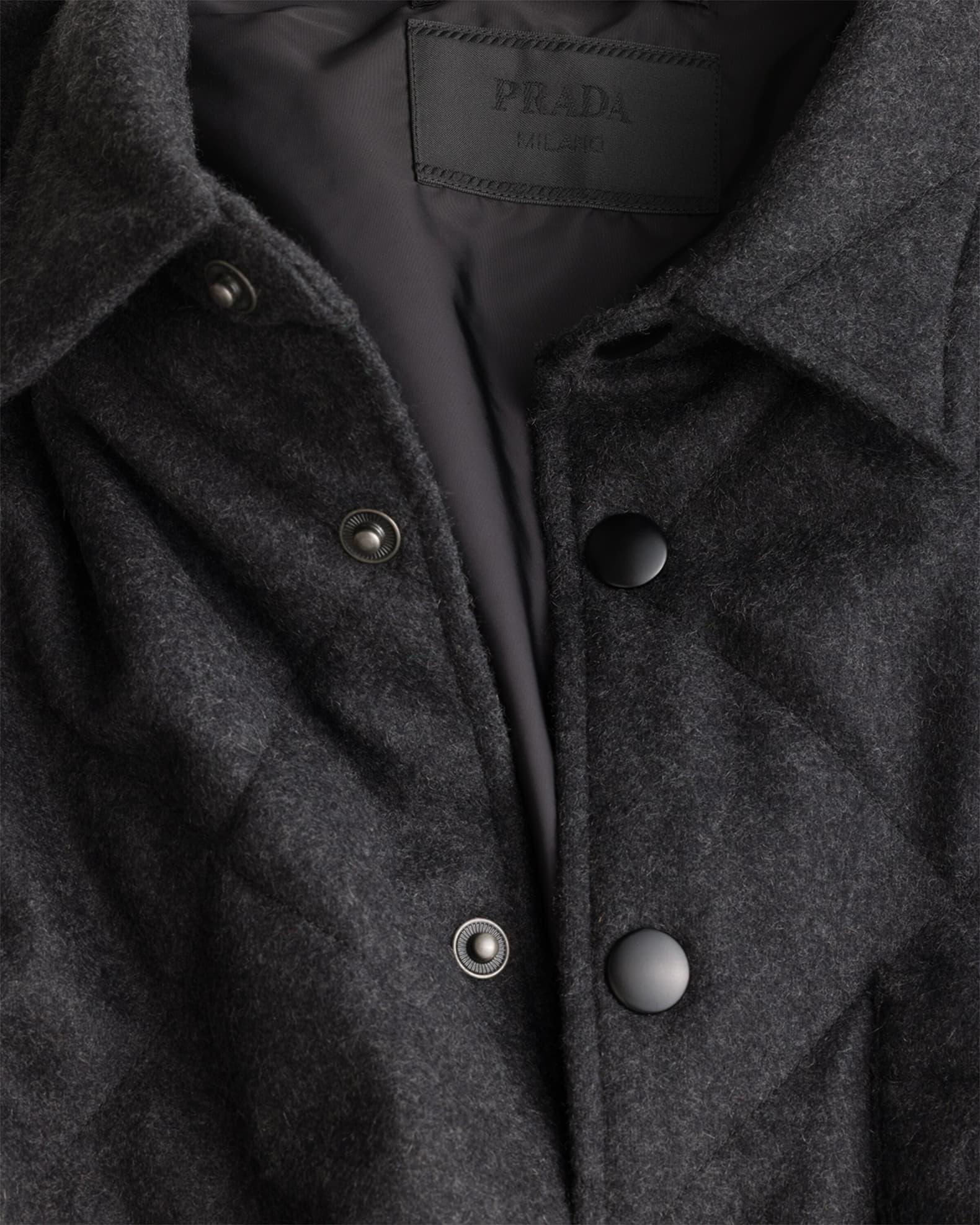 Crafted from padded cashmere, this refined Prada shirt jacket features a straight cut and enameled metal triangle logo Approx. 28.34"L from shoulder to hem Classic collar Long sleeves with snap cuffs Front patch pocket Straight fit Snap front closure Cashmere Made in Italy