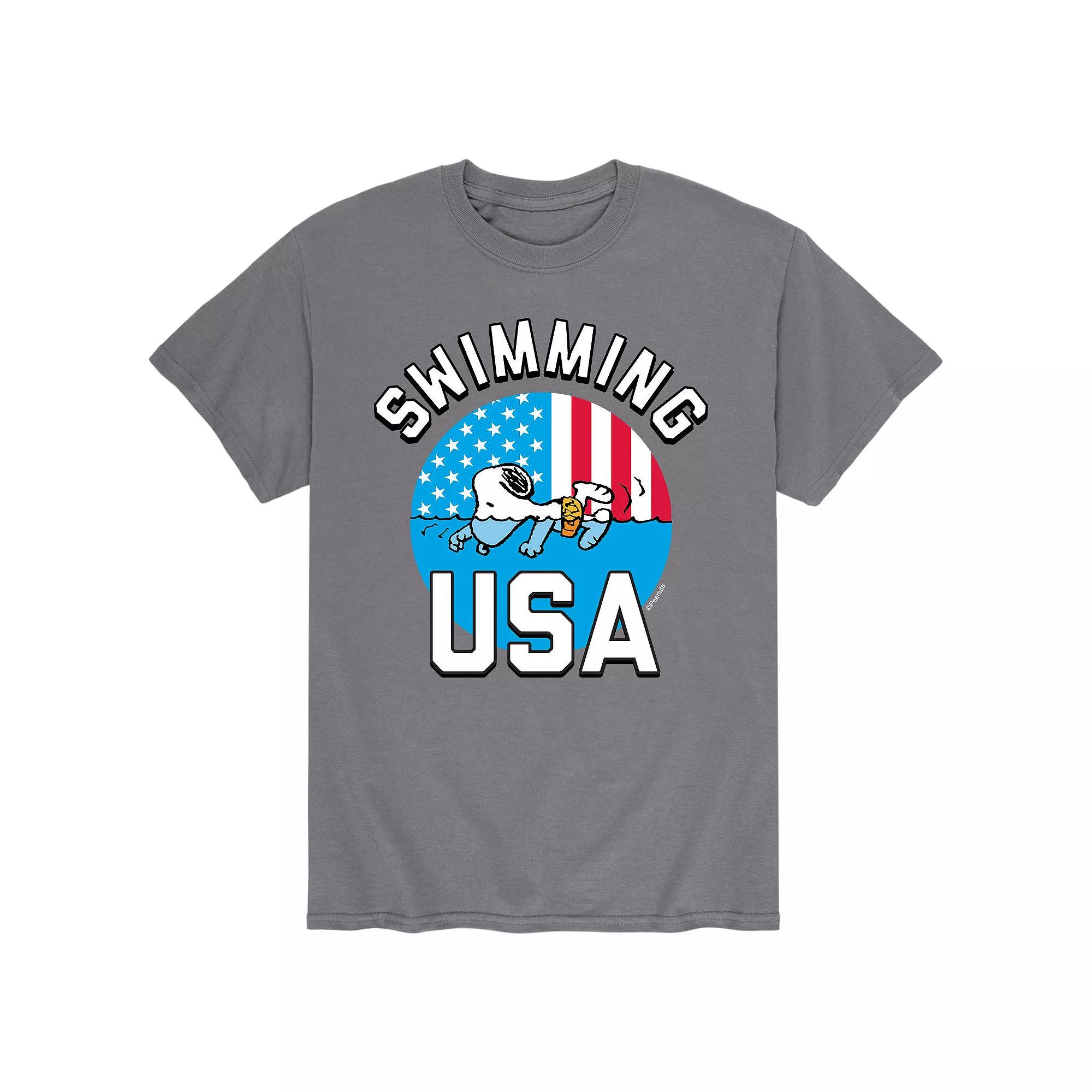 Complete your casual look with this mens Peanuts Snoopy Swimming USA tee. Complete your casual look with this mens Peanuts Snoopy Swimming USA tee. Crewneck Short sleevesFABRIC & CARE Solid colors: cotton Heather colors: cotton, polyester Machine wash Imported Color: Grey. Gender: male. Age Group: adult.