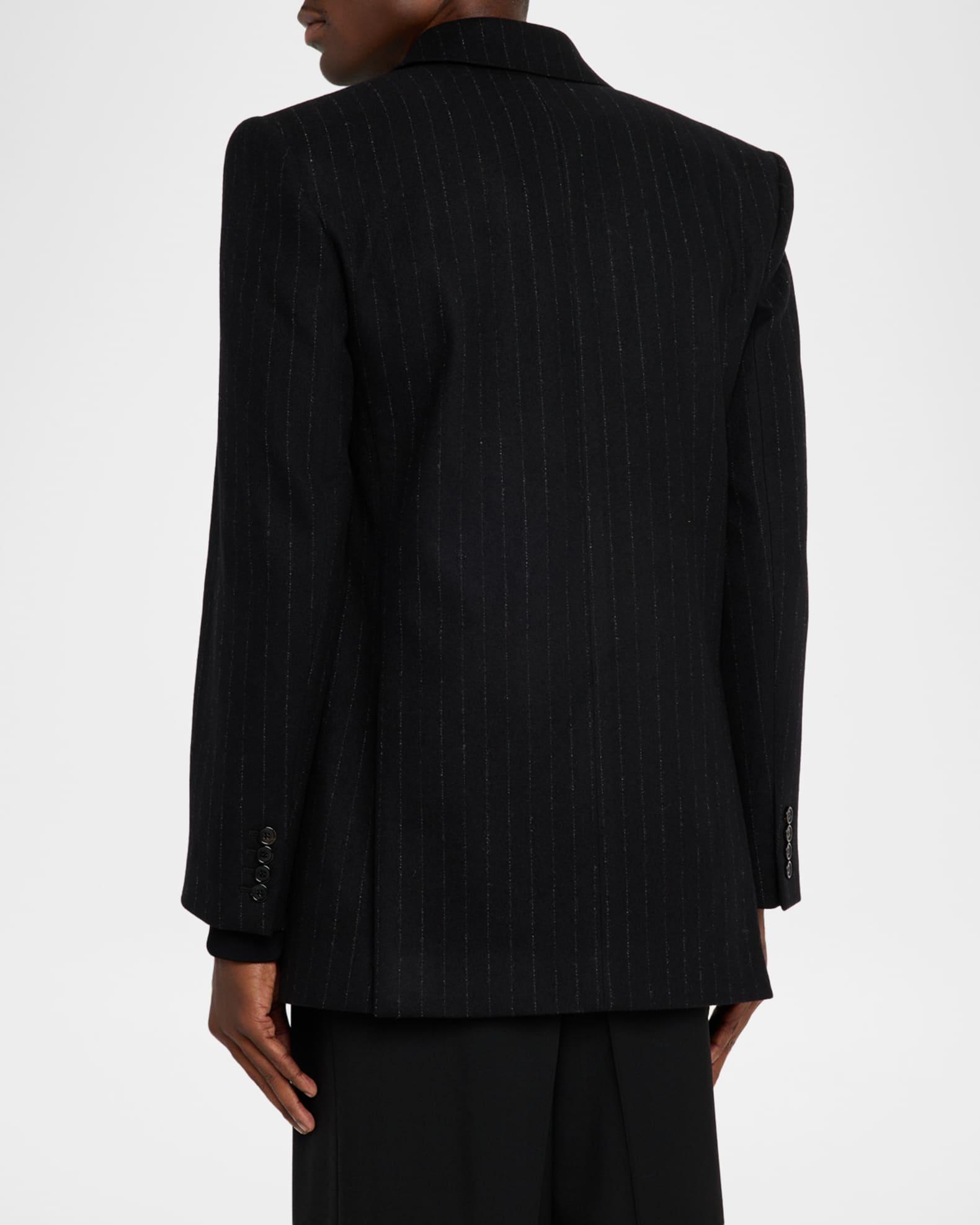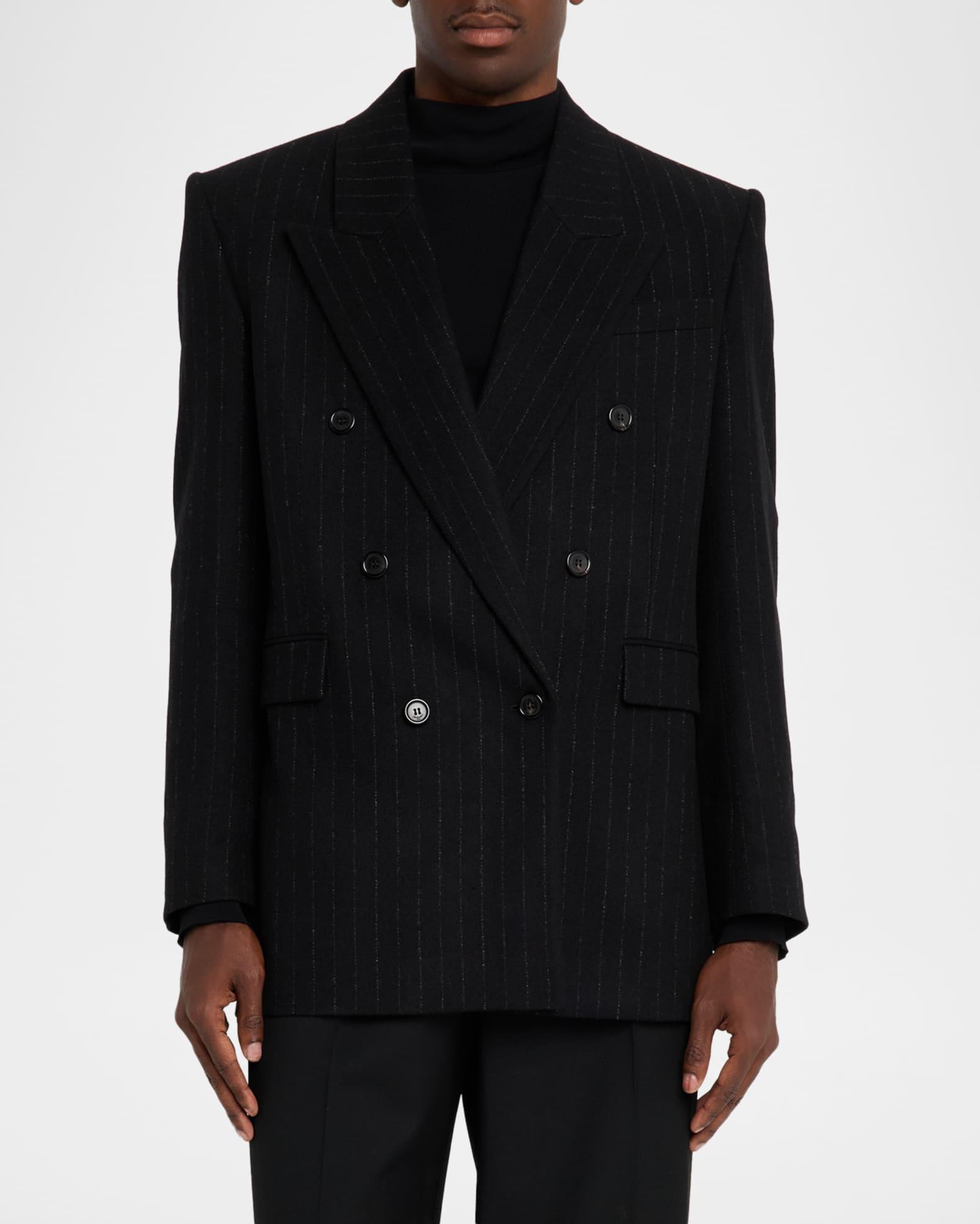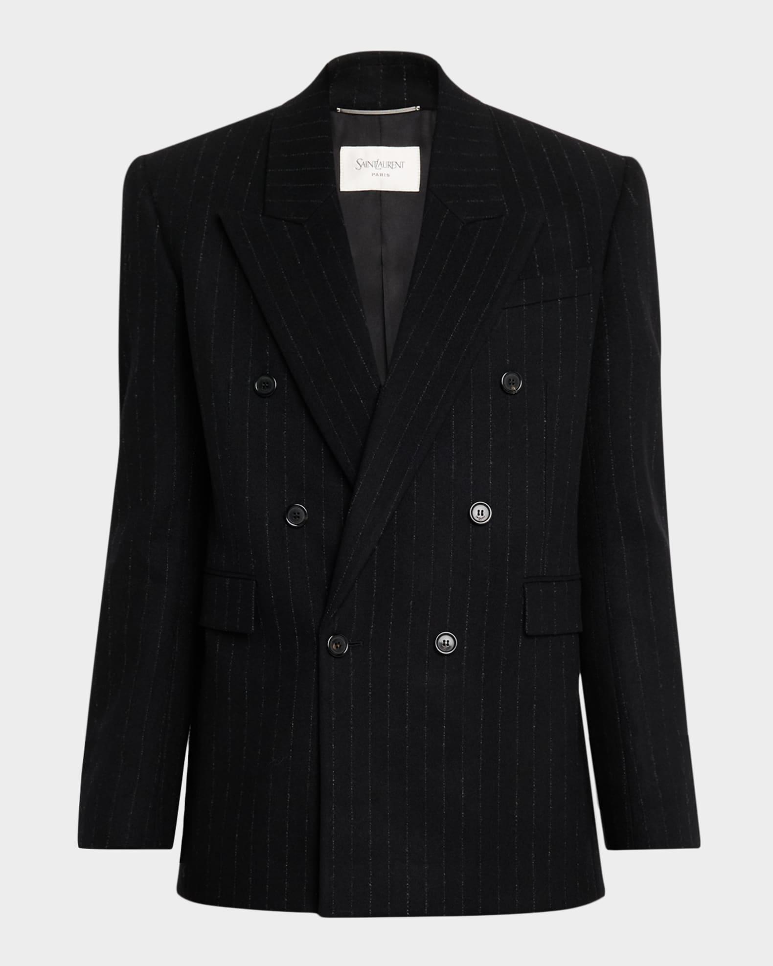 This structured Saint Laurent sport jacket is crafted in a refined wool and cashmere blend with subtle pinstripes Peak lapels Double-breasted front Chest welt pocket Hip flap pockets Structured shoulders Four-button cuffs Double-vented back Wool/cashmere Made in Italy