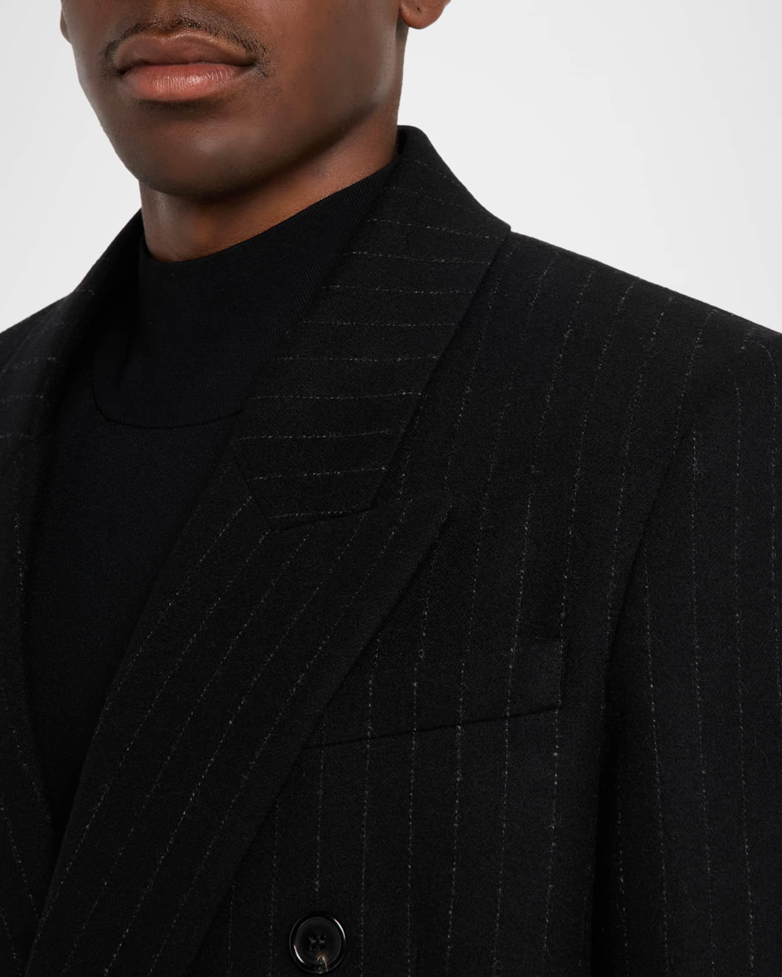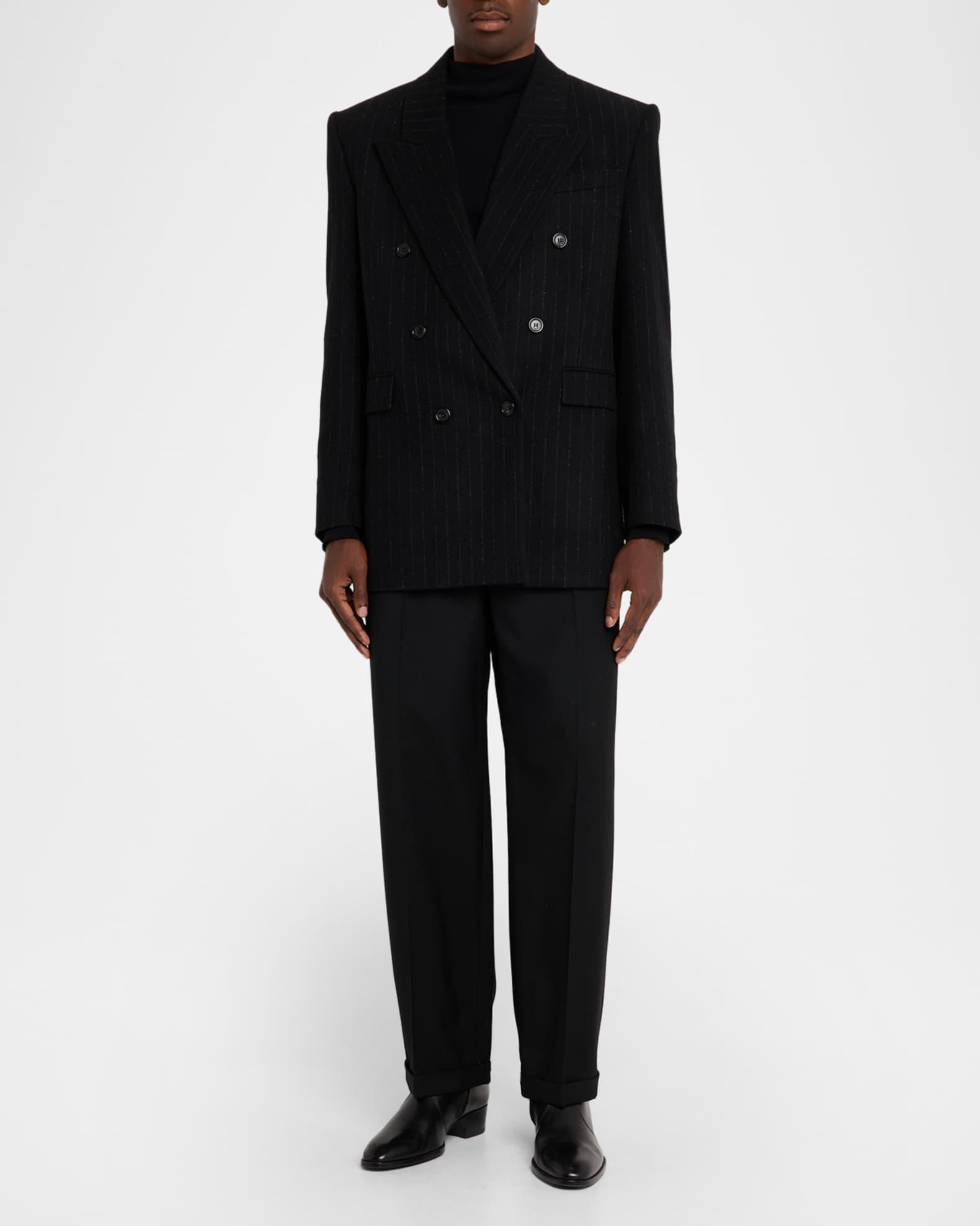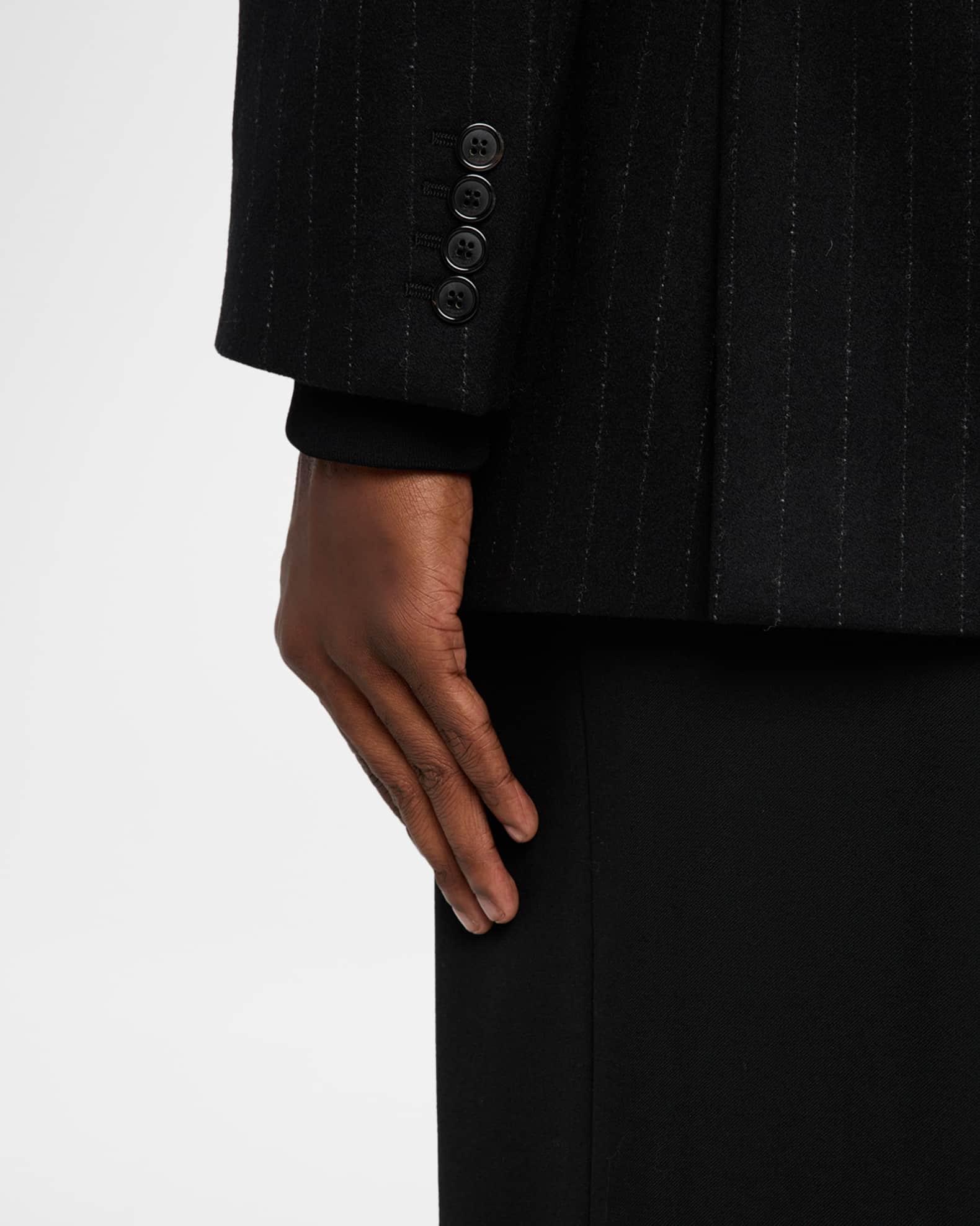 This structured Saint Laurent sport jacket is crafted in a refined wool and cashmere blend with subtle pinstripes Peak lapels Double-breasted front Chest welt pocket Hip flap pockets Structured shoulders Four-button cuffs Double-vented back Wool/cashmere Made in Italy