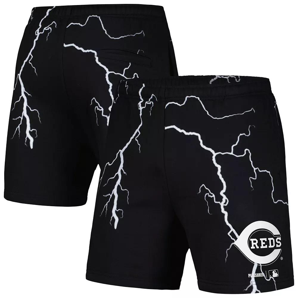 Add an electric piece of Cincinnati Reds gear to your game day rotation by picking up these Lightning Shorts. An exclusive collaboration from PLEASURES x MLB, It features a team and MLB logo along with a striking design of lightning bolts across the front and back. The elastic waistband ensures the perfect fit, while its two side pockets keep your valuables safe while you enjoy your favorite game.Add an electric piece of Cincinnati Reds gear to your game day rotation by picking up these Lightning Shorts. An exclusive collaboration from PLEASURES x MLB, It features a team and MLB logo along with a striking design of lightning bolts across the front and back. The elastic waistband ensures the perfect fit, while its two side pockets keep your valuables safe while you enjoy your favorite game.PRODUCT FEATURESMachine wash, tumble dry lowOfficially licensedHeat-sealed graphicsInseam on size M measure approx. 5.5Two side pocketsMaterial: 50% Cotton/50% PolyesterImportedOne rear pocketSublimated designElastic waistband with drawstringBrand: PLEASURES Color: Black. Gender: male. Age Group: adult.