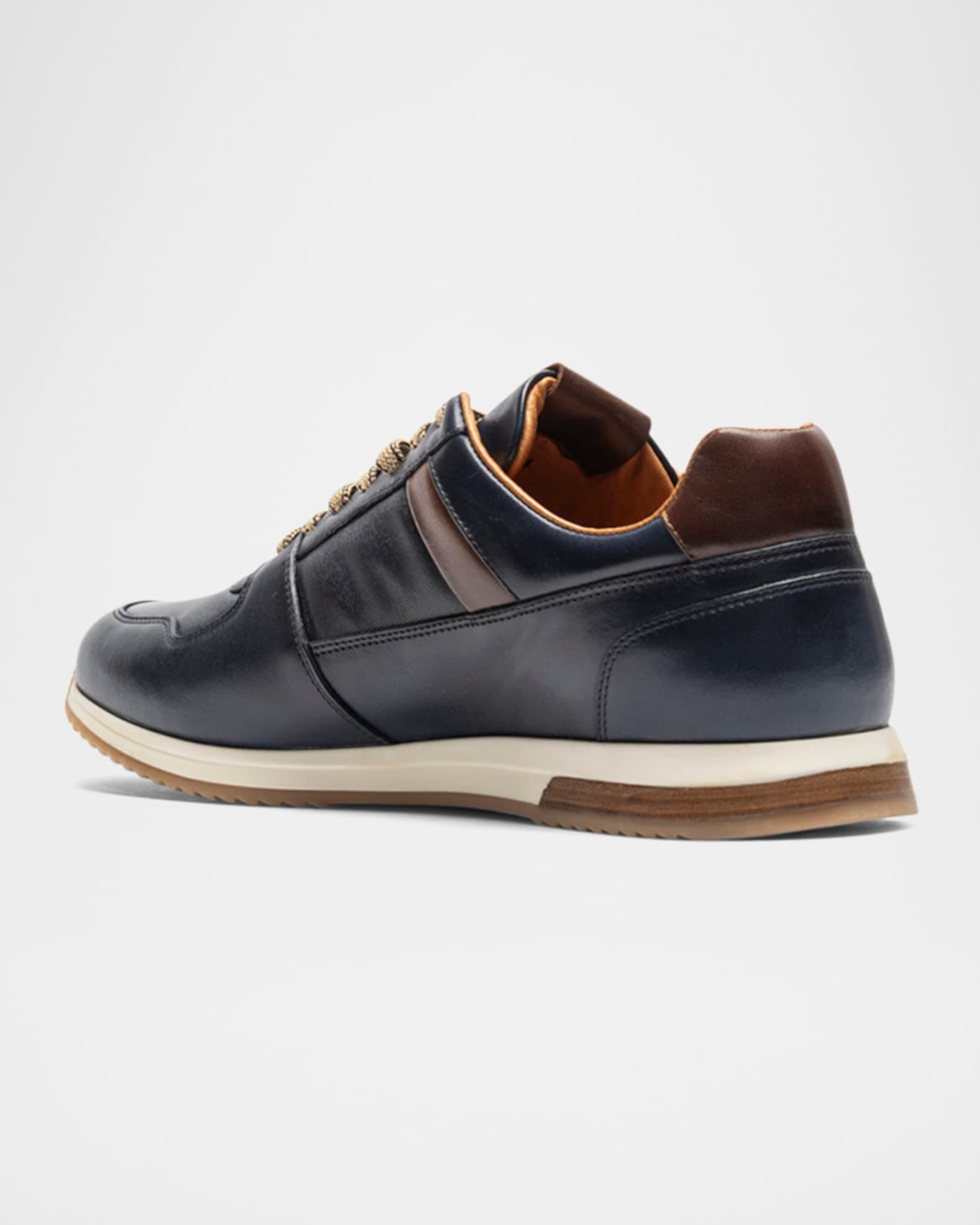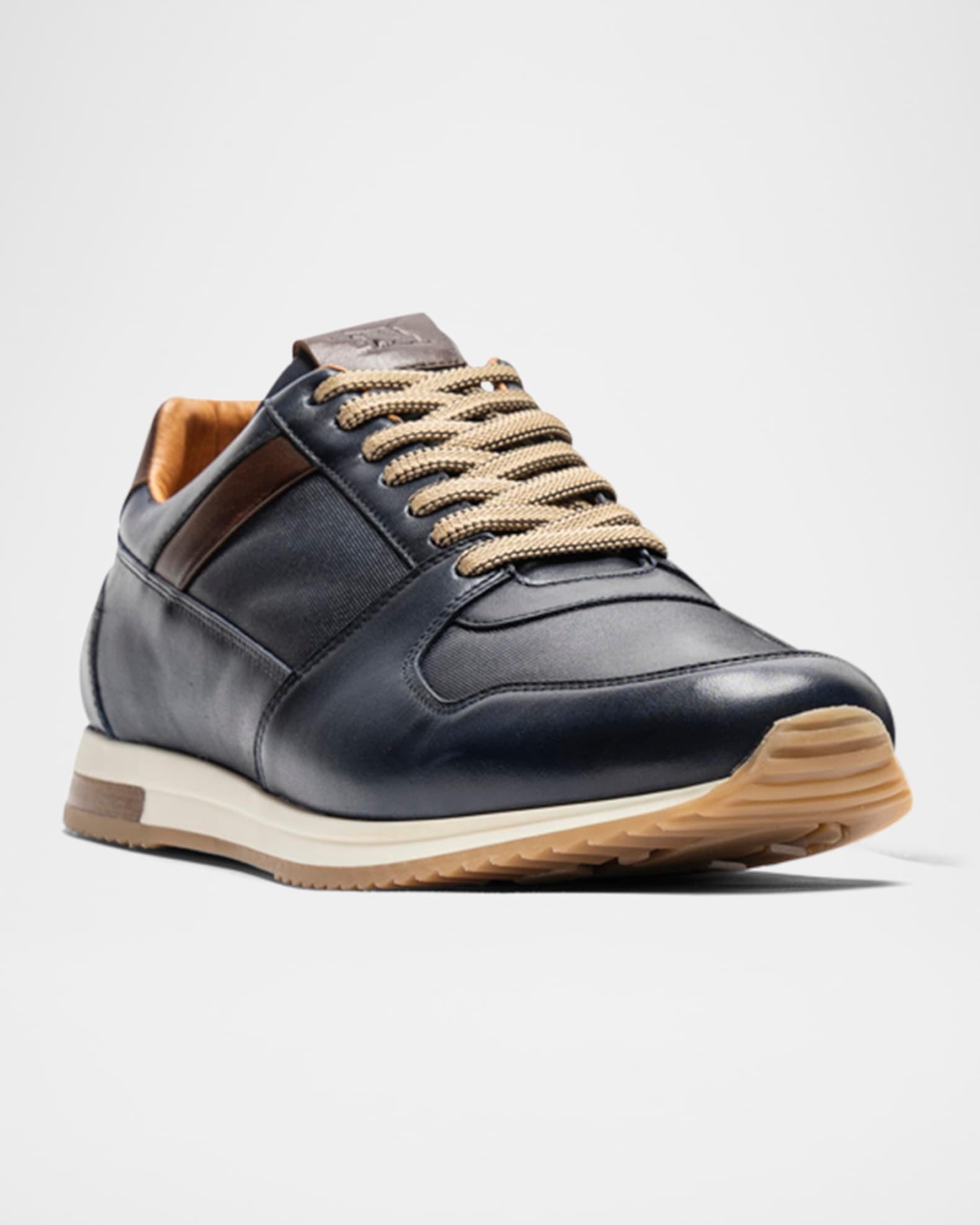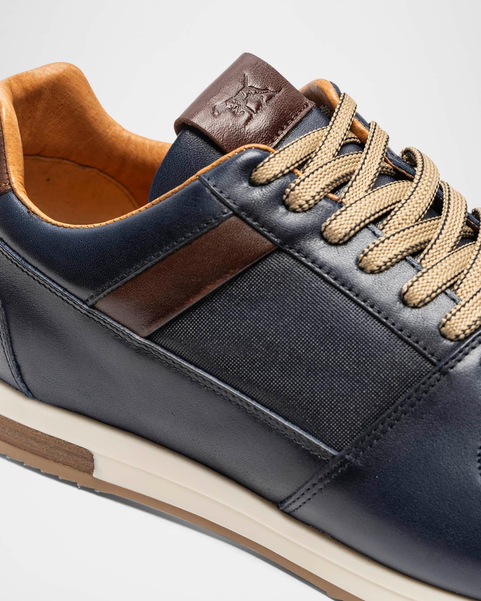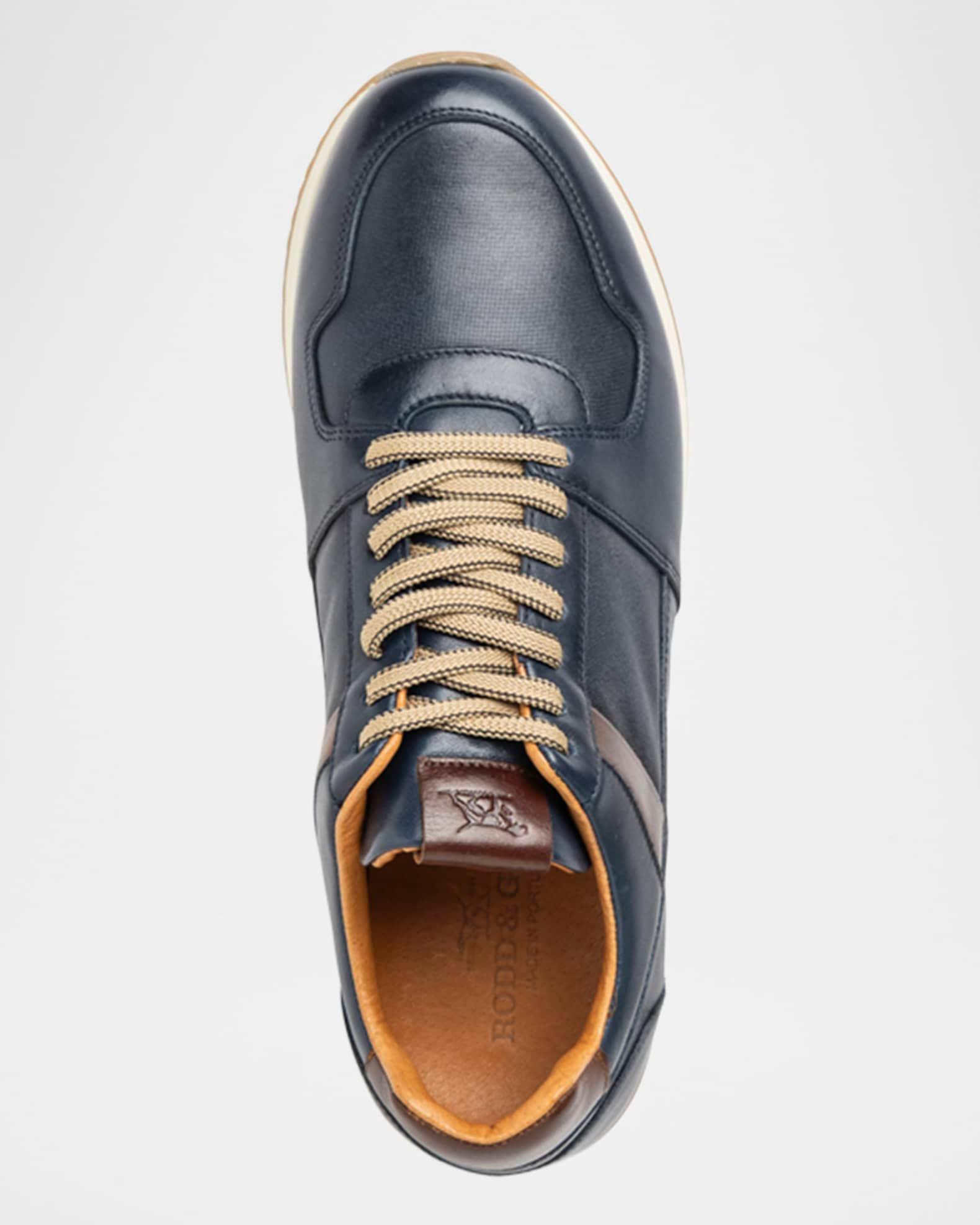 Plimmerton sneaker is a multimedia upper of tones, smooth, and embossed leather. This refined, retro-inspired sneaker features an old-school trainer-look rubber sole unit, with a leather veneer insert featured in the heel. the upper is made from burnished cow leather and is partially leather-lined lined making it super soft. The Plimmerton is paired perfectly with denim, chinos, or shorts. Rodd & Gunn "Plimmerton" sneakers in two-tone leather Stacked heel Round toe Lace-up vamp Embossed logo at tongue Leather and fabric lining Lugged rubber sole Spot clean Imported