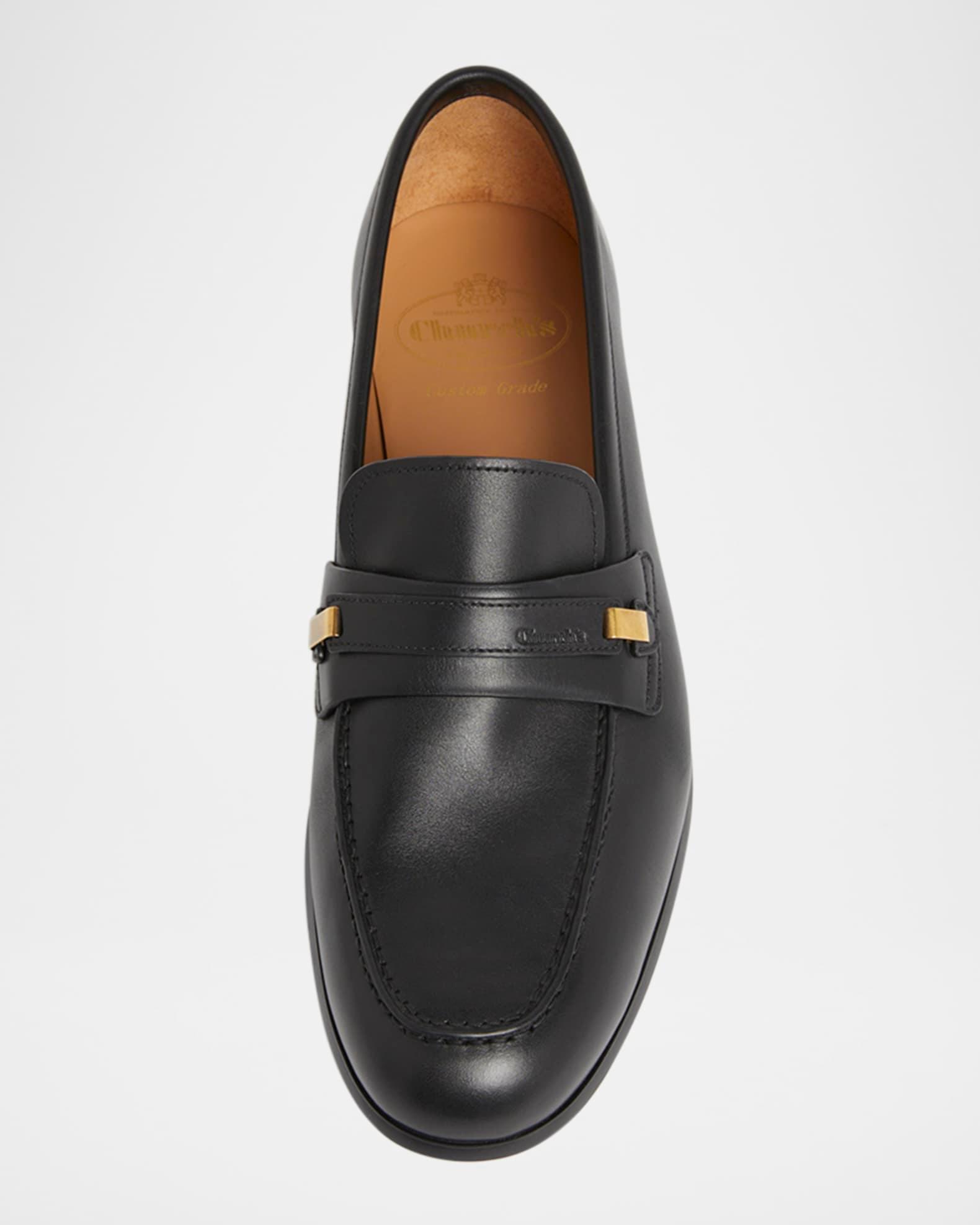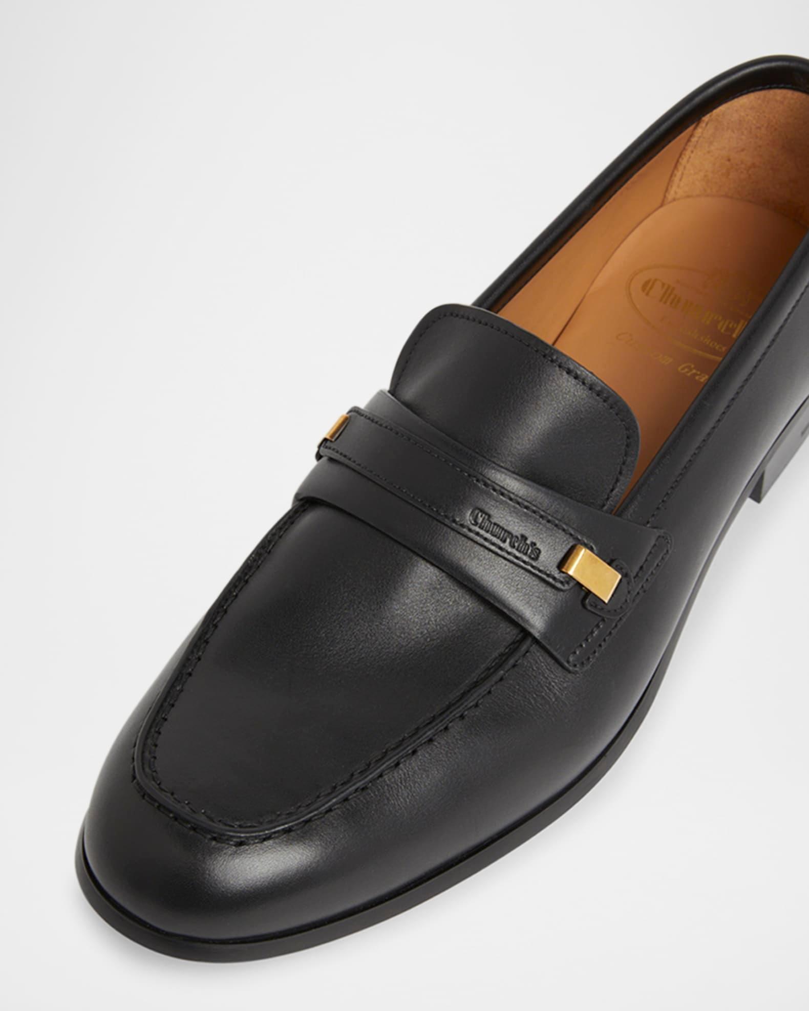 Church's penny loafers in soft calf leather with gold-tone hardware Stacked heel Round moc toe Leather strap with debossed logo Leather lining Rubber outsole Slip-on style Made in Italy