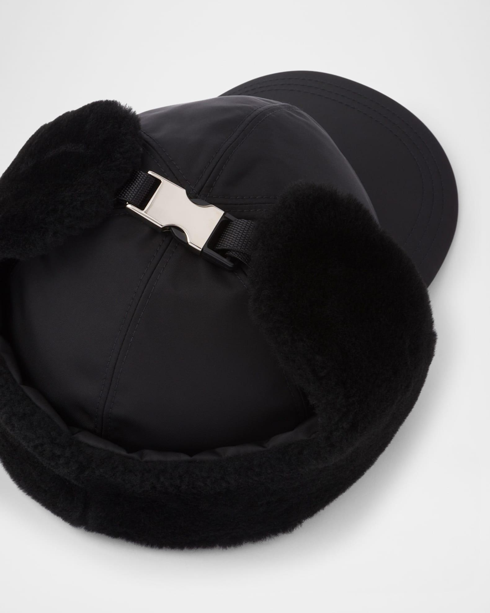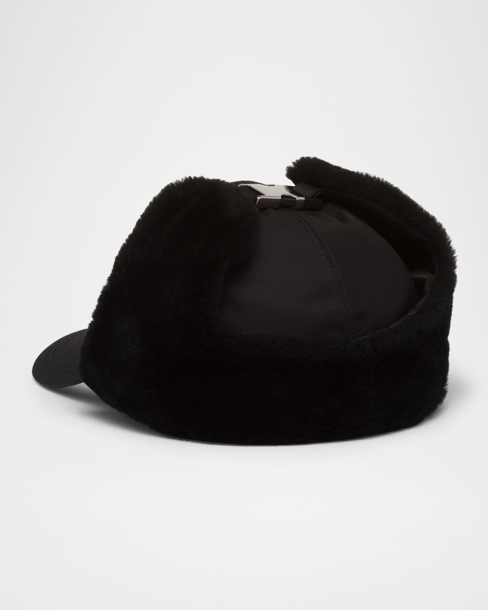 Prada re-nylon trapper baseball hat featuring dyed lamb shearling (Antarctica) lining Ear flaps can be styled up or down using buckle strap Six-panel crown with button top Curved brim Nylon/polyamide/leather/metal Imported