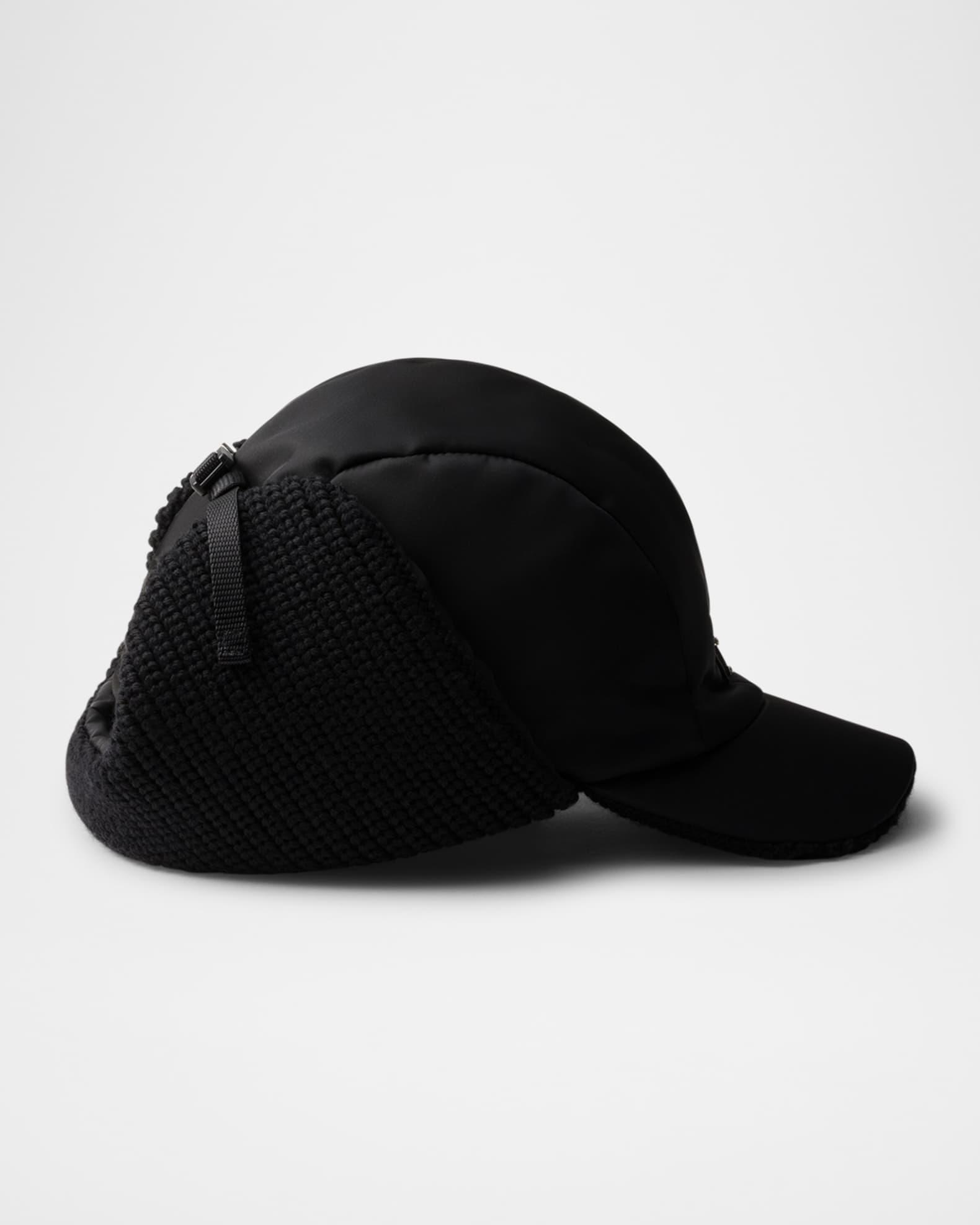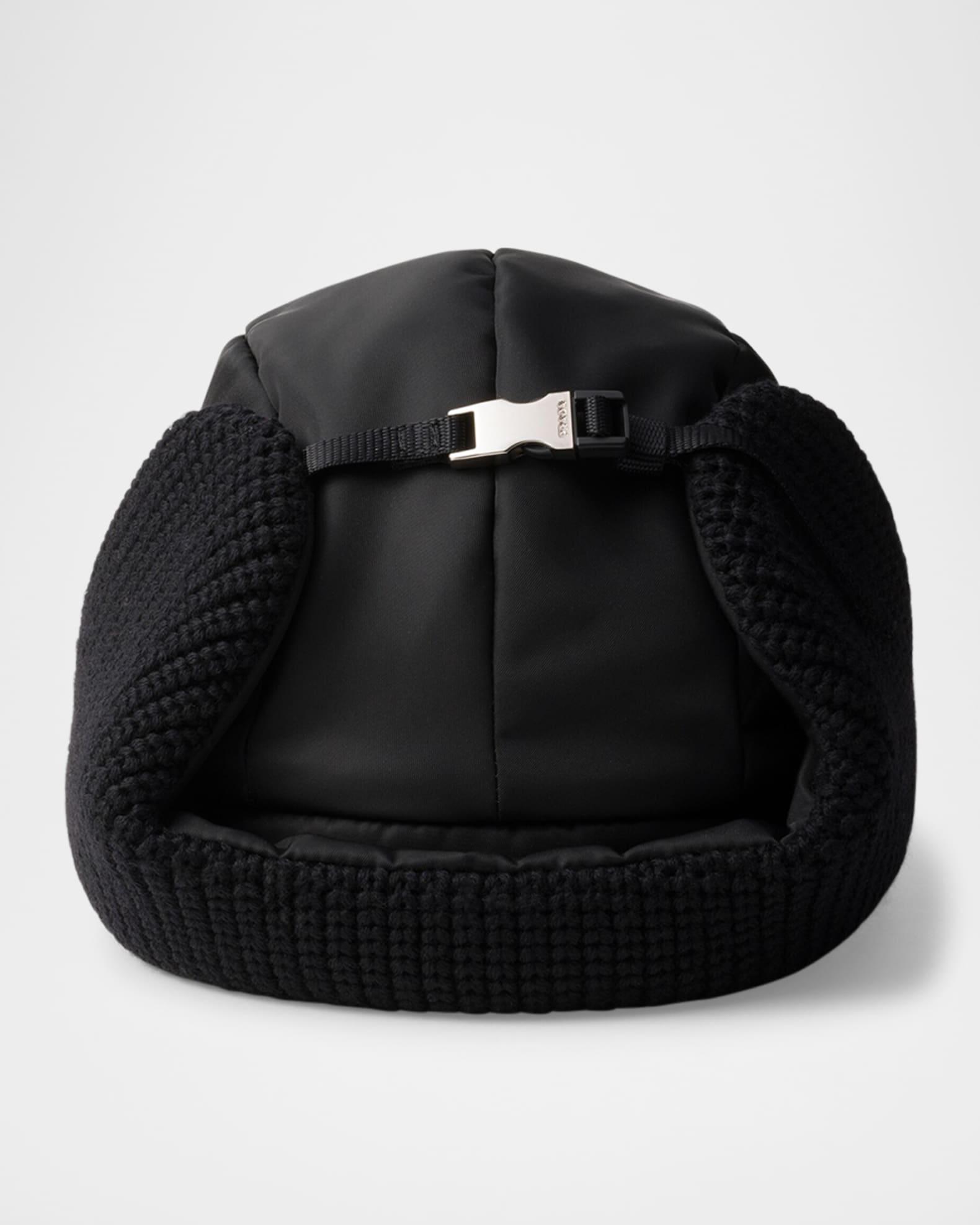 Prada versatile trapper hat in Re-Nylon decorated with the iconic enameled triangle logo on the front Re-Nylon is regenerated-nylon yarn made by recycling discarded plastic collected from landfill sites and oceans across the whole planet Wool knit lining Ear flaps can be styled up or down with buckle strap Nylon/wool/metal Imported