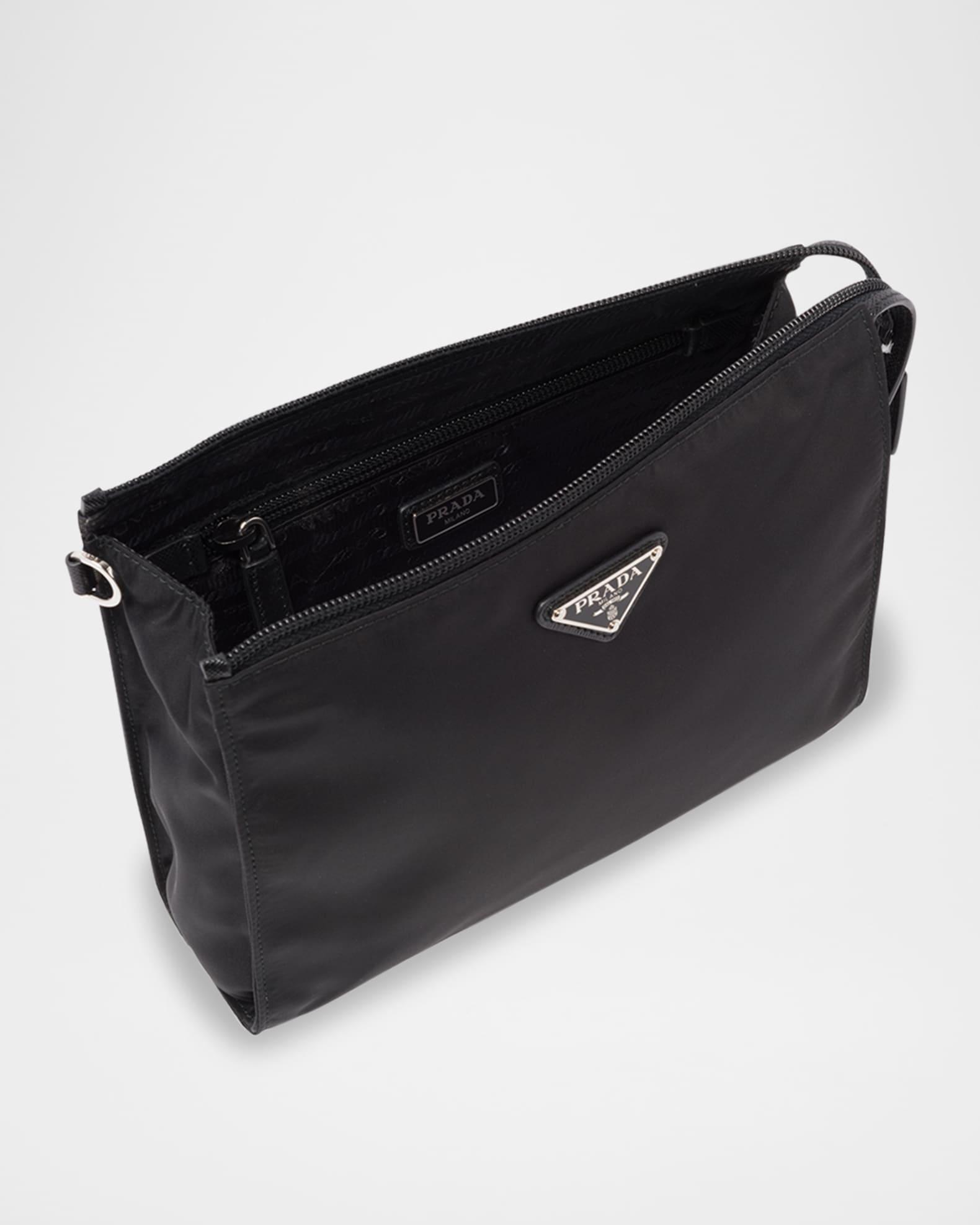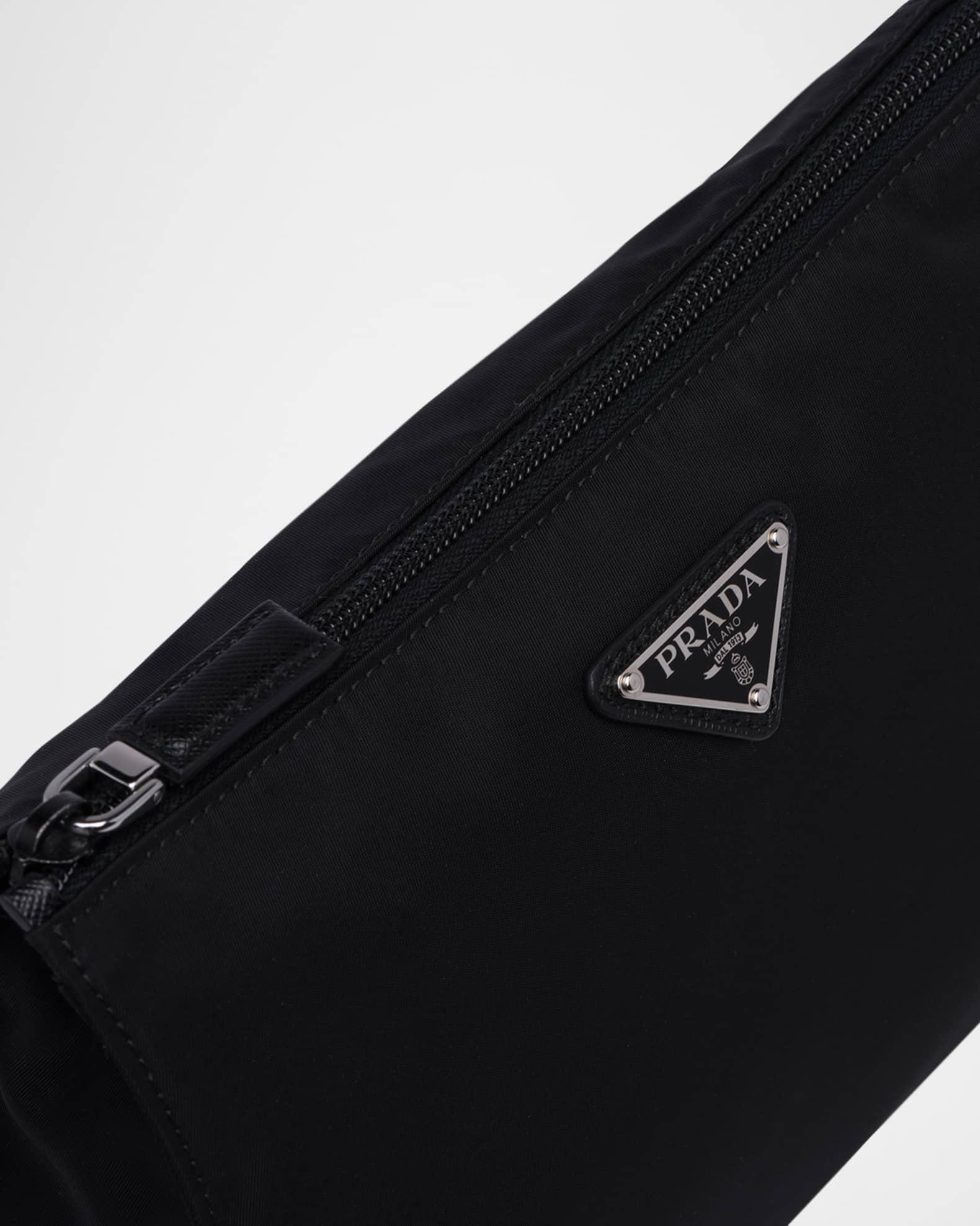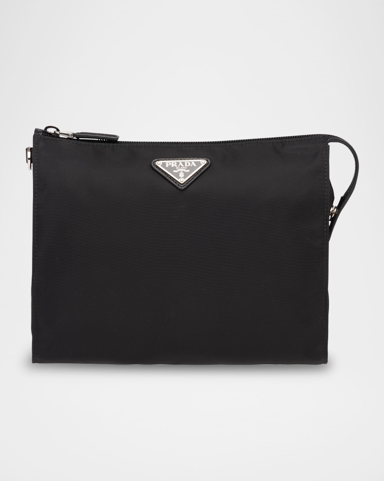 Prada pouch in Re-Nylon with Saffiano leather trim Features signature enameled metal trianble logo Removable leather wrist strap Interior, zip pocket Zip closure Logo print Re-Nylon lining Approx. 8.9"W x 6.3"H x 2.6"D Imported