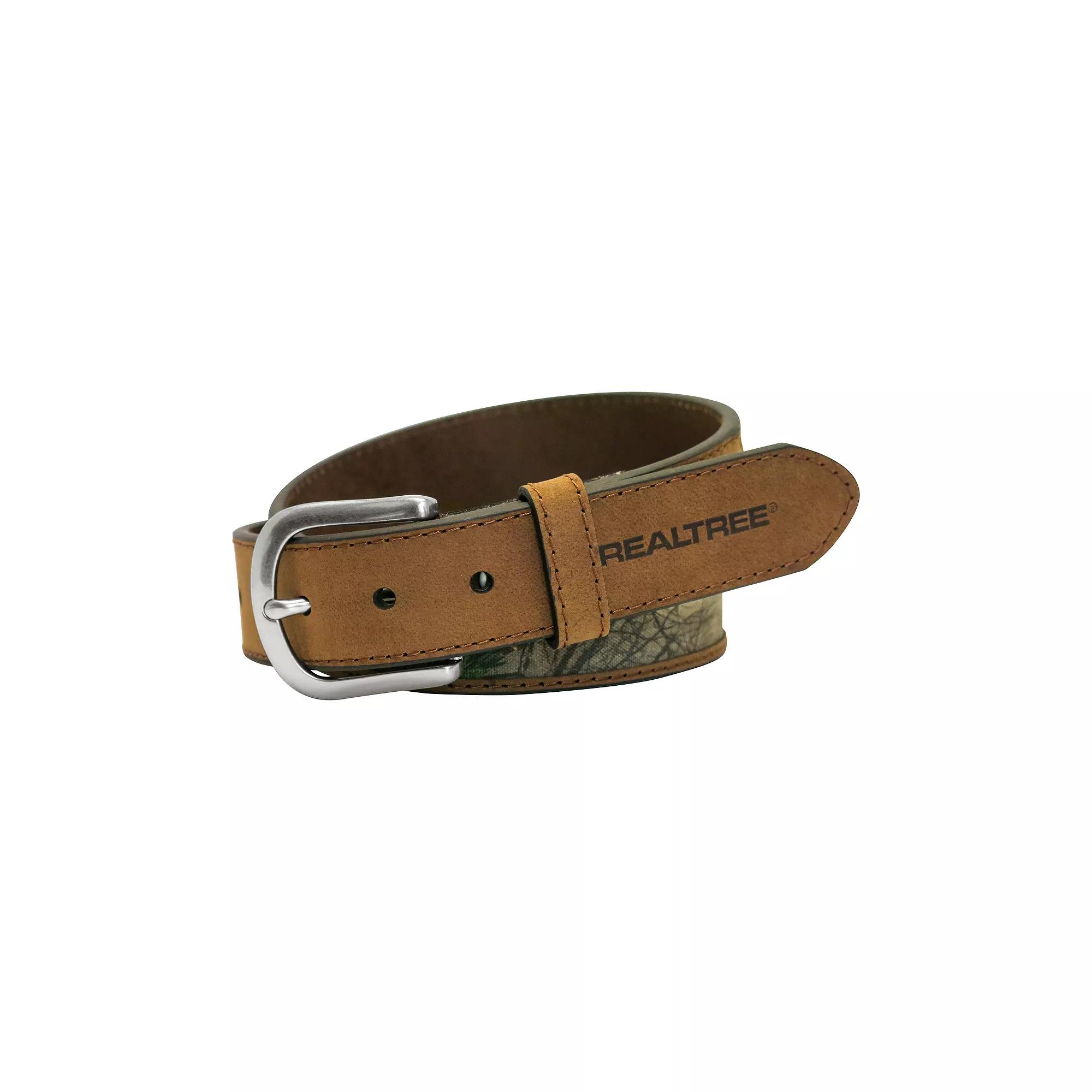 Camo cool. Find your outdoor style with this mens leather belt from Realtree.Camouflage patternGenuine leather constructionWestern detail tabSignature Realtree buck mark rivetsEmbossed logo tipApproximate 1.5-inch widthLeatherSpot cleanImported Size: 40. Color: Brown. Gender: male. Age Group: adult.