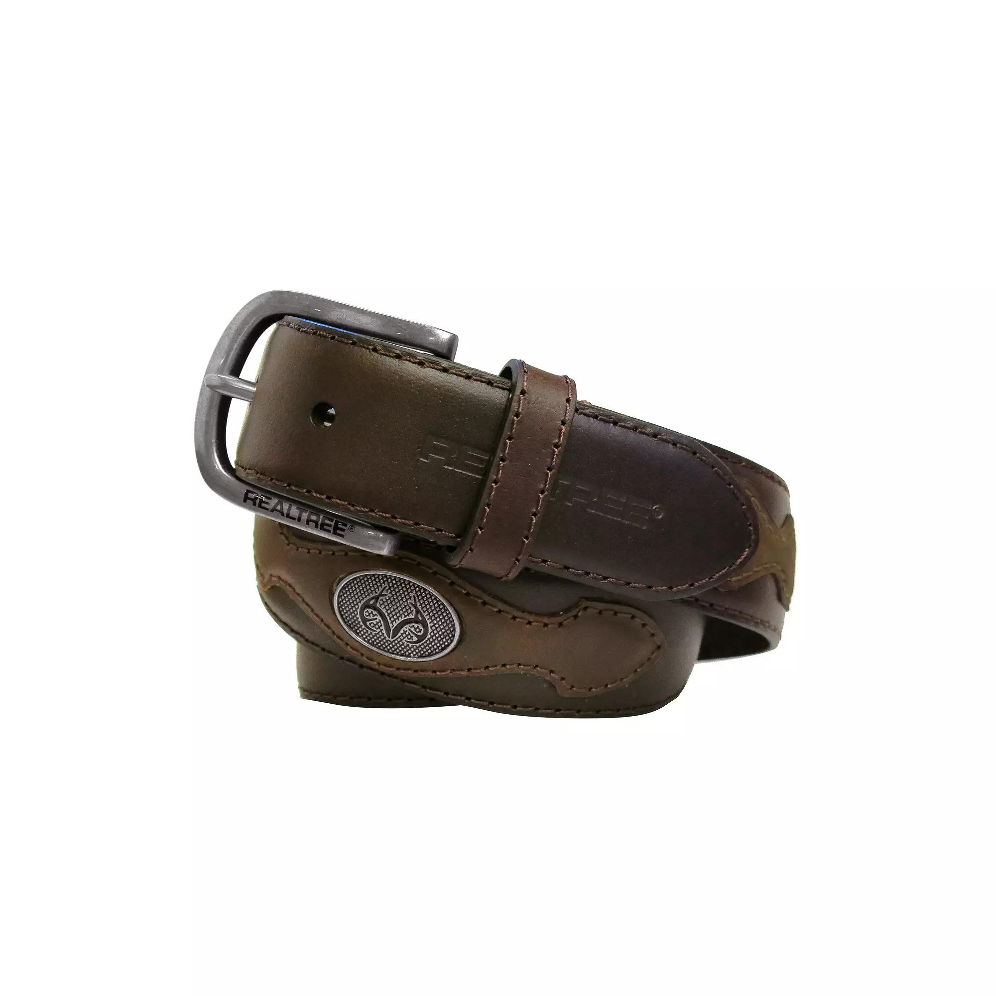 Rugged style. This mens Realtree leather belt is the perfect gift for the outdoorsman on your list.Genuine leather constructionFeather-edge detailSignature Realtree buck mark logo accentStitched Crazy Horse overlayRealtree logo buckleEmbossed logo tip endApproximate 1.5-inch widthLeatherSpot cleanImported Size: 34. Color: Brown. Gender: male. Age Group: adult.