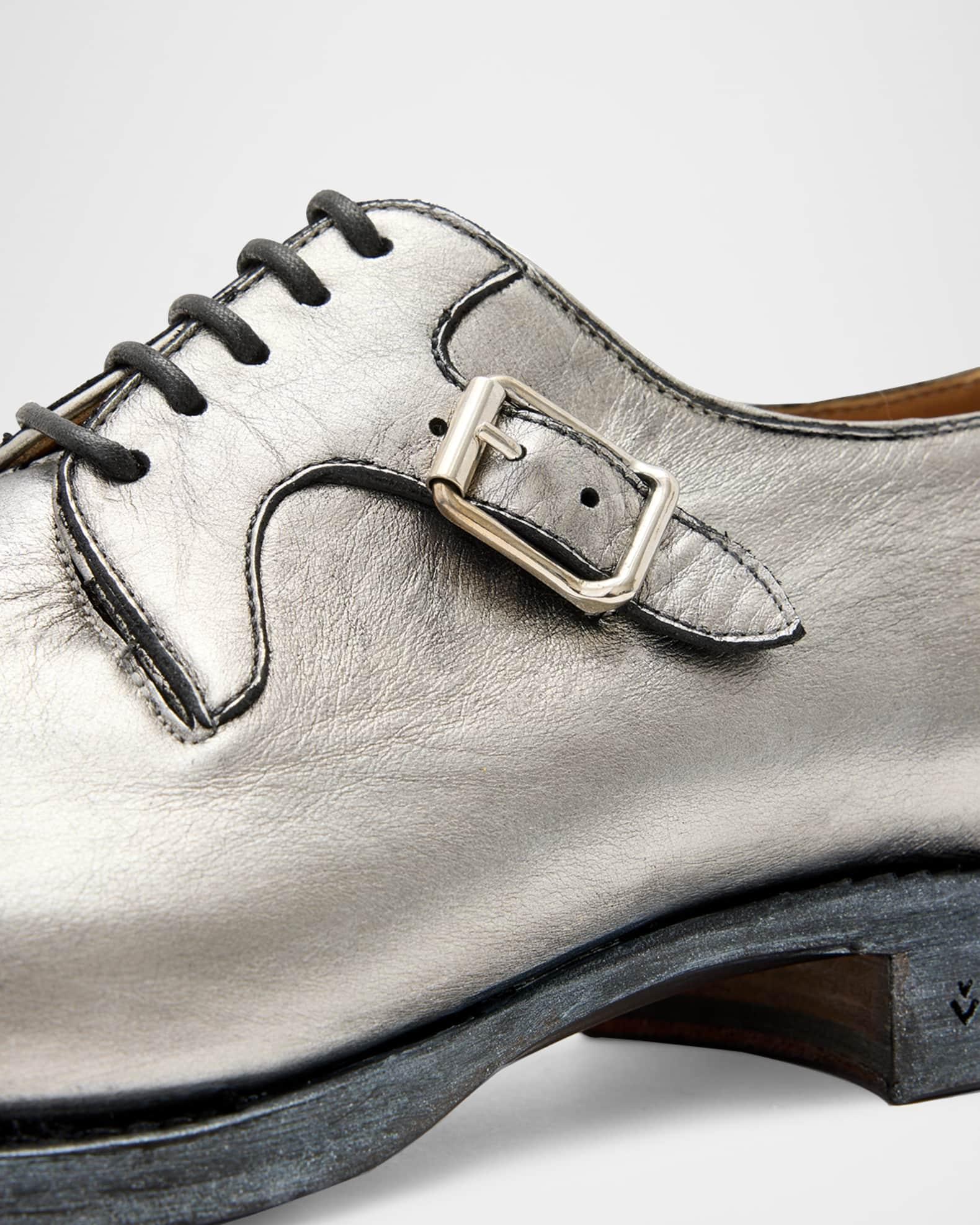 Resort '24 marks the audacious return of the regent derby, crafted from unique silver foil-coated calf leather. Each step is a statement of chiseled, architectural design, accented by meticulously placed deco hardware. Beneath this shimmering exterior, the integrity of true Goodyear welt construction and a fully hand-stained leather sole affirm its lasting quality. Elegant yet comfortable, this silhouette effortlessly completes any tailored ensemble this season. John Varvatos "Regent" derby shoes in foil-coated calf lether Stacked heel Round toe Lace-up vamp Leather outsole Lining: Leather Made in Italy