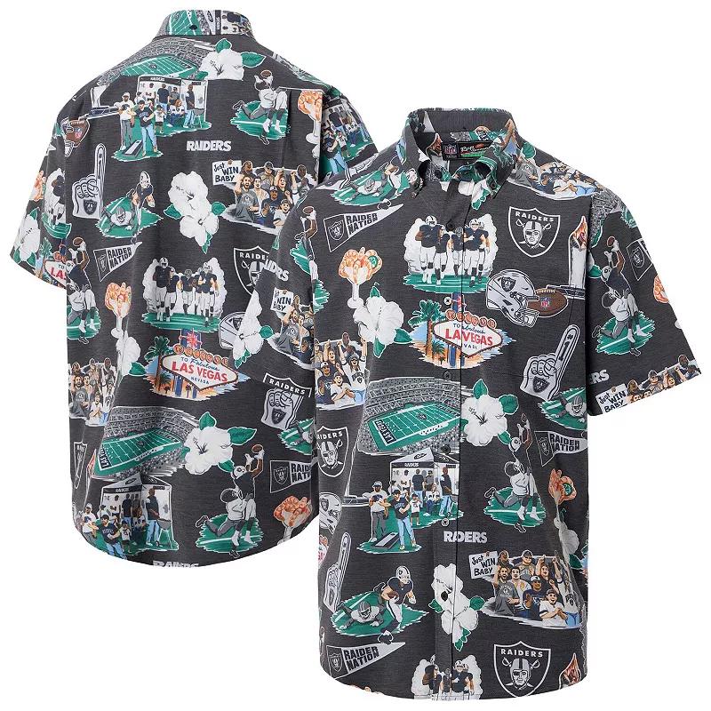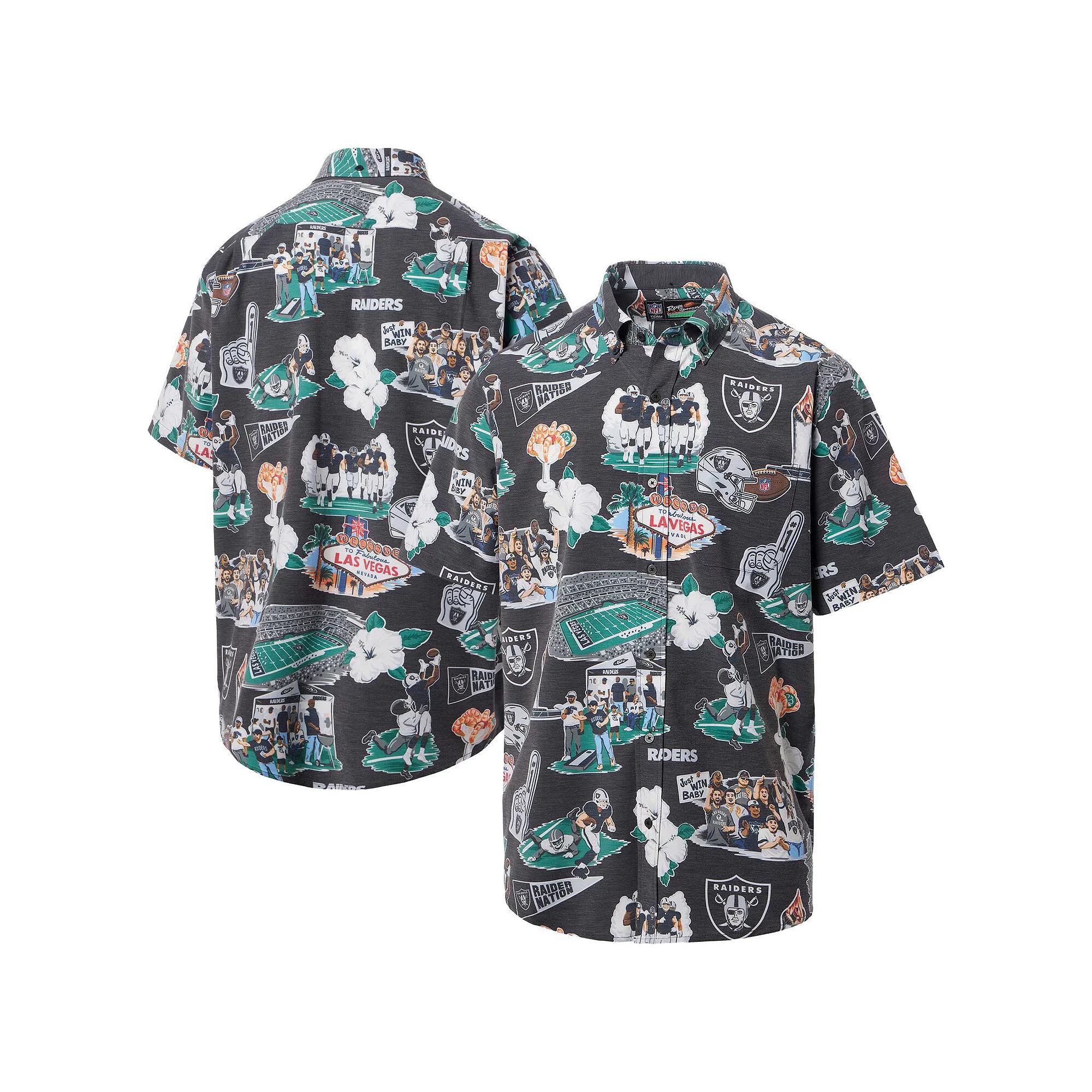 This Reyn Spooner Scenic Button-Down Shirt lets you rep your Las Vegas Raiders pride with a touch of island flair. This premium cotton shirt features an eye-catching sublimated print showcasing iconic Las Vegas landmarks alongside bold Raiders graphics. With convenient side splits at the waist hem, this button-down shirt offers a comfortable fit and effortless style for any Raiders fan.This Reyn Spooner Scenic Button-Down Shirt lets you rep your Las Vegas Raiders pride with a touch of island flair. This premium cotton shirt features an eye-catching sublimated print showcasing iconic Las Vegas landmarks alongside bold Raiders graphics. With convenient side splits at the waist hem, this button-down shirt offers a comfortable fit and effortless style for any Raiders fan.PRODUCT FEATURESOfficially licensedMachine wash, tumble dry lowMaterial: 100% CottonChest pocketBrand: Reyn SpoonerImportedSide splits at waist hemFull-button frontSublimated regional and school graphicsShort sleeve Size: XXL. Color: Lvr Black. Gender: male. Age Group: adult.