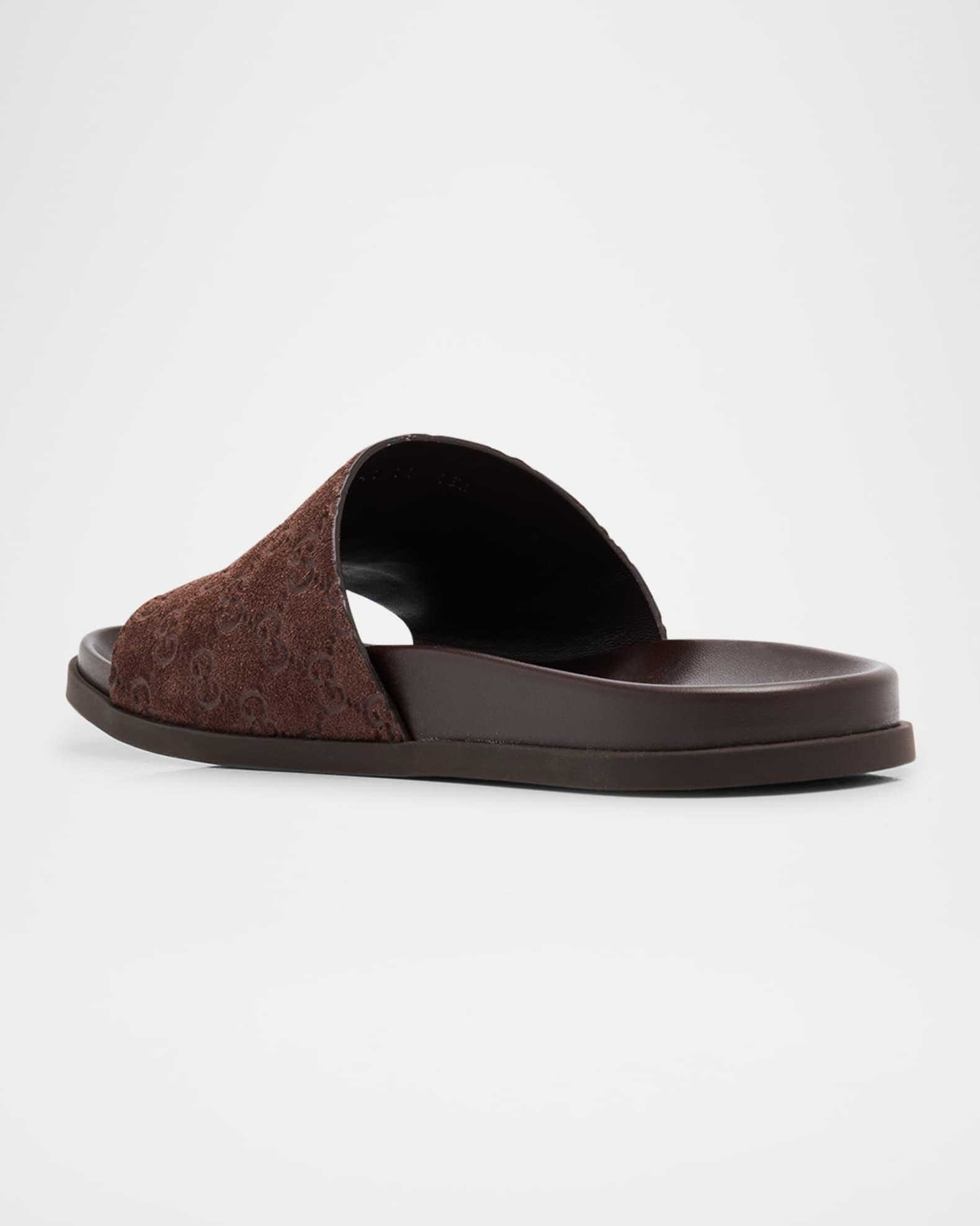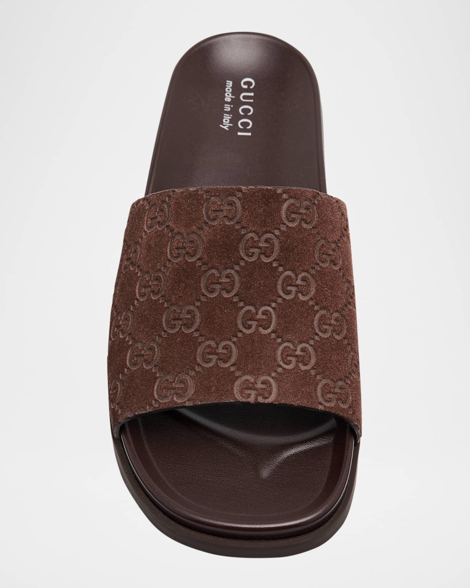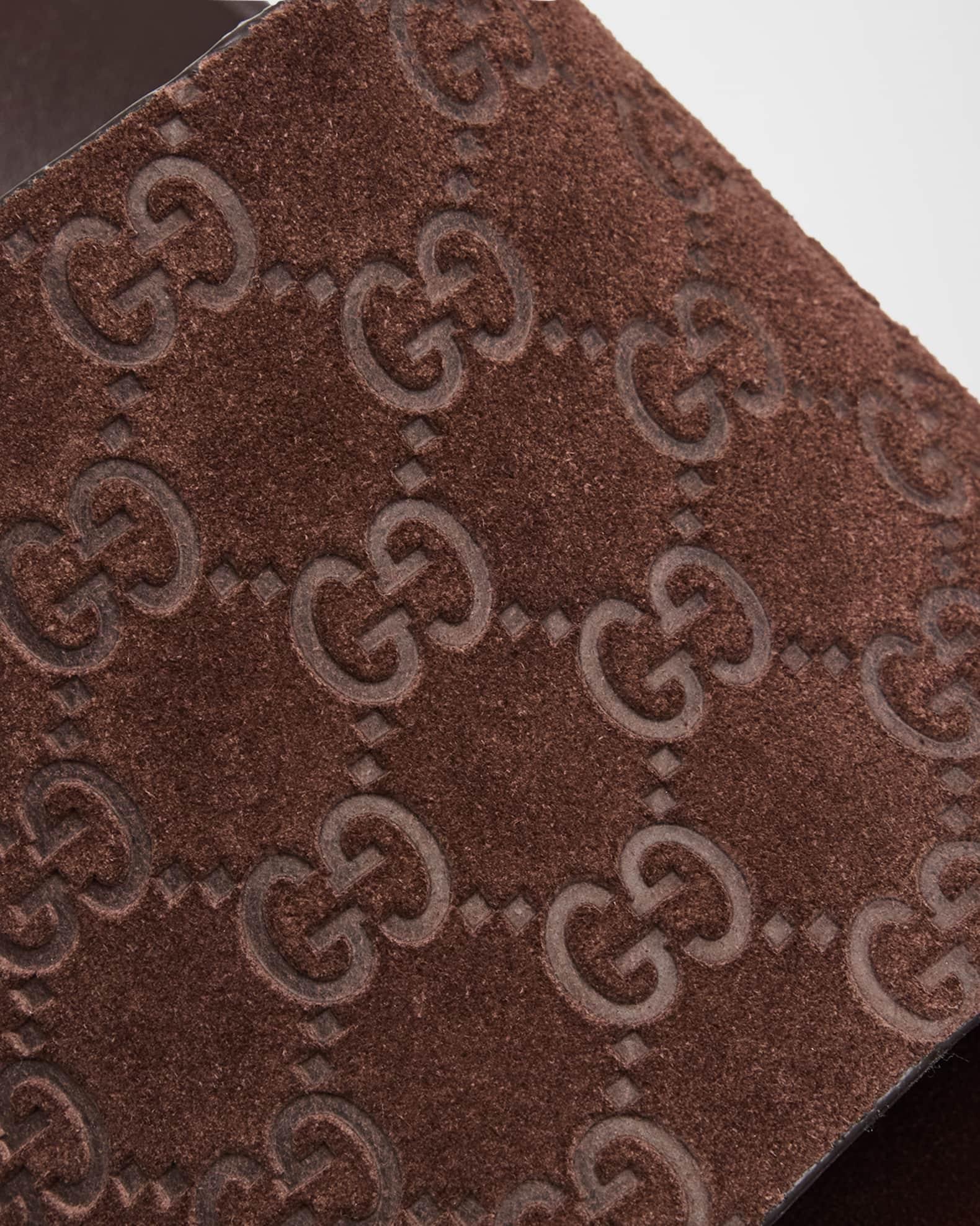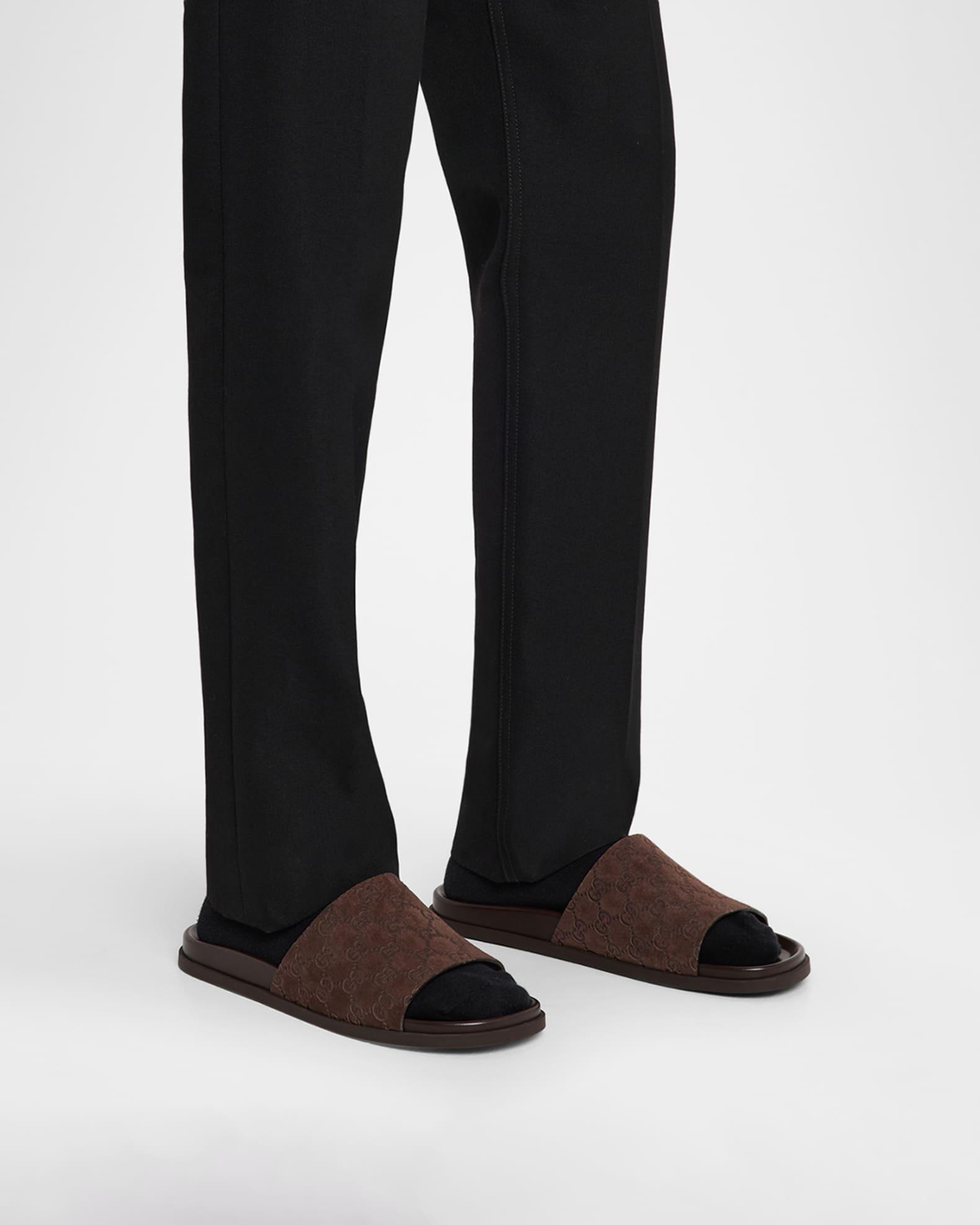 Gucci slide sandals in soft suede defined by the GG motif, blending heritage elegance with modern sophistication Contoured sole ensures all-day comfort and versatility Flat heel Open toe Wide band vamp Leather trim Easy slide style Made in Italy
