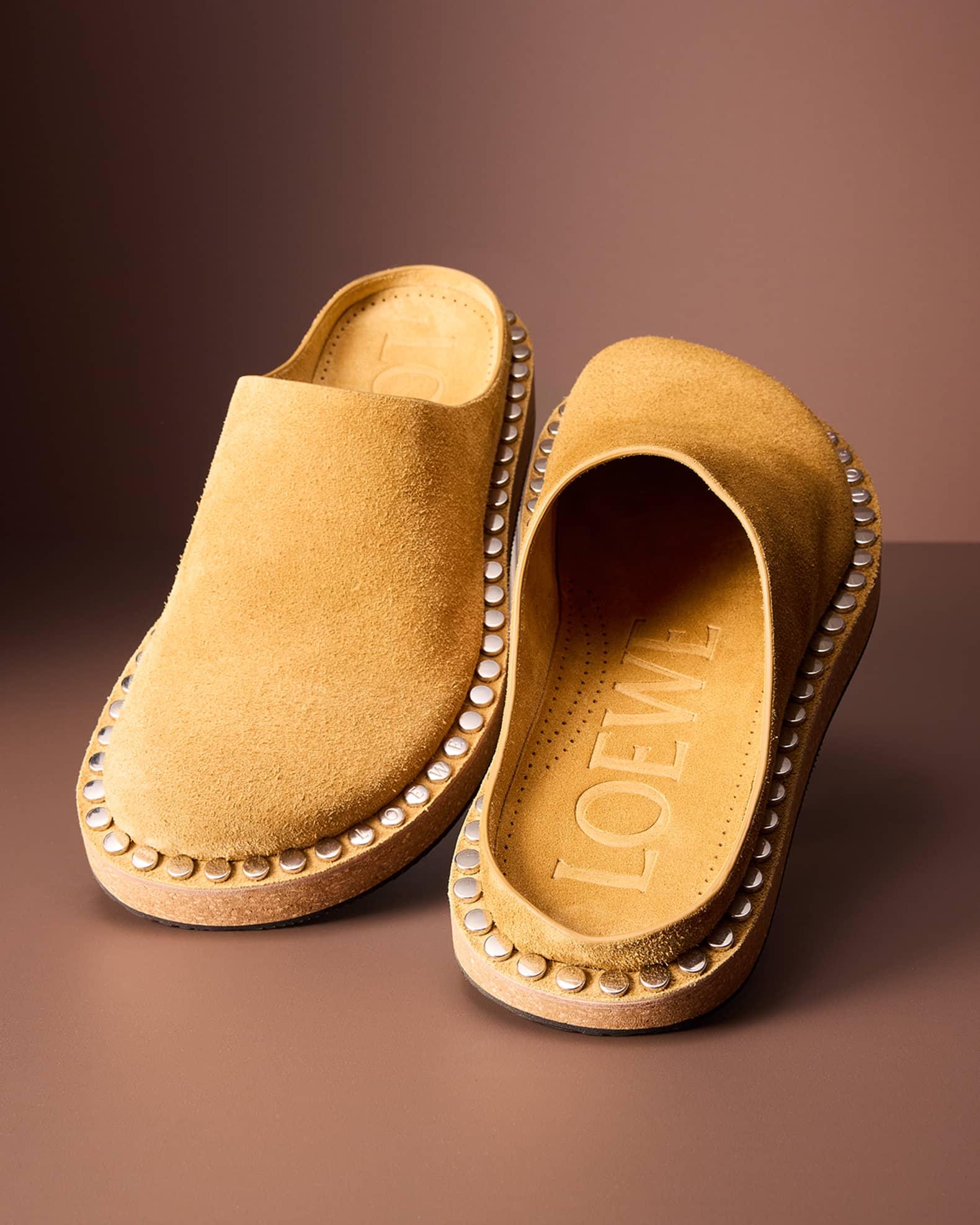 Loewe mules in calfskin suede showcasing handapplied logoengraved studs on a cork sole 25mm flat heel Round toe Footbed with embossed logo Ergonomic insole Rubber outsole Slipon style Made in Italy