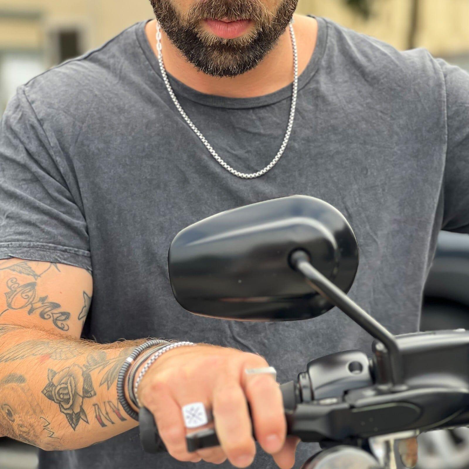 Dress to impress with our Men's Rolo Chain Necklace! Crafted with a sleek and modern look, it's made of sturdy stainless steel and comes in a cool black and silver combination. It's the perfect accessory to add some style to any outfit. Stainless Steel Stainless steel & burnished silver plating or stainless steel & IP matte black plating.Waterproof/Water ResistantGo surf, snowboard, or even take a shower with them on.