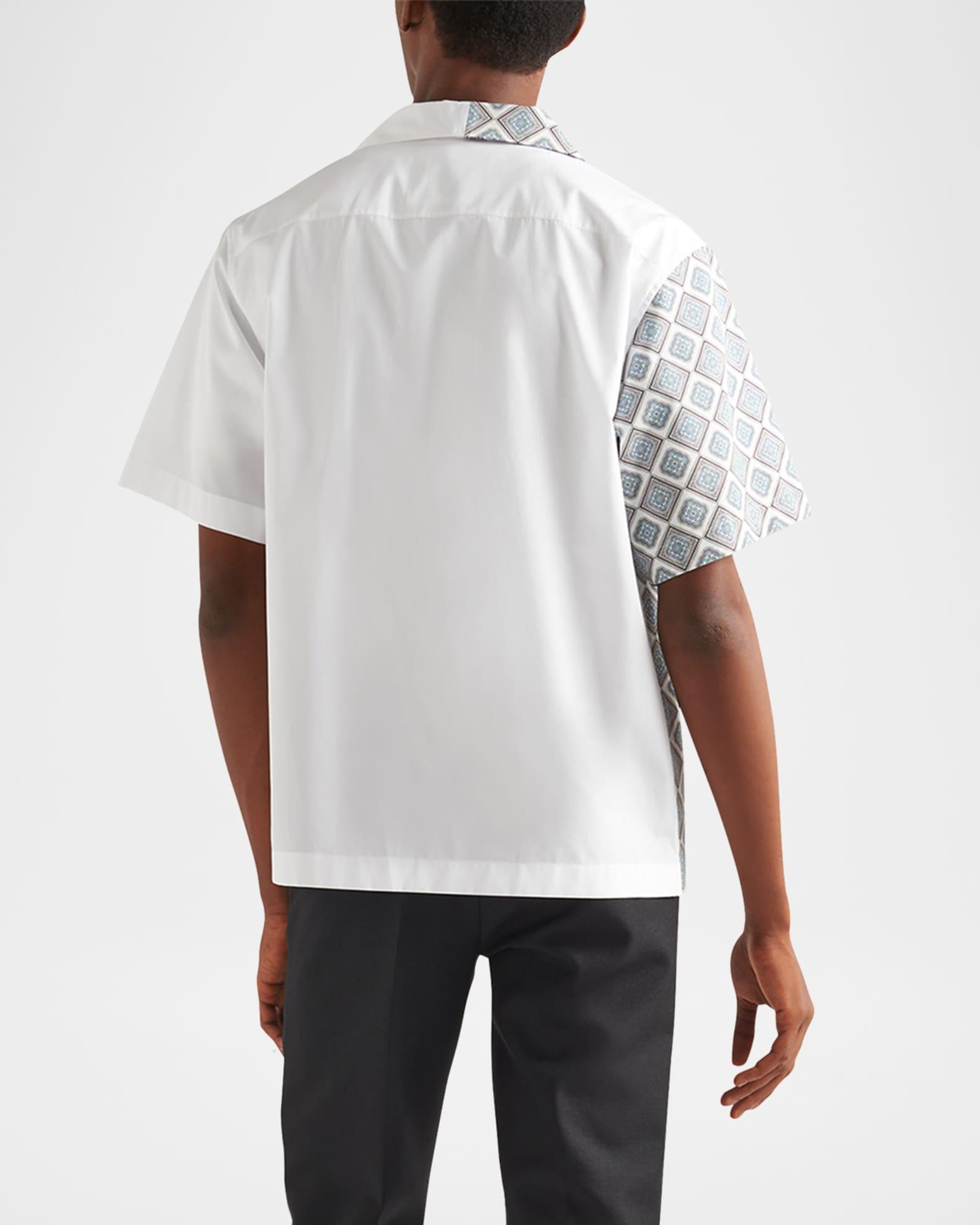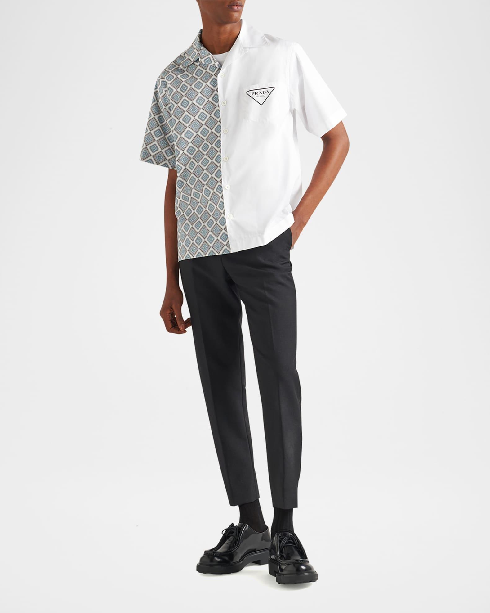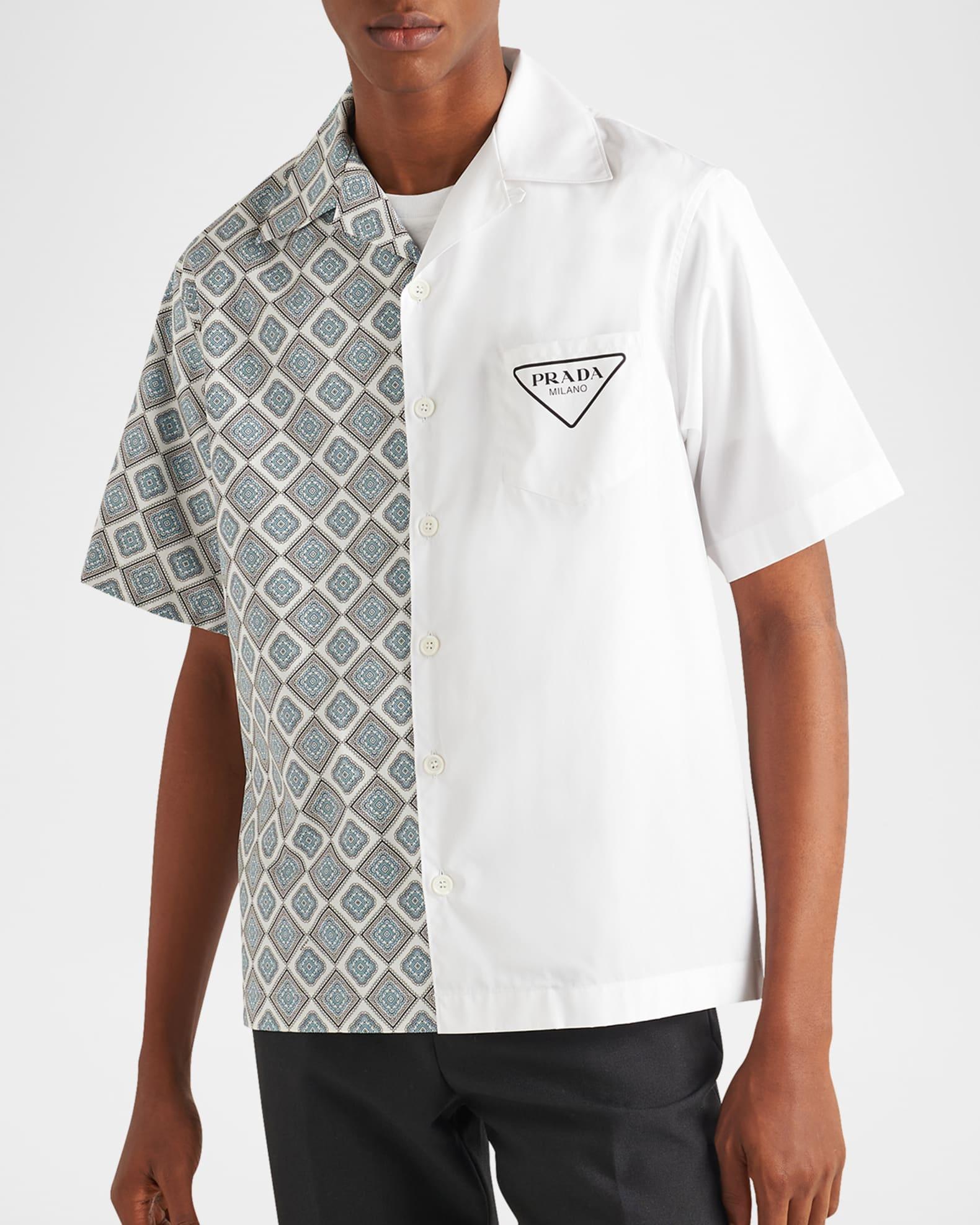 Prada sport shirt with contrasting geometric panels, creating a play of duality and juxtaposition that is emblematic of the brand Camp collar; button closure Chest patch pocket with triangle logo print Short sleeves Sleek, sporty fit Cotton Imported