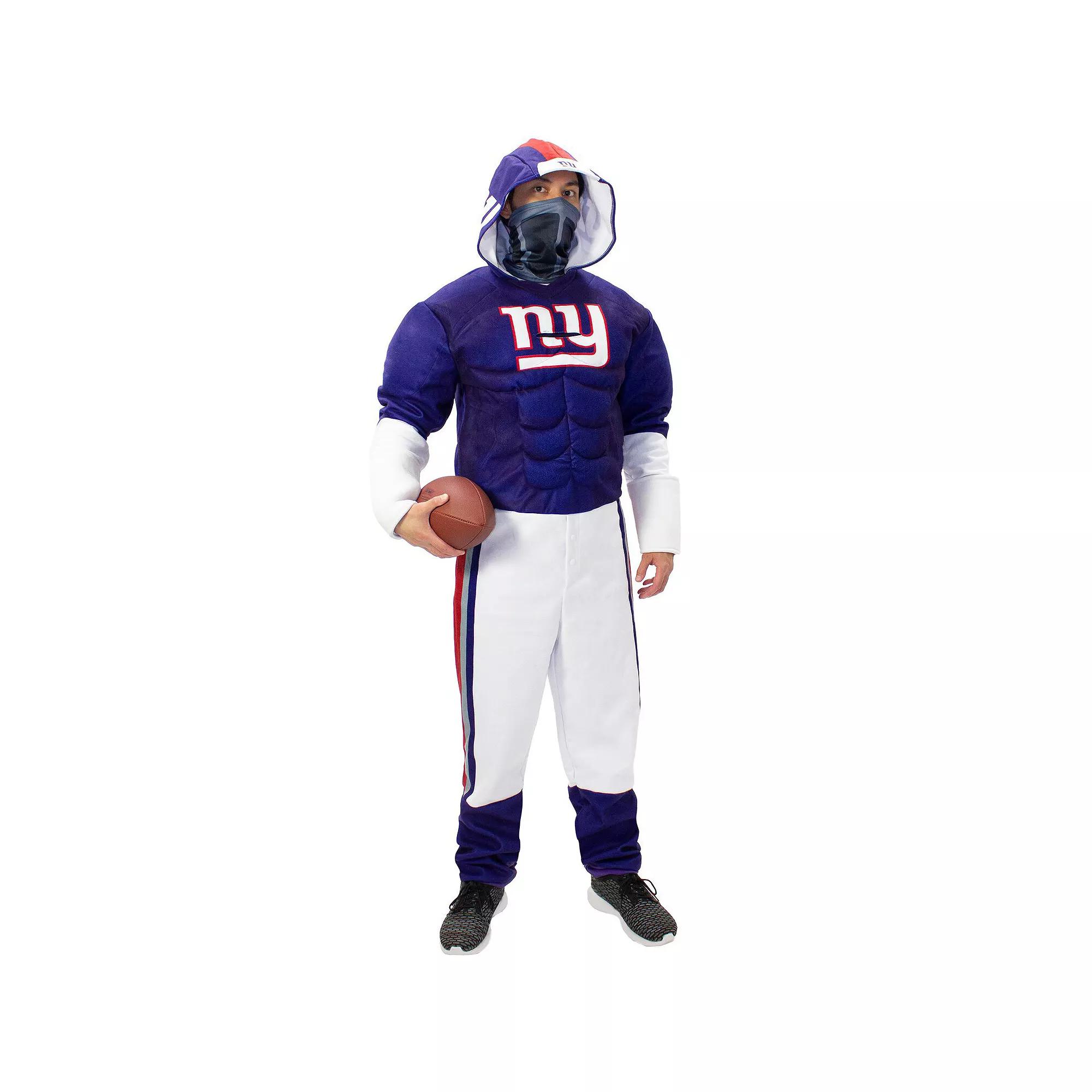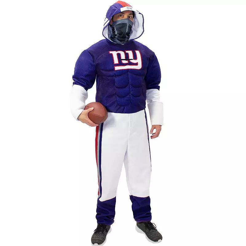Transform into a New York Giants player with this Game Day costume in team colors. The bodysuit features padded faux muscles, official New York Giants graphics and a zipper closure for easy dressing. Plus, polyester material creates a soft feel for hours of comfortable wearing.Transform into a New York Giants player with this Game Day costume in team colors. The bodysuit features padded faux muscles, official New York Giants graphics and a zipper closure for easy dressing. Plus, polyester material creates a soft feel for hours of comfortable wearing.PRODUCT FEATURESImportedBrand: Jerry LeighOfficially licensedThe Face Covering is for personal use only and is not intended for a medical purpose or as a replacement for medical-grade personal protective equipment. It is a fashion face covering not intended to be personal protective equipment and should not be used by healthcare professionals or used in a healthcare/clinical environment or setting. This face covering is not intended to prevent or protect from any form of illness or disease (or otherwise).Padded muscle detailsTwo-button flyWipe clean with a damp clothRear zipper closureV-neckSublimated graphicsZippered pocket right hip seamMaterial: 100% PolyesterCenter chest slip pocketHood without drawstringInseam on size M measures approx. 29Long sleeve Color: Blue. Gender: male. Age Group: adult. Material: Cotton.