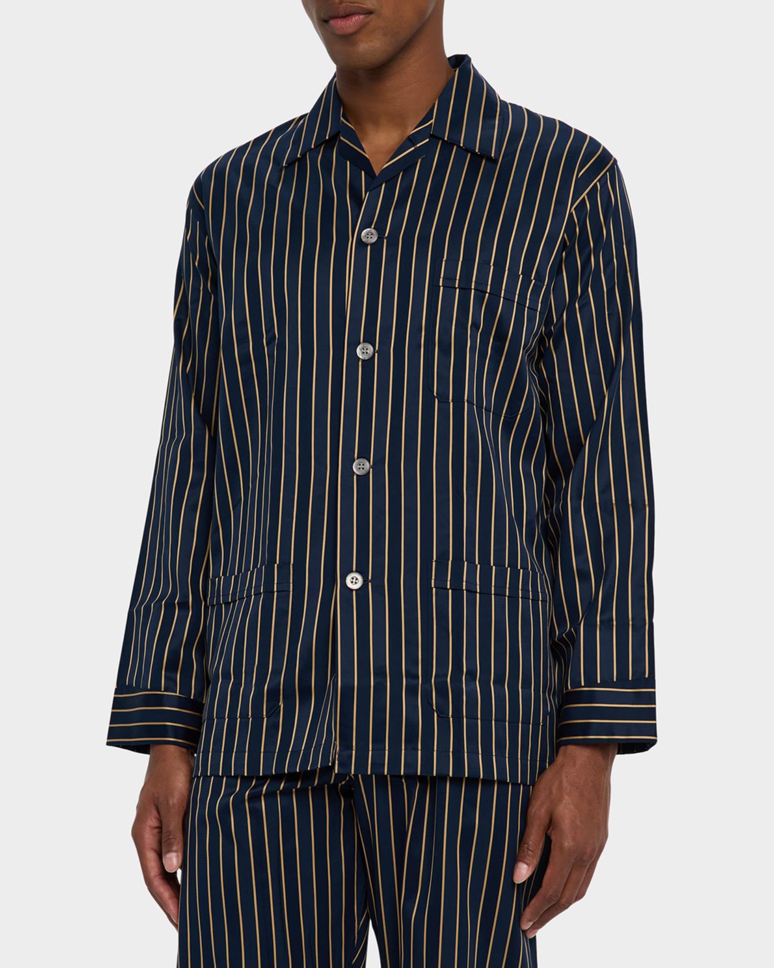 Derek Rose two-piece pajama set in smooth satin adorned with classic pinstripes Better Cotton Initiative Cotton Machine wash Made in Czech Republic Pajama shirt: Approx. 24"L from shoulder to hem Notch collar Button front Three front patch pockets Long sleeves; approx. 25.5"L Pajama pants: Relaxed legs Pull-on style