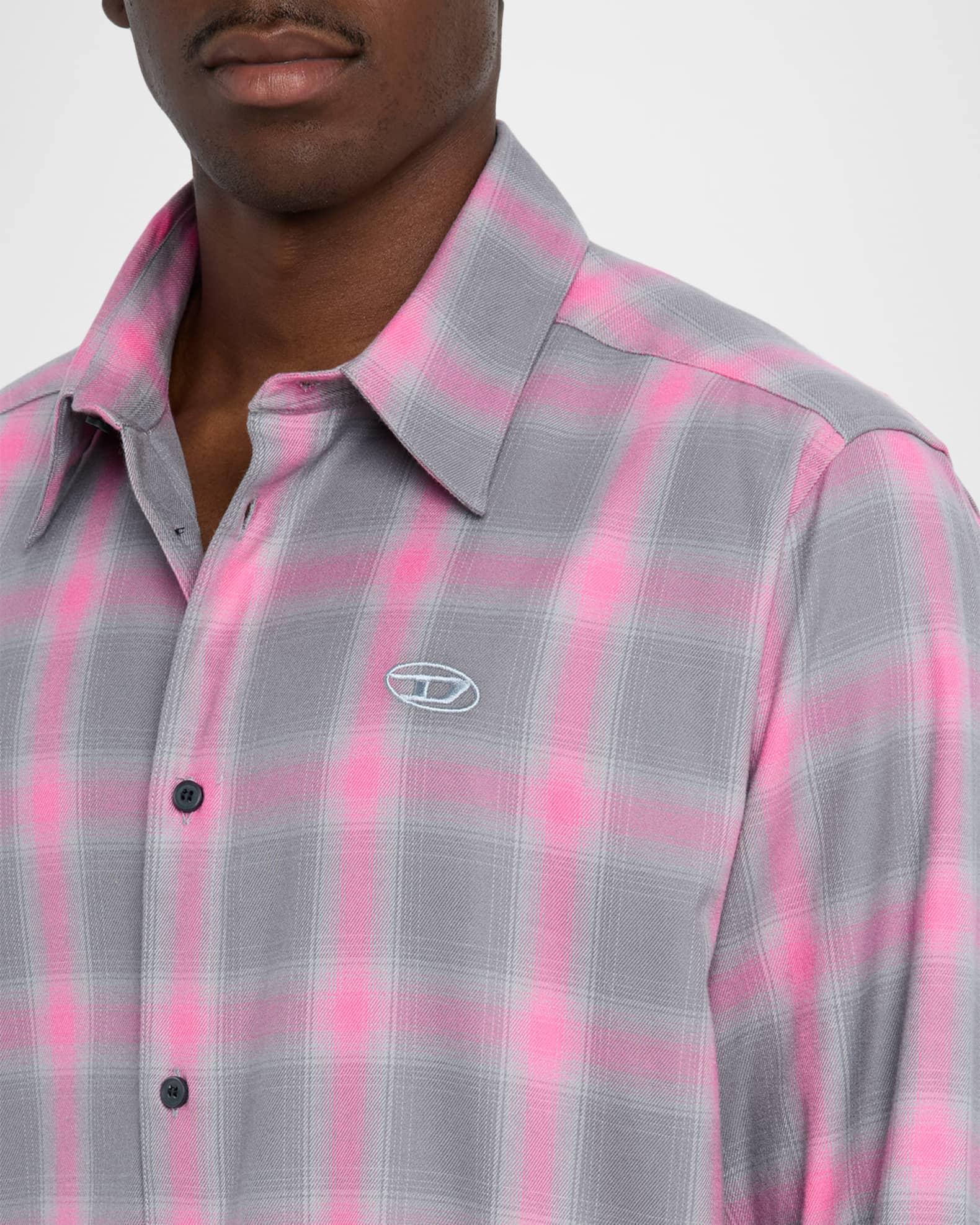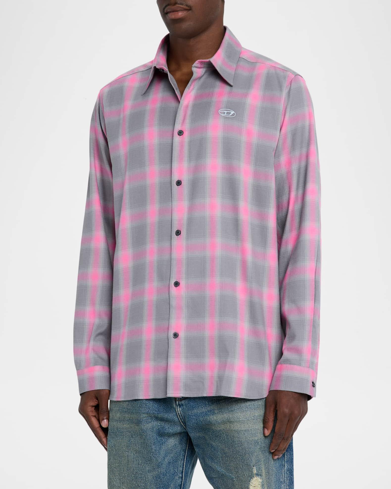 Diesel plaid button-down shirt crafted from an organic cotton blend with the iconic D-logo embroidered on the chest Point collar Button placket Long sleeves Single-button cuffs Back yoke Shirttail hem Cotton/viscose Machine wash cold Imported