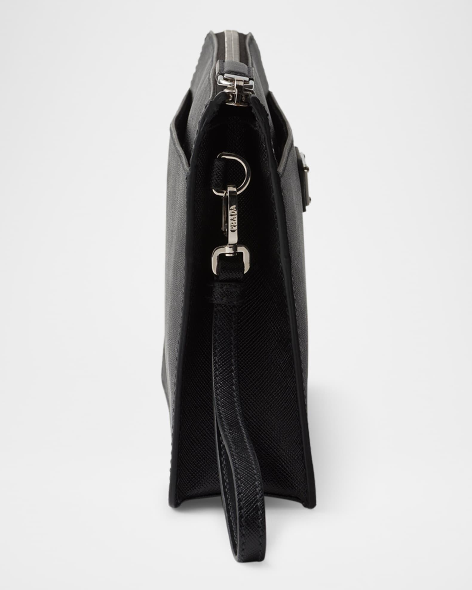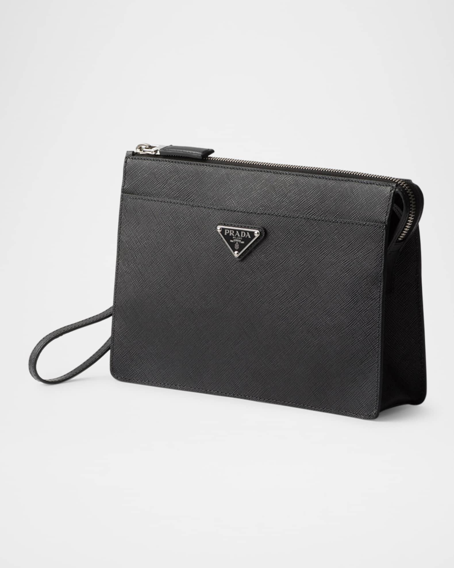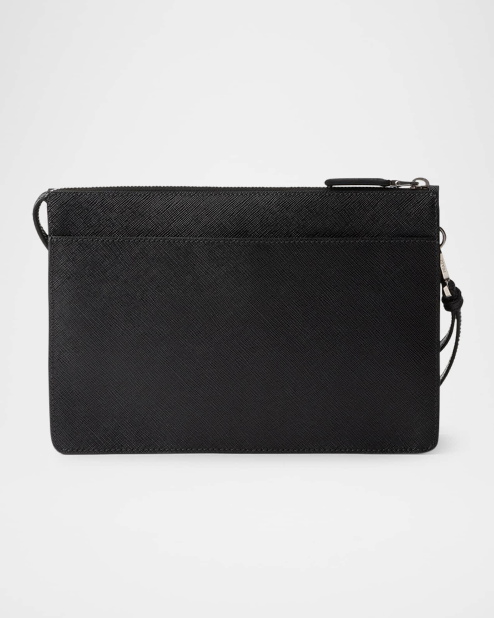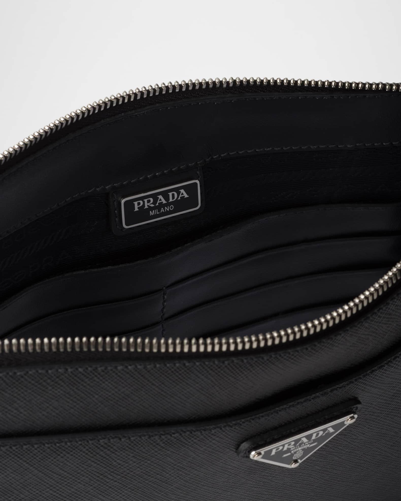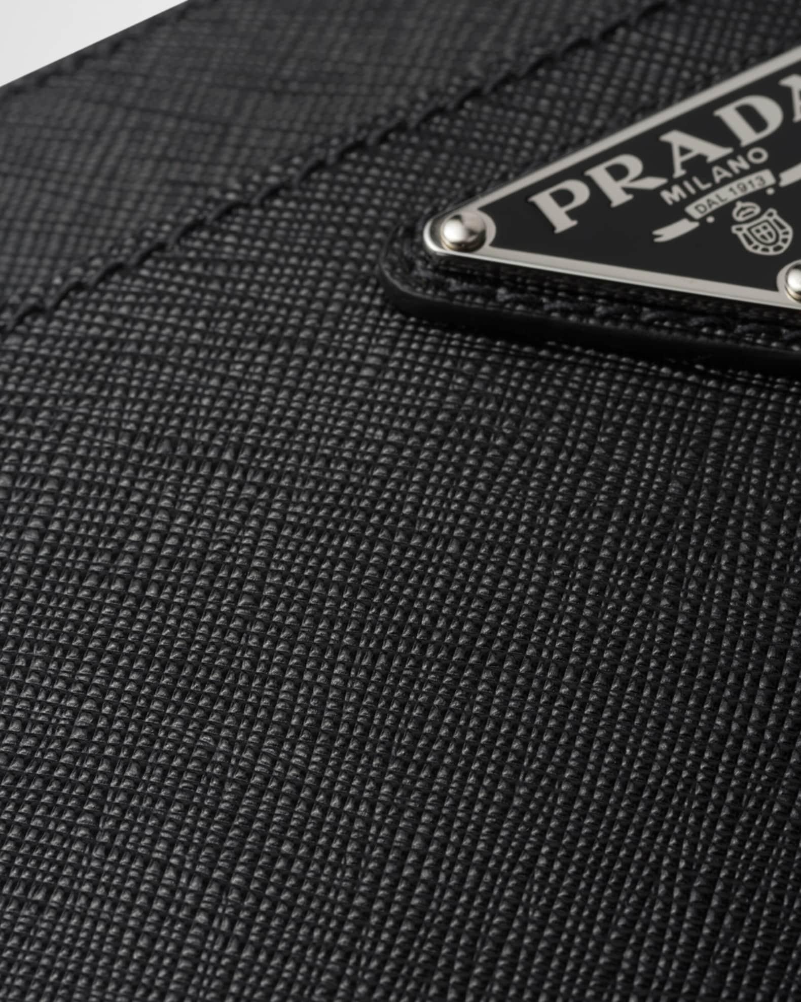 Prada compact pouch made of textured Saffiano leather Detachable wristlet strap Zip top closure Signature enameled metal triangle logo Exterior, two slip pockets with magnet closures Logo-print nylon lining Interior, six card slots and one slip pocket Approx. 6.7"H x 9.8"W x 1.6"D Imported