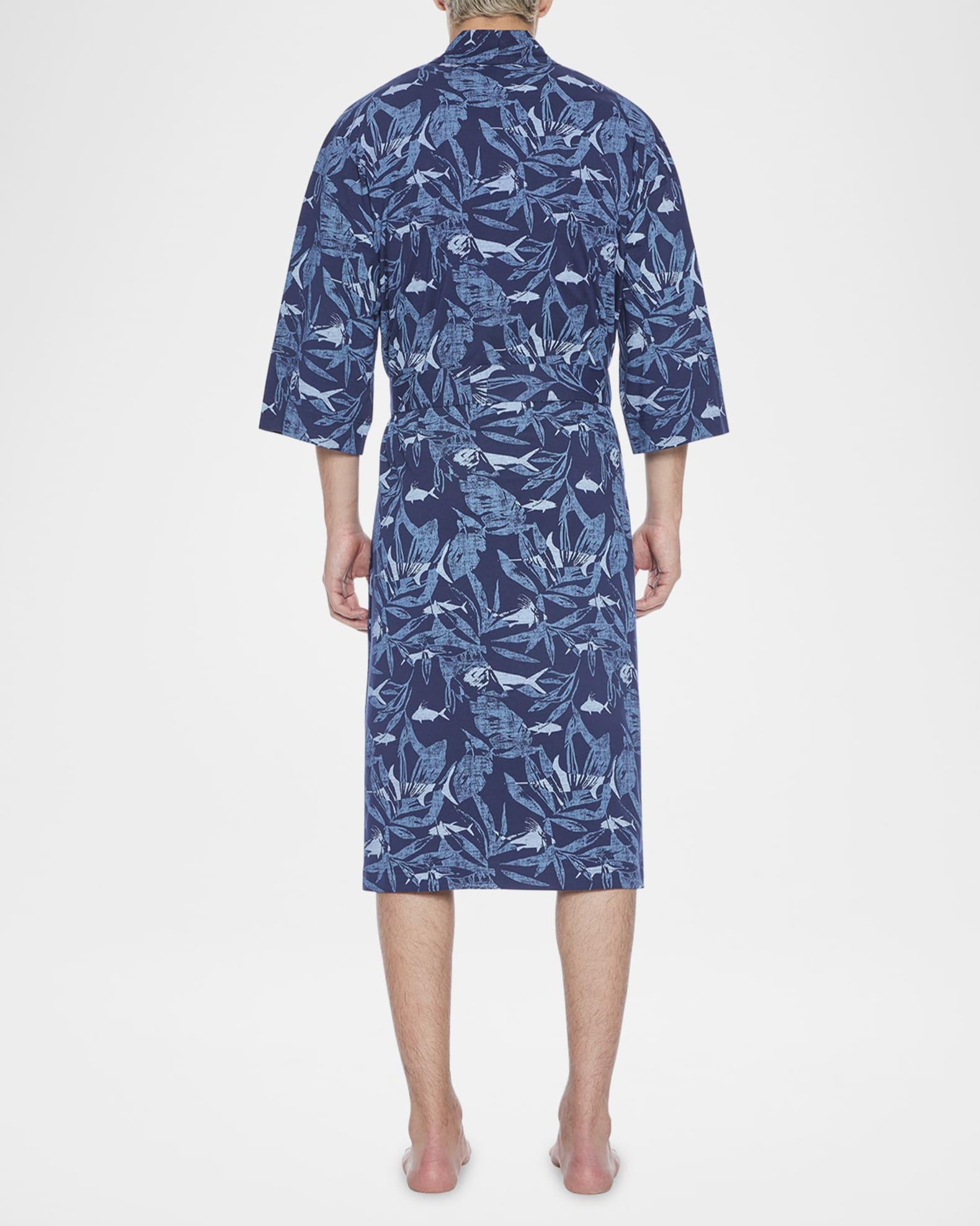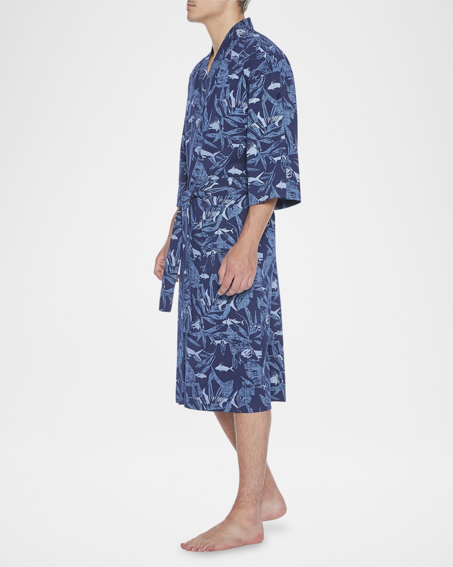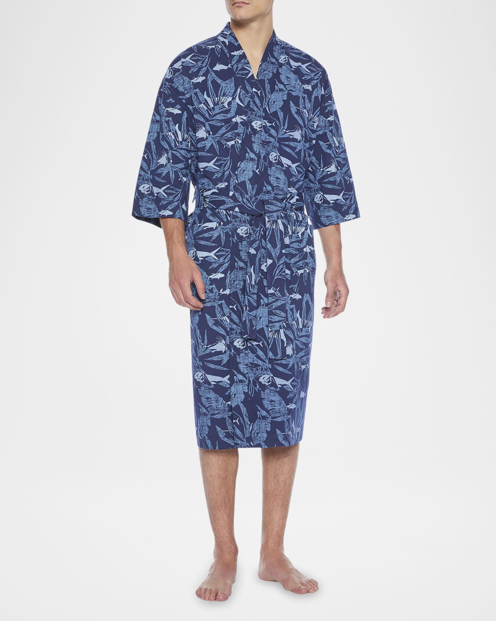Majestic International kimono in soft, lightweight knit jersey fabric woven with underwater botanicals that whisper elegance in every movement Adjustable self belt on the waist for the perfect fit Shawl lapels V-neckline Quarter sleeves Two spacious front pockets Relaxed fit Cotton/polyester Machine wash cold Imported