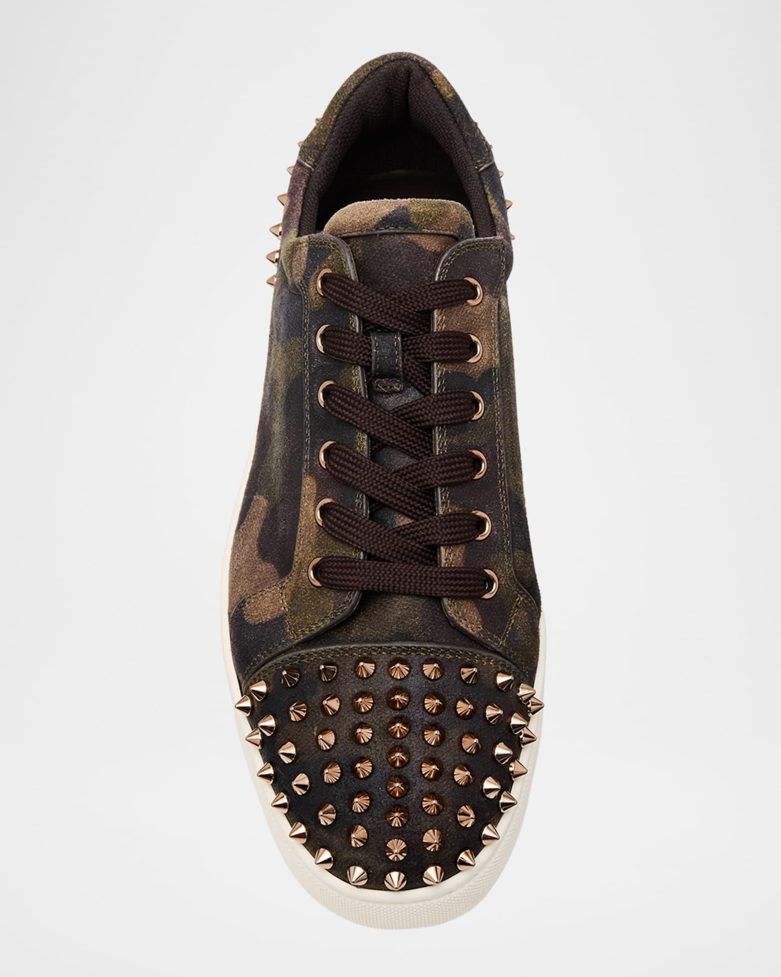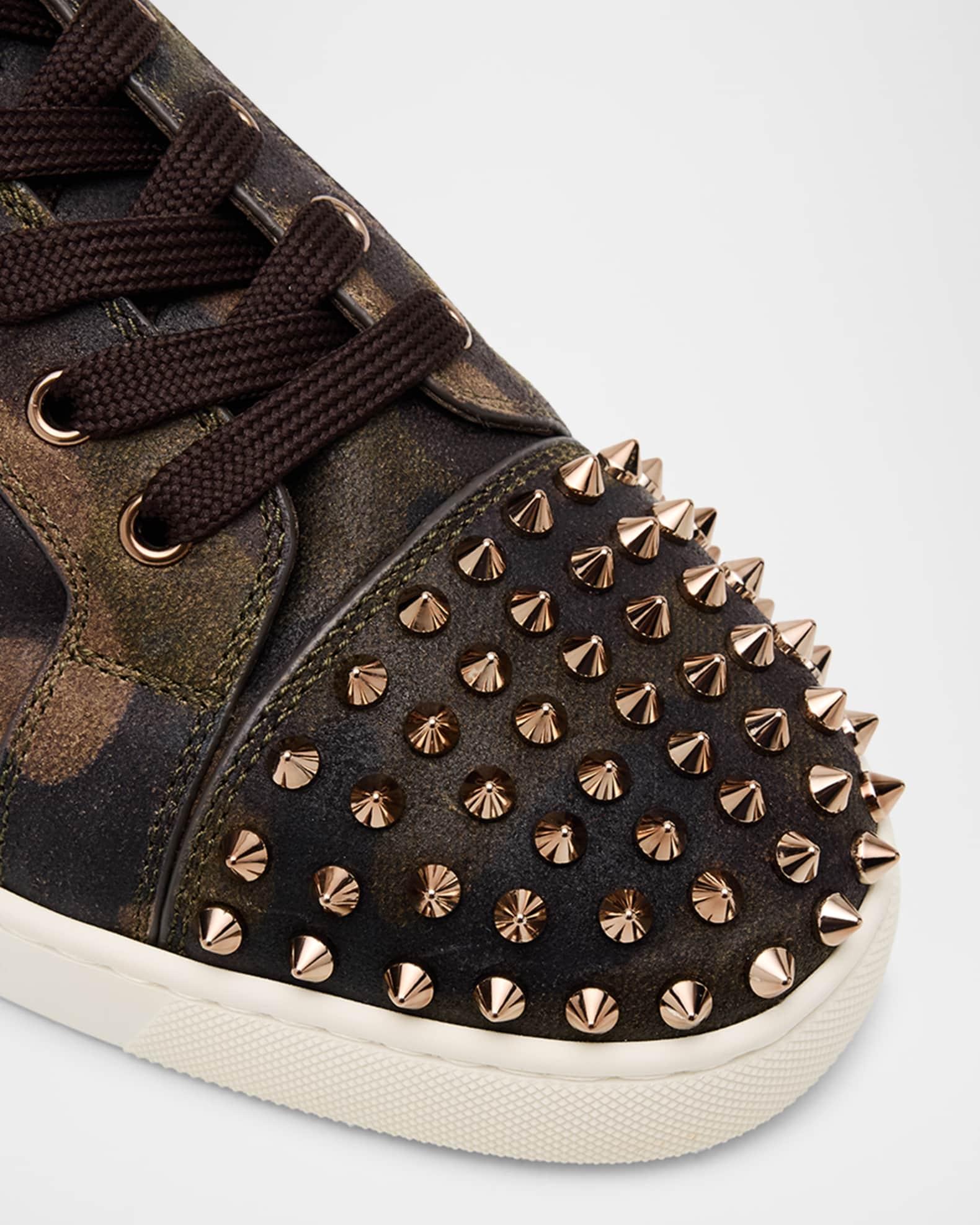 Christian Louboutin "Seavaste 2" sneakers encapsulate modern sophistication, crafted in camouflage-printed calf leather Gunmetal signature spikes on the back counter and toe make a statement with every step Flat heel Round cap toe Lace-up vamp Padded collar Rubber outsole Made in Italy