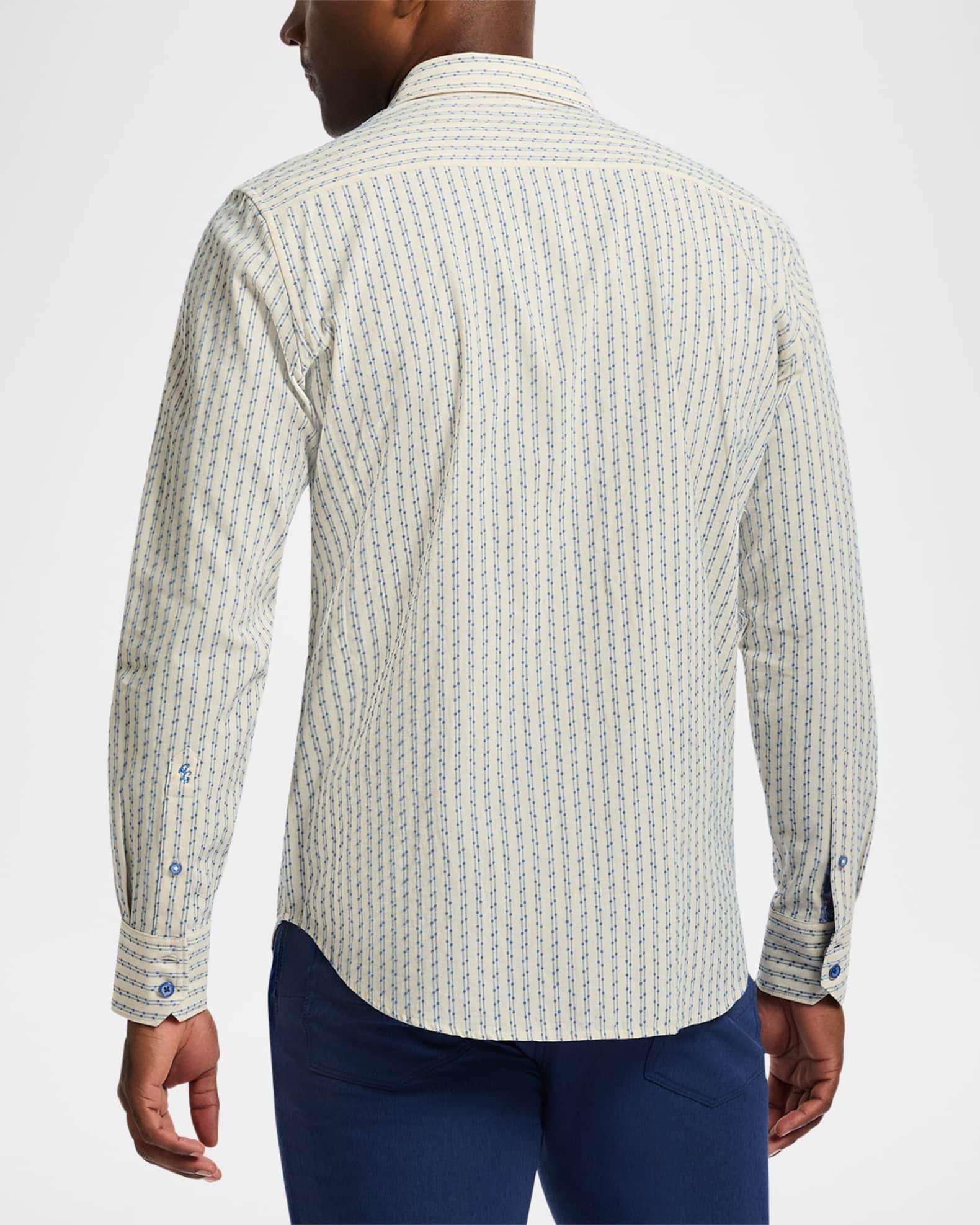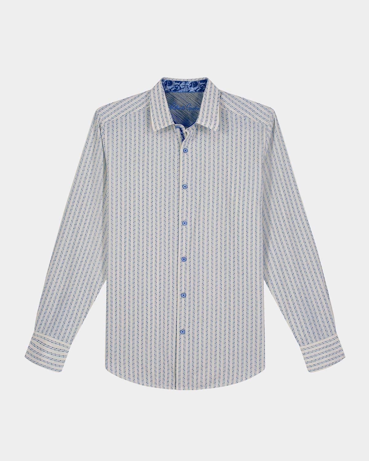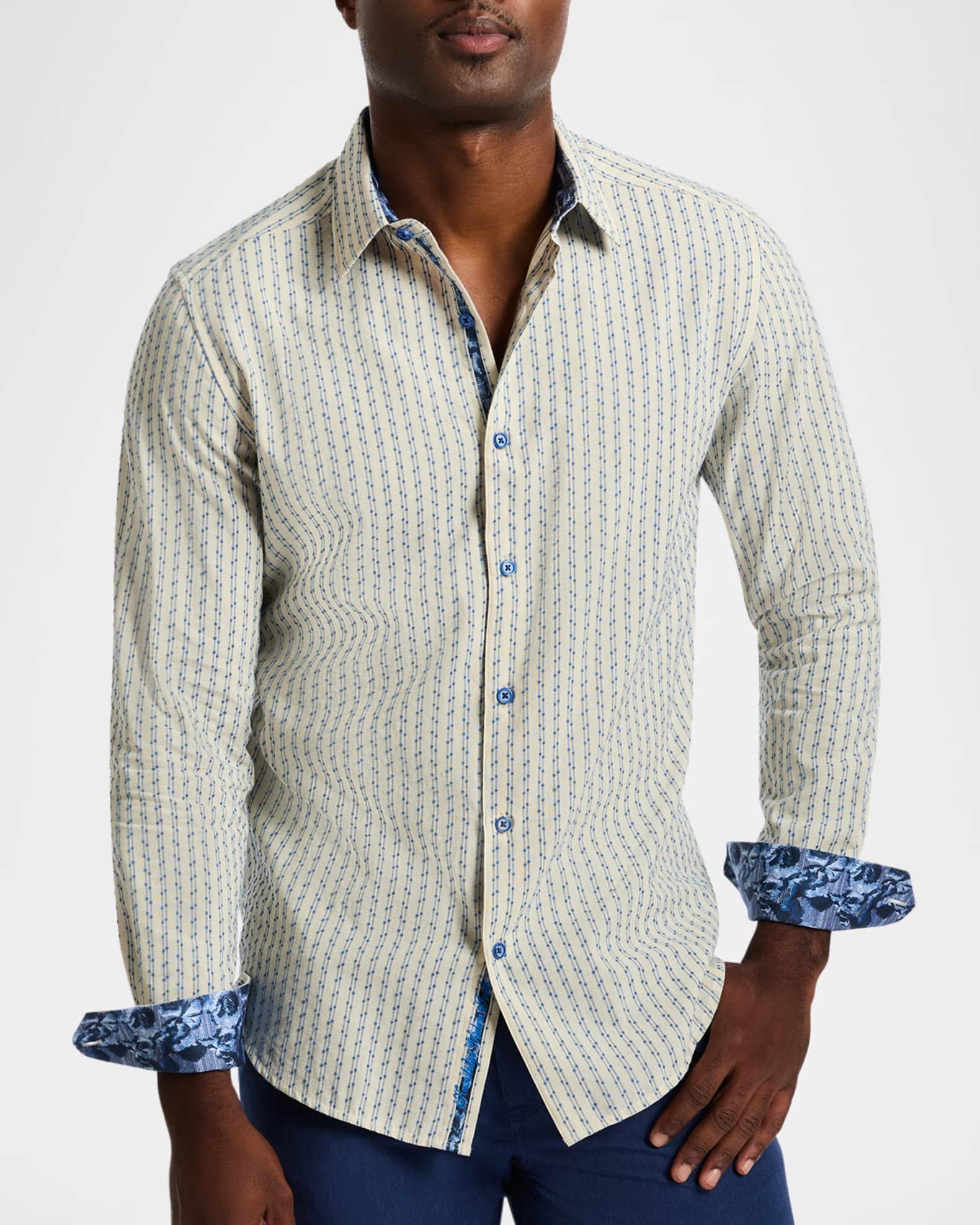 A classic button down from afar brings an unexpected appeal up close thanks to the raised texture of the allover dot yarn dye. Notice the crafty feel of this natural-hued style cut from an organic cotton and linen blend. This button down pairs perfectly with your favorite denim. Robert Graham "Senegal" sport shirt featuring a raised textured with a dot and stripe yarn dye Signature contrast print at collar and cuff Point collar Button placket Contrast piping and jacquard at inside neck Long sleeves Mitered barrel cuffs Shirttail hem Classic fit Cotton/linen Machine wash cold Imported