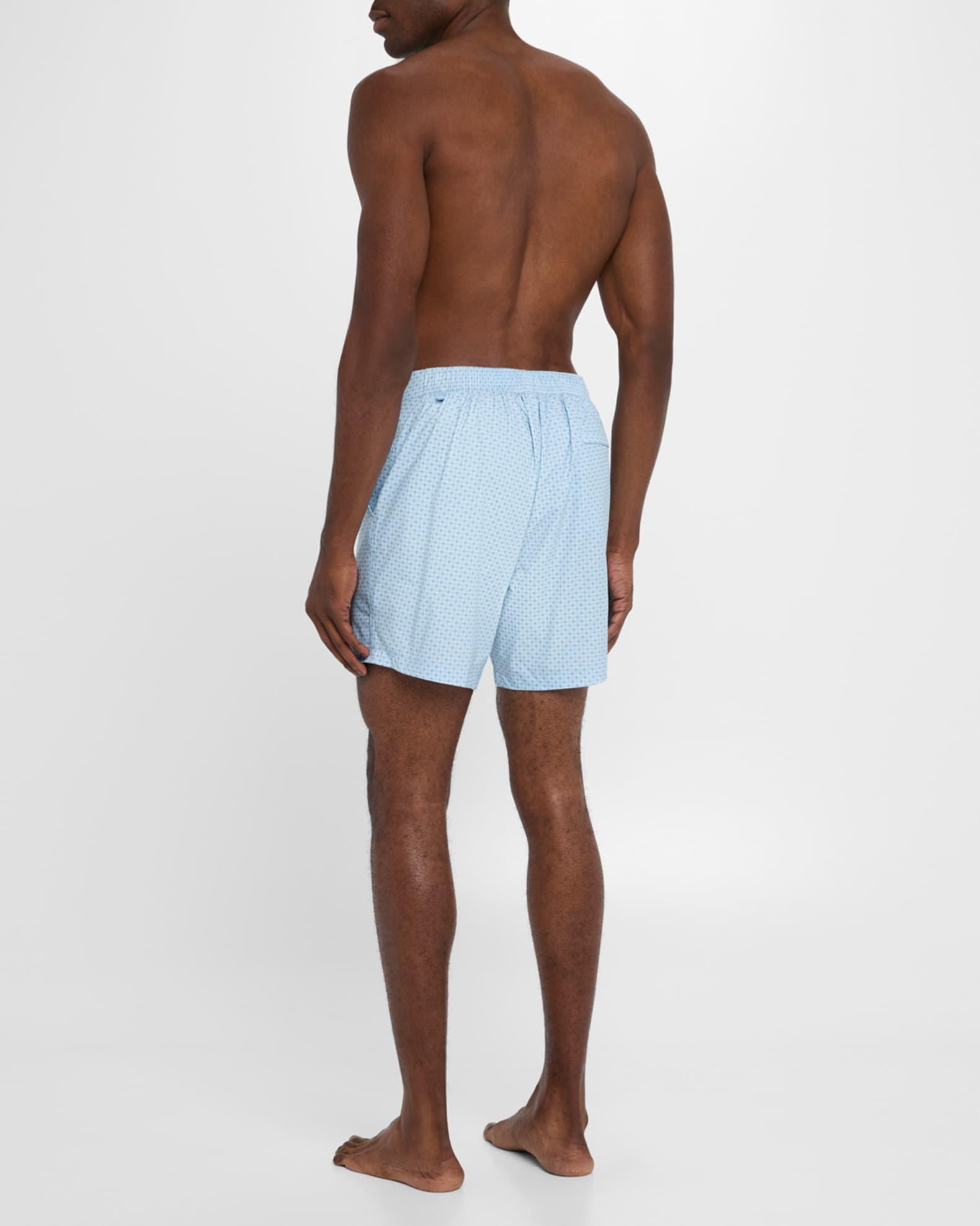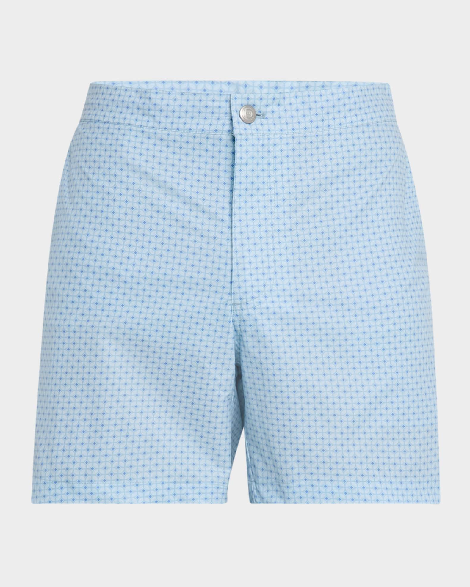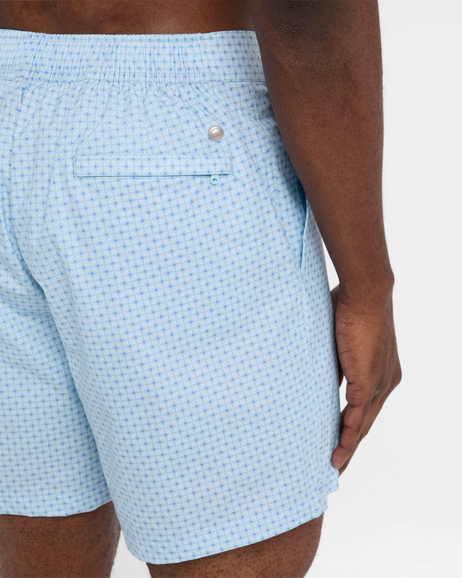 Peter Millar crown crafted swim trunks in an exceptionally soft, lightweight fabric with a vintage-inspired silhouette Approx. 6" inseam Hand-designed geometric print showcases a distinct yet understated aesthetic Regular rise Side slip pockets Back zip pocket Straight legs Classic fit Button-zip fly Elasticized back waist with interior drawcord Polyester Unlined Machine wash cold Imported