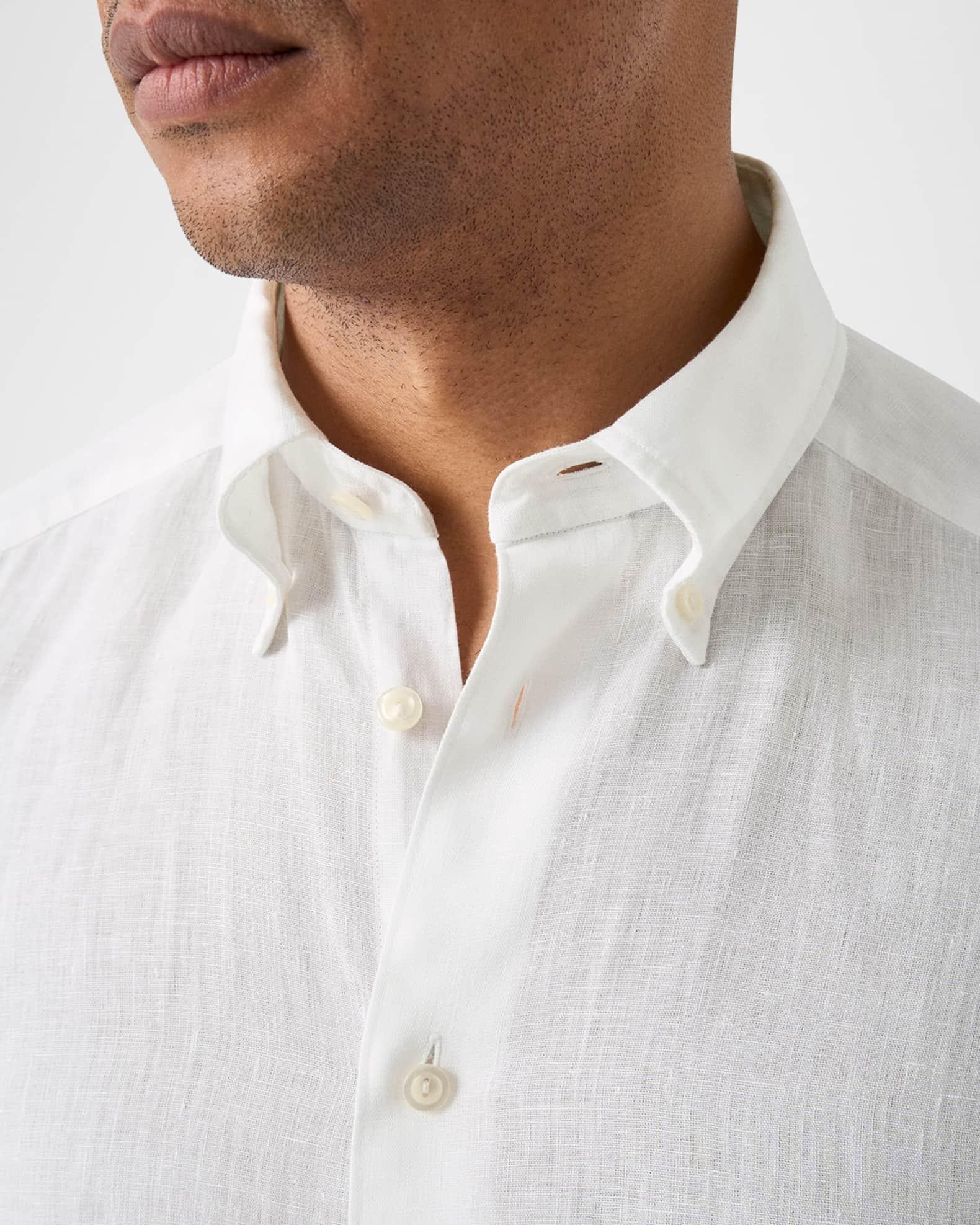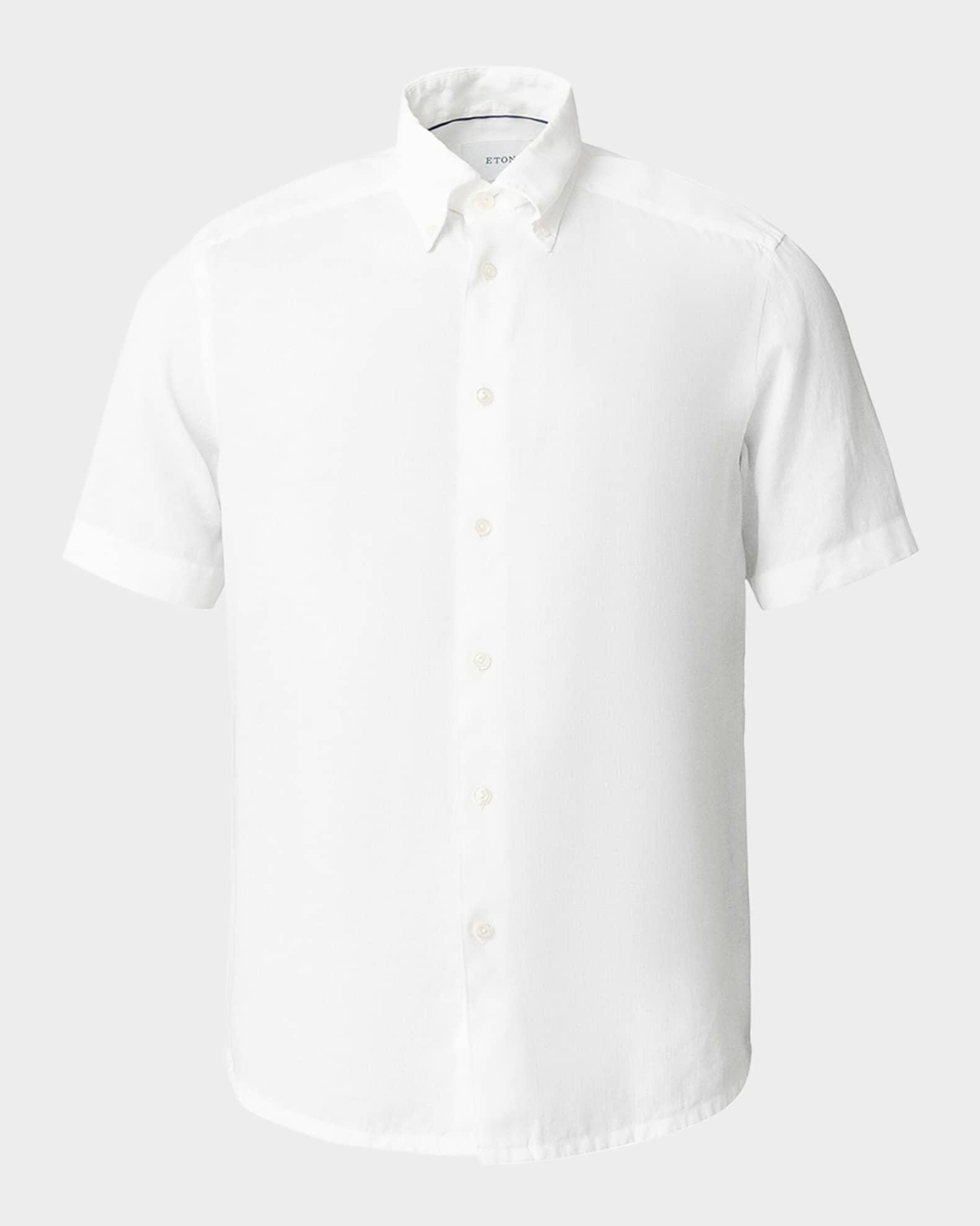 Eton solid casual buttondown shirt woven in Italy from 100% organic linen and garment washed for extra softness Buttondown collar Button placket Short sleeves Back yoke Curved hem Contemporary fit Linen Machine wash line dry Made in Romania