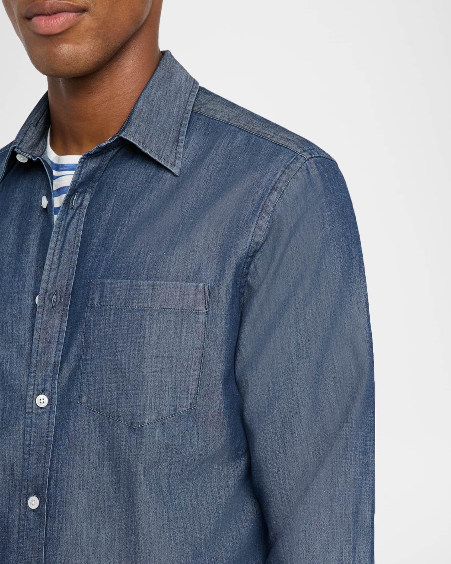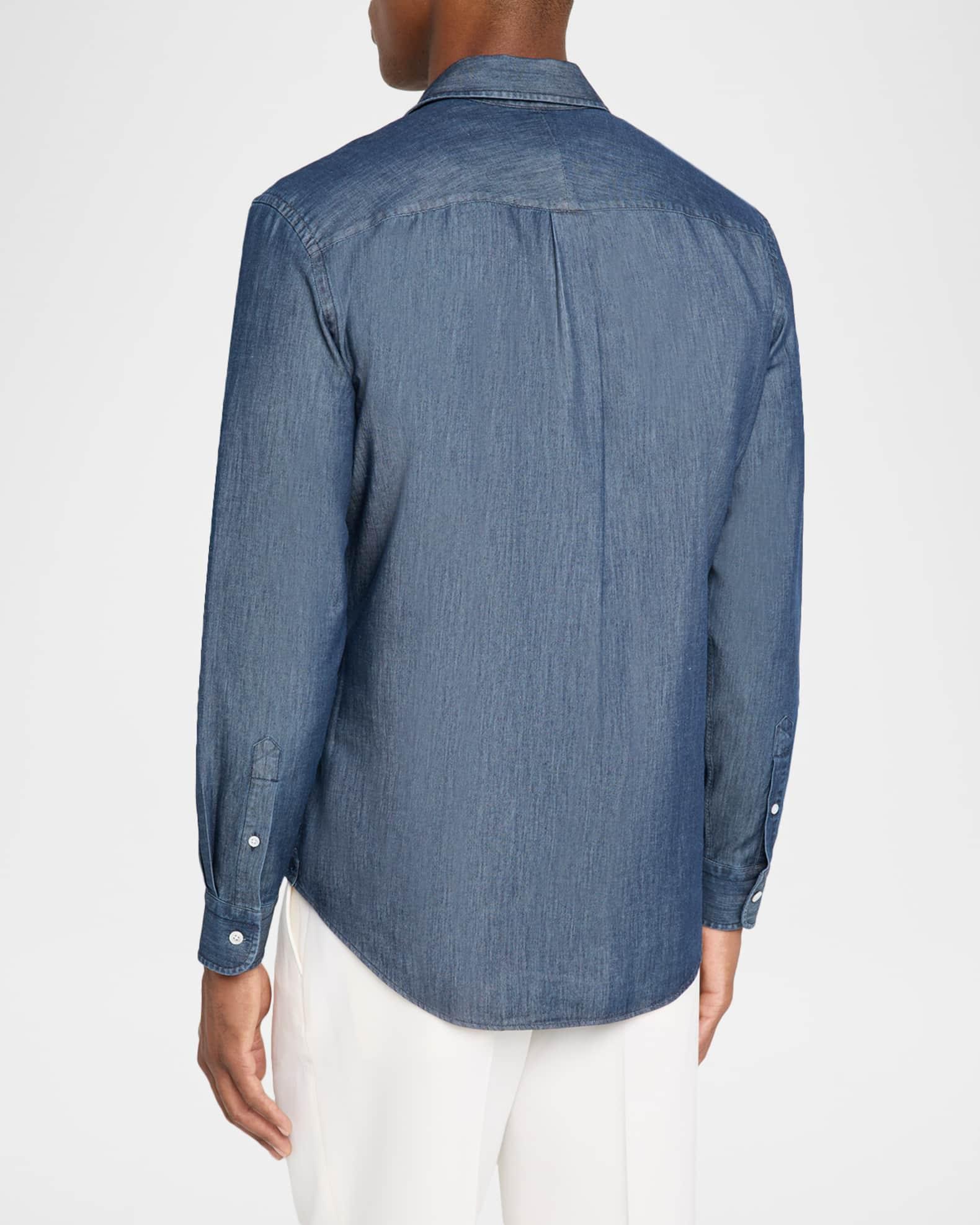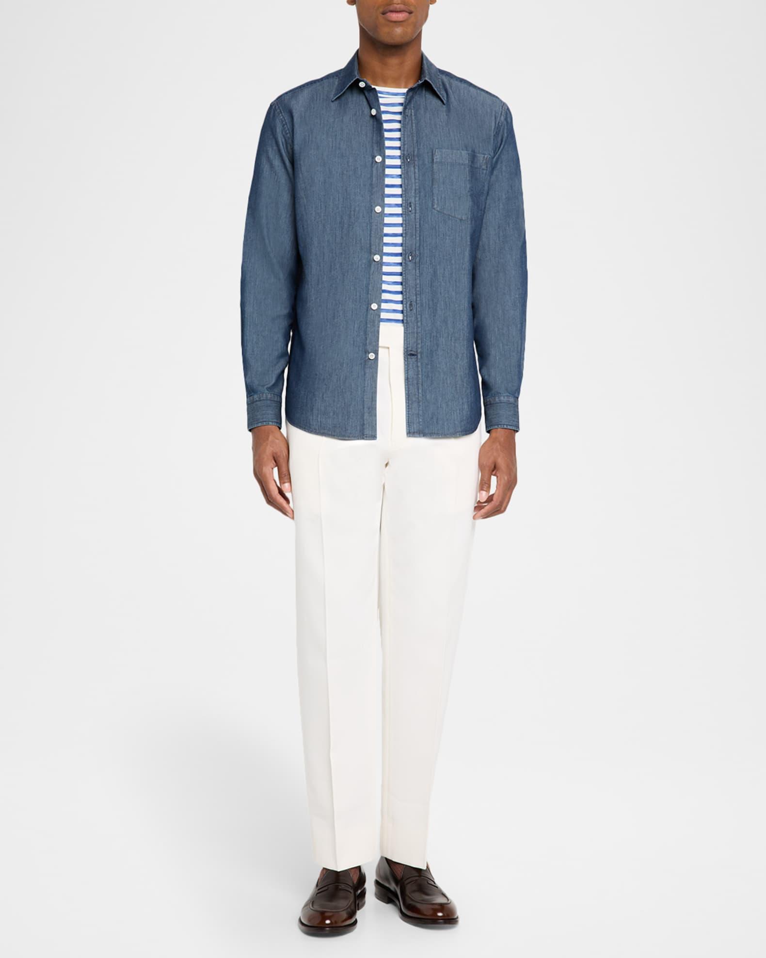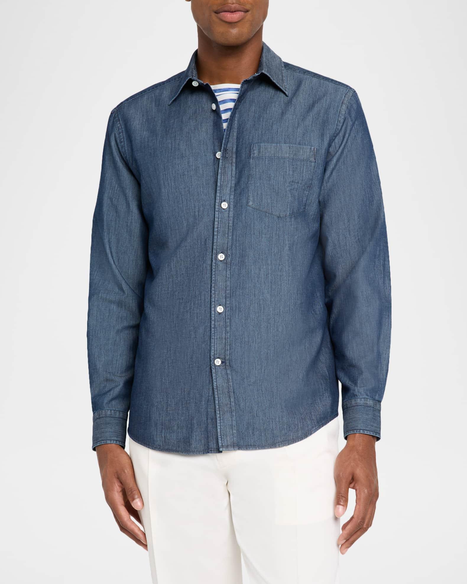 dunhill shirt with a denim look, delivered in silk-cotton chambray for a softer, more breathable alternative Spread collar; button front Long sleeves Yoked/pleated back Shirrtail hem Modern fit Mulberry silk/cotton Machine washable Made in Italy