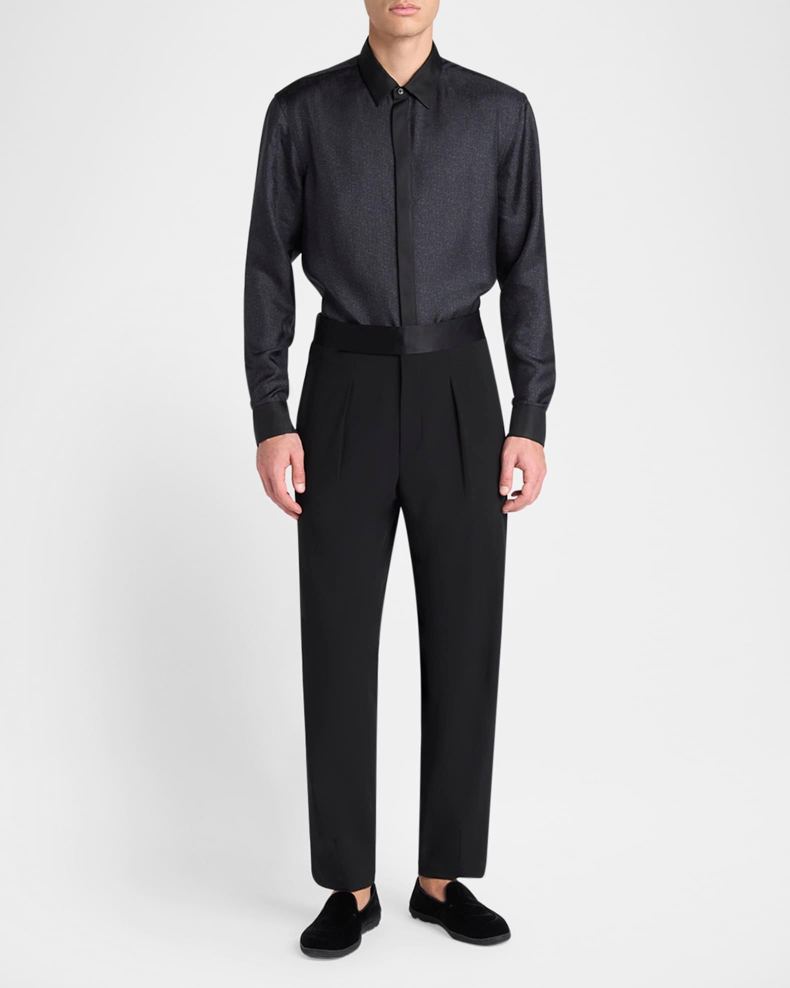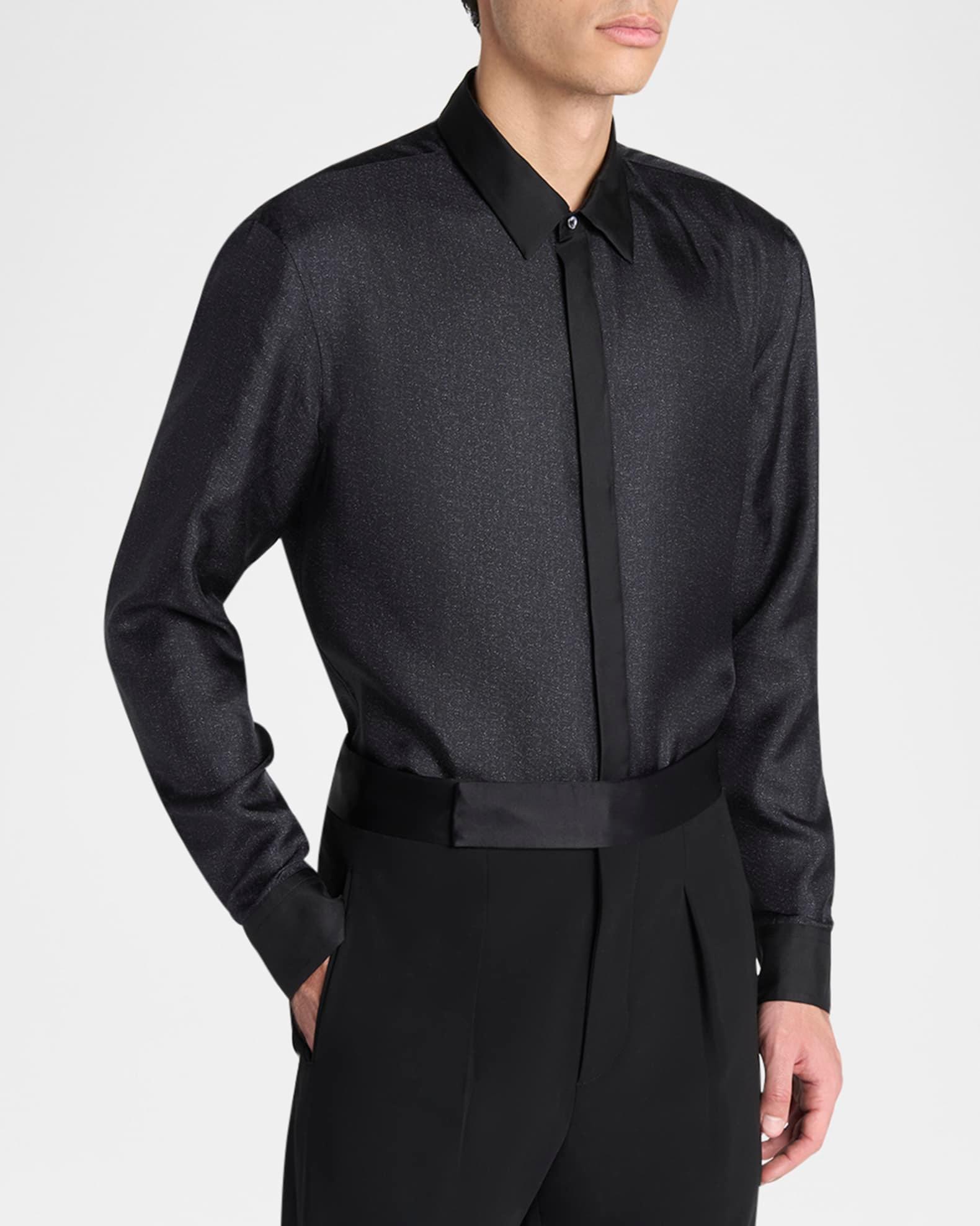Giorgio Armani formal shirt in luxe silk twill, showcasing a micro-diagonal print Point collar Concealed button placket Long sleeves Mitered barrel cuffs Shirttail hem Classic fit Silk Dry clean Made in Italy