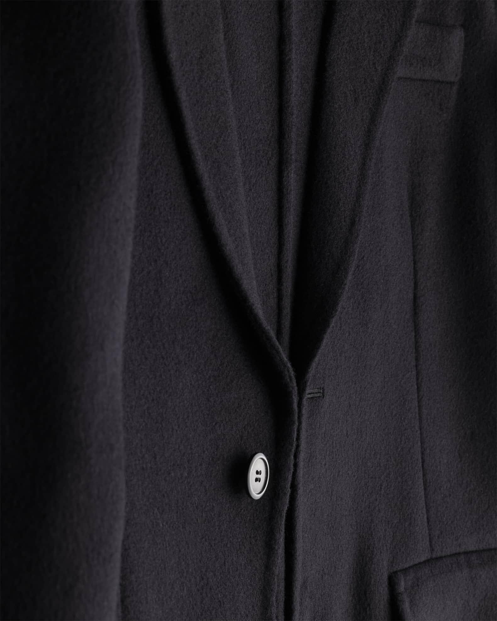 Prada jacket in double brushed cashmere with hand stitching, a fabric triangle logo, and sartorial logo label on the back Approx. 29.5"L form shoulder to hem Notch lapels; single-breasted front Long sleeves; button cuffs Chest welt pocket Hip flap pockets Straight fit Cashmere Made in Italy