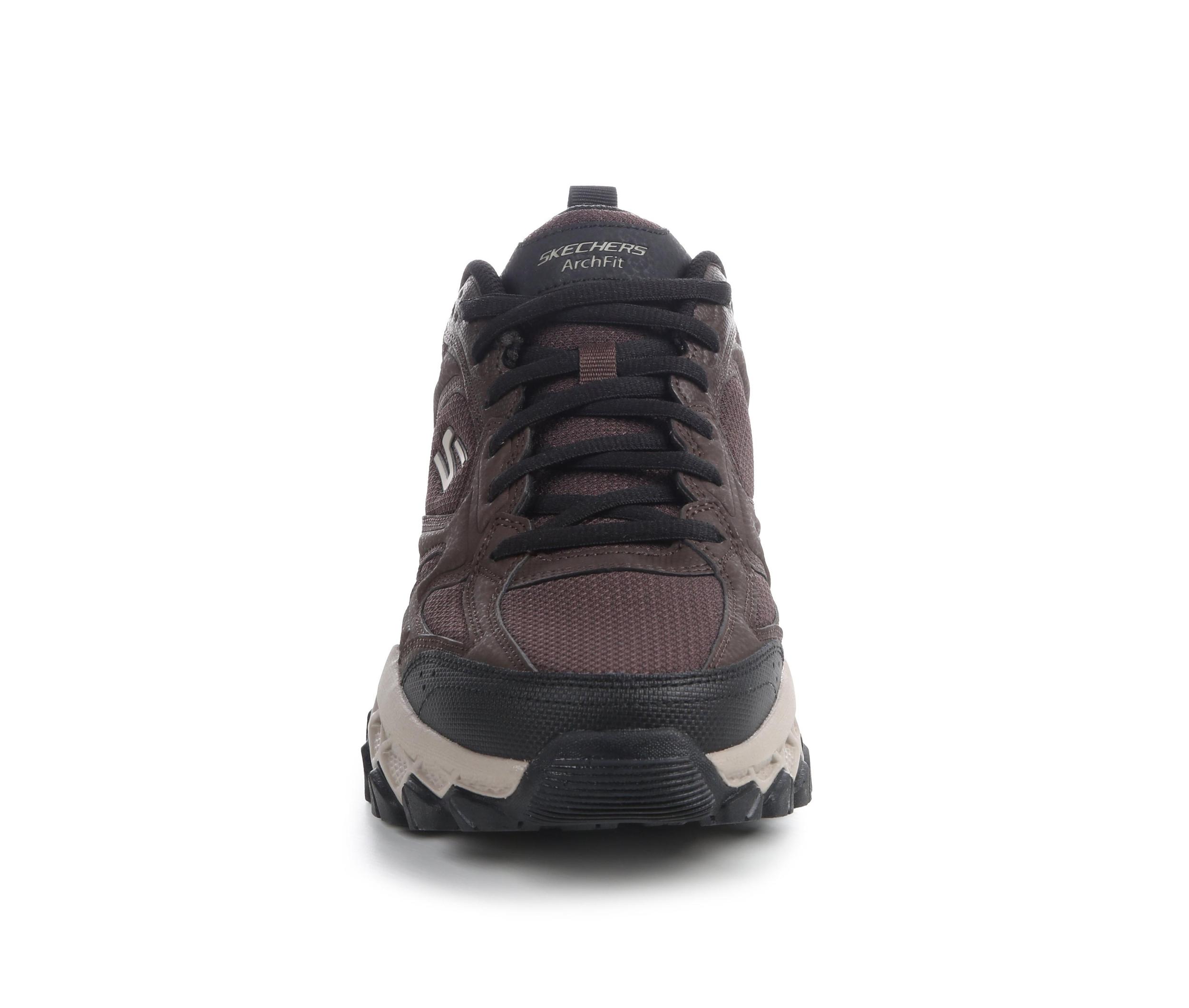 Men’s Skechers Arch Fit Akhidime - Rindge (style 237841) is a lace-up trail shoe built for outdoor walking and light trail use. It pairs a leather, synthetic, and mesh upper with a removable Arch Fit insole system and a high-traction outsole for steadier footing.
