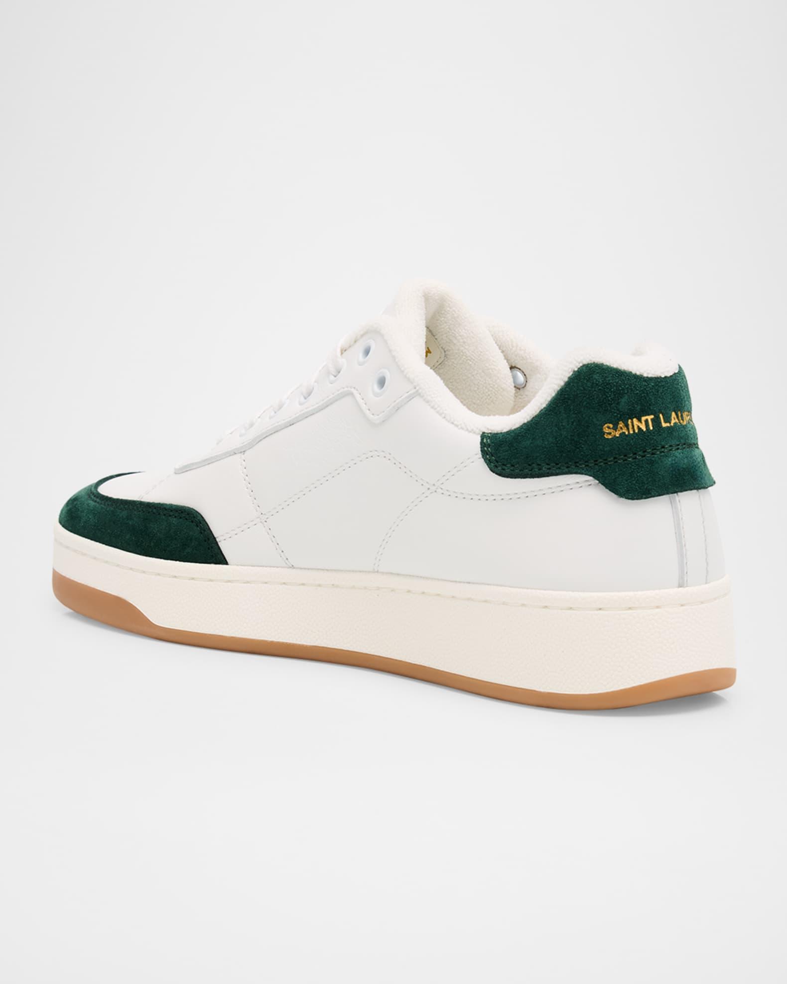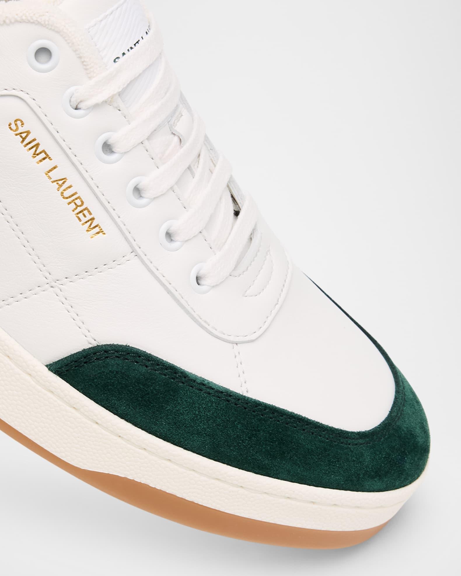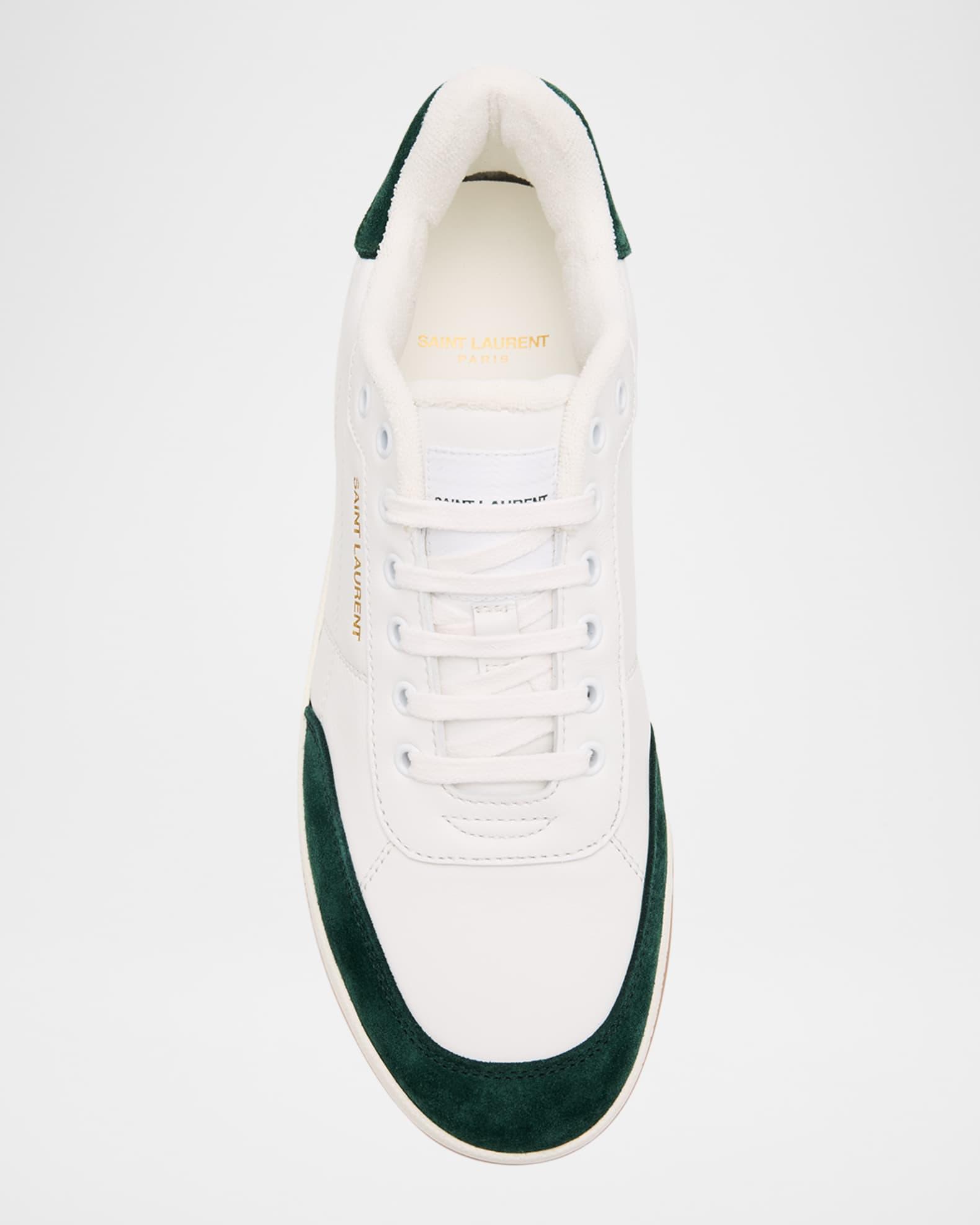 Saint Laurent low-top sneakers in smooth leather highlighted with contrasting suede Flat heel Round toe Lace-up vamp Tongue logo patch Padded collar Foiled logo on the side, backstay, and footbed Rubber outsole Made in Italy