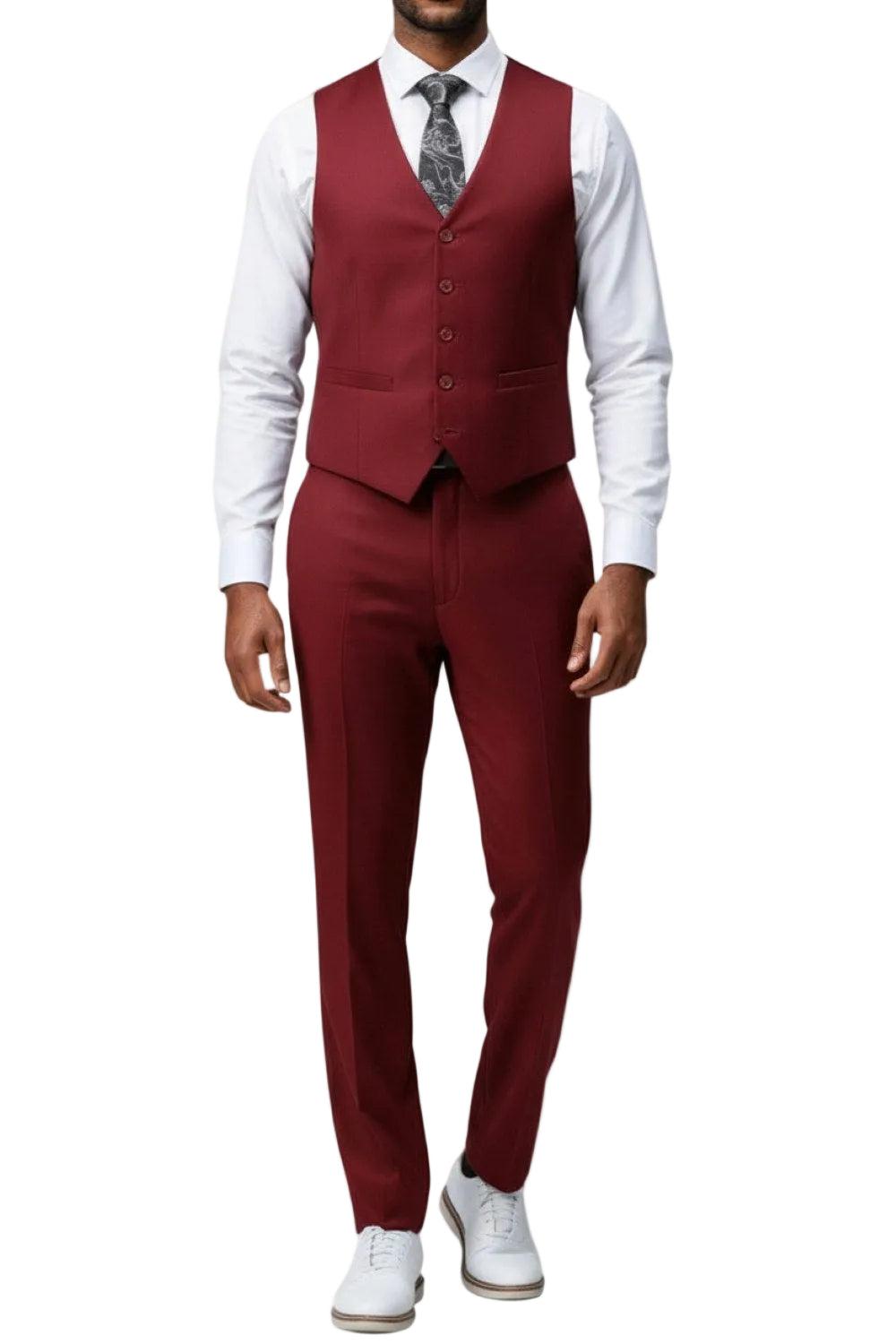 Jacket Solid Two-Button Front Closure Slim Fit Notch Lapel Side Vents Interior French Facing Two Besom Front Pockets with Flap Closure Three interior Pockets Underarm Sweat Guards Vest Solid Four-Button Closure V-Neck Pants Flat Front Two Back Besom Pockets with Button Closure Two Front Angled Slip Pockets Lined To the Knee 37 Inch Inseam Zip Fly & Extended Button Closure on Waistband